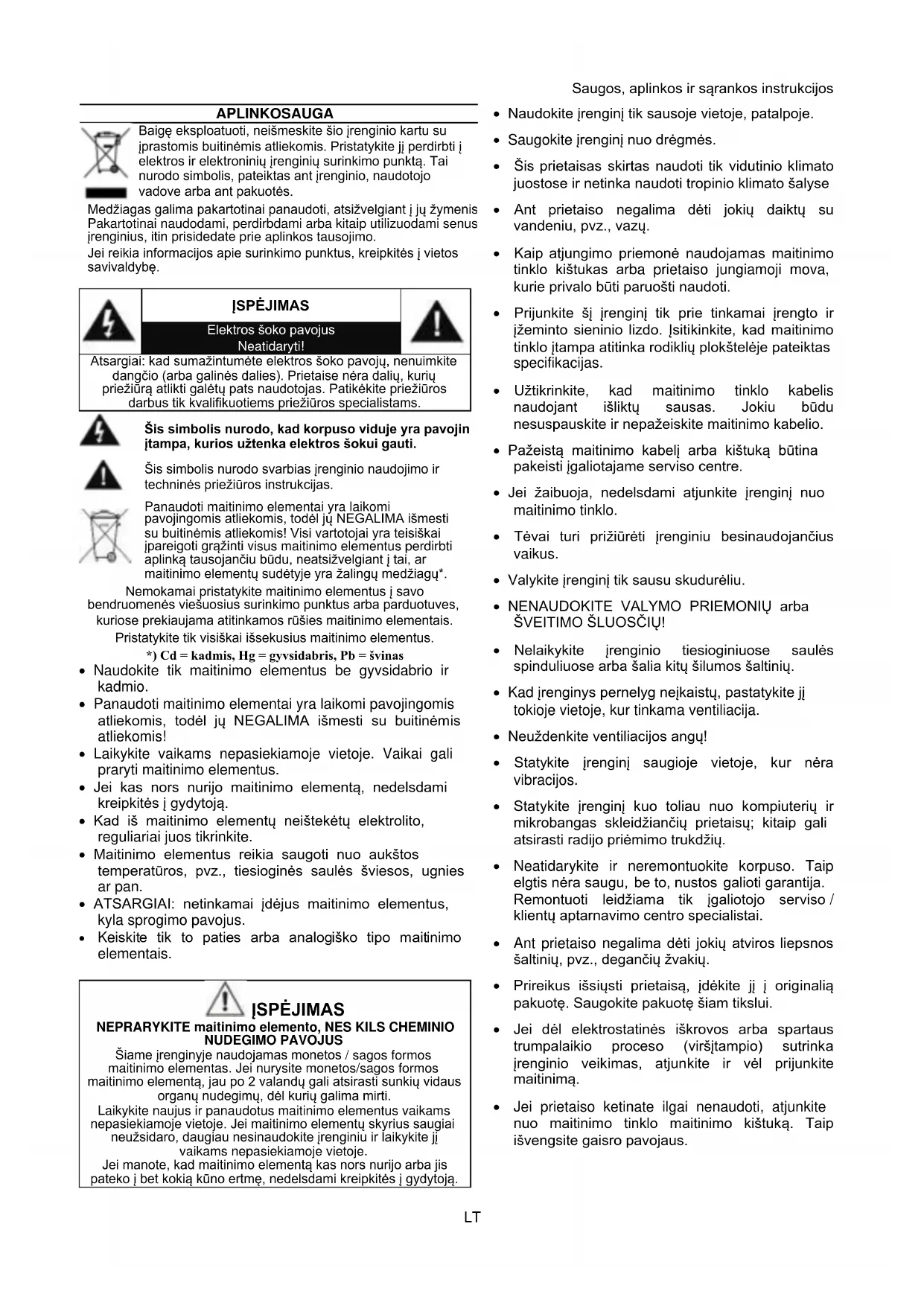 - Panaudoti maitinimo elementai yra laikomi pavojingomis atliekomis, todél ju NEGALIMA išmesti su buitinémis atliekomis!