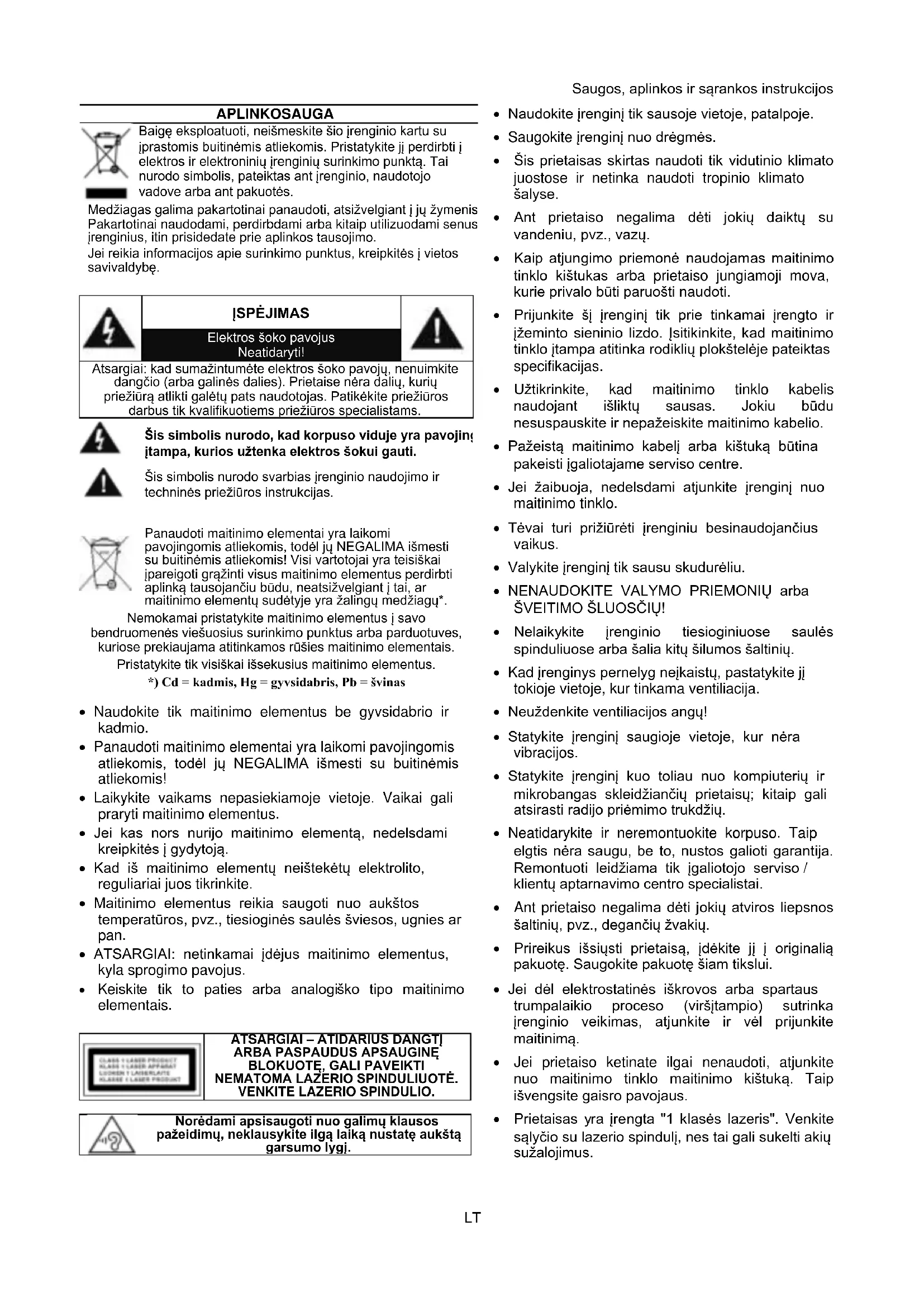 - Panaudoti maitinimo elementai yra laikomi pavojingomis atliekomis, todél ju NEGALIMA iSmesti su buitinémis atliekomis!