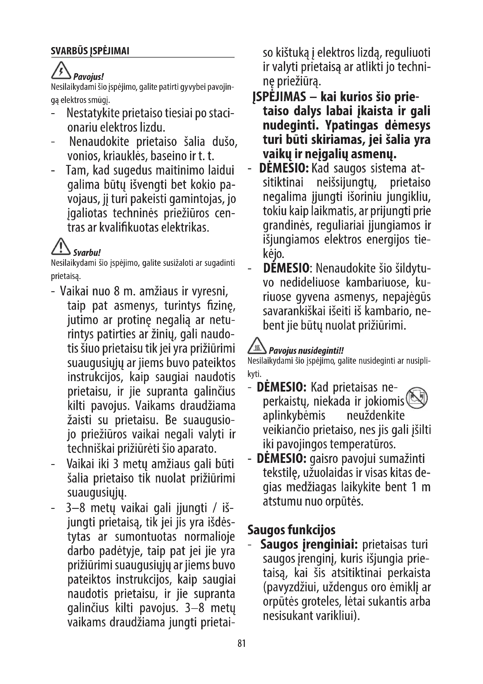 Pavojus! Nesilaikydami šio įspėjimo, galite patirti gyvybei pavojin- gą elektros smūgį. - Nestatykite prietaiso tiesiai po staci- onariu elektros lizdu. - Nenaudokite prietaiso šalia dušo, vonios, kriauklės, baseino ir t. t. - Tam, kad sugedus maitinimo laidui galima būtų išvengti bet kokio pa- vojaus, jį turi pakeisti gamintojas, jo įgaliotas techninės priežiūros cen- tras ar kvalikuotas elektrikas. Svarbu! Nesilaikydami šio įspėjimo, galite susižaloti ar sugadinti prietaisą. - Vaikai nuo 8 m. amžiaus ir vyresni, taip pat asmenys, turintys zinę, jutimo ar protinę negalią ar netu- rintys patirties ar žinių, gali naudo- tis šiuo prietaisu tik jei yra prižiūrimi suaugusiųjų ar jiems buvo pateiktos instrukcijos, kaip saugiai naudotis prietaisu, ir jie supranta galinčius kilti pavojus. Vaikams draudžiama žaisti su prietaisu. Be suaugusio- jo priežiūros vaikai negali valyti ir techniškai prižiūrėti šio aparato. - Vaikai iki 3 metų amžiaus gali būti šalia prietaiso tik nuolat prižiūrimi suaugusiųjų. - 3–8 metų vaikai gali įjungti / iš- jungti prietaisą, tik jei jis yra išdės- tytas ar sumontuotas normalioje darbo padėtyje, taip pat jei jie yra prižiūrimi suaugusiųjų ar jiems buvo pateiktos instrukcijos, kaip saugiai naudotis prietaisu, ir jie supranta galinčius kilti pavojus. 3–8 metų vaikams draudžiama jungti prietai- so kištuką į elektros lizdą, reguliuoti ir valyti prietaisą ar atlikti jo techni- nę priežiūrą. ĮSPĖJIMAS – kai kurios šio prie- taiso dalys labai įkaista ir gali nudeginti. Ypatingas dėmesys turi būti skiriamas, jei šalia yra vaikų ir neįgalių asmenų. - DĖMESIO: Kad saugos sistema at- sitiktinai neišsijungtų, prietaiso negalima įjungti išoriniu jungikliu, tokiu kaip laikmatis, ar prijungti prie grandinės, reguliariai įjungiamos ir išjungiamos elektros energijos tie- kėjo. - DĖMESIO: Nenaudokite šio šildytu- vo nedideliuose kambariuose, ku- riuose gyvena asmenys, nepajėgūs savarankiškai išeiti iš kambario, ne- bent jie būtų nuolat prižiūrimi. Pavojus nusideginti!! Nesilaikydami šio įspėjimo, galite nusideginti ar nusipli- kyti. - DĖMESIO: Kad prietaisas ne- perkaistų, niekada ir jokiomis aplinkybėmis neuždenkite veikiančio prietaiso, nes jis gali įšilti iki pavojingos temperatūros. - DĖMESIO: gaisro pavojui sumažinti tekstilę, užuolaidas ir visas kitas de- gias medžiagas laikykite bent 1 m atstumu nuo orpūtės. Saugos funkcijos - Saugos įrenginiai: prietaisas turi saugos įrenginį, kuris išjungia prie- taisą, kai šis atsitiktinai perkaista (pavyzdžiui, uždengus oro ėmiklį ar orpūtės groteles, lėtai sukantis arba nesisukant varikliui).82 Norėdami įjungti prietaisą iš nau- jo, išjunkite jį iš elektros lizdo, pa- laukite keletą minučių, pašalinkite perkaitimo priežastį ir vėl įjunkite jį į elektros lizdą. Jei prietaisas nevei- kia, susisiekite su „De‘Longhi“ var- totojų pagalbos tarnyba. - Apsauga nuo apsivertimo: Kai kurie modeliai turi specialų jungiklį, kuris išjungia prietaisą šiam nukri- tus. Norėdami iš naujo paleisti prie- taisą, tiesiog pastatykite jį tiesiai. Atkreipkite dėmesį: Šis simbolis pateikia rekomendacijas ir vartotojui svarbią informaciją. - Naudokite šildytuvą ant horizonta- laus ir tvirto paviršiaus. - Prietaisą naudokite tik vertikaliai. - Nenaudokite prietaiso, jei jis nukri- to. - Nenaudokite prietaiso, jei yra aki- vaizdžių pažeidimo požymių. - Nerekomenduojama naudoti ilgina- mųjų laidų. Kita vertus, jei tai yra būtina, vado- vaukitės ilginamojo laido instrukci- jomis ir niekada neviršykite galios ribų, nurodytų ant ilginamojo laido. - Nenaudokite prietaiso šalia sienų, baldų, užuolaidų ir t. t. - Nenaudokite prietaiso kambariuo- se, kurių plotas yra mažesnis nei 4