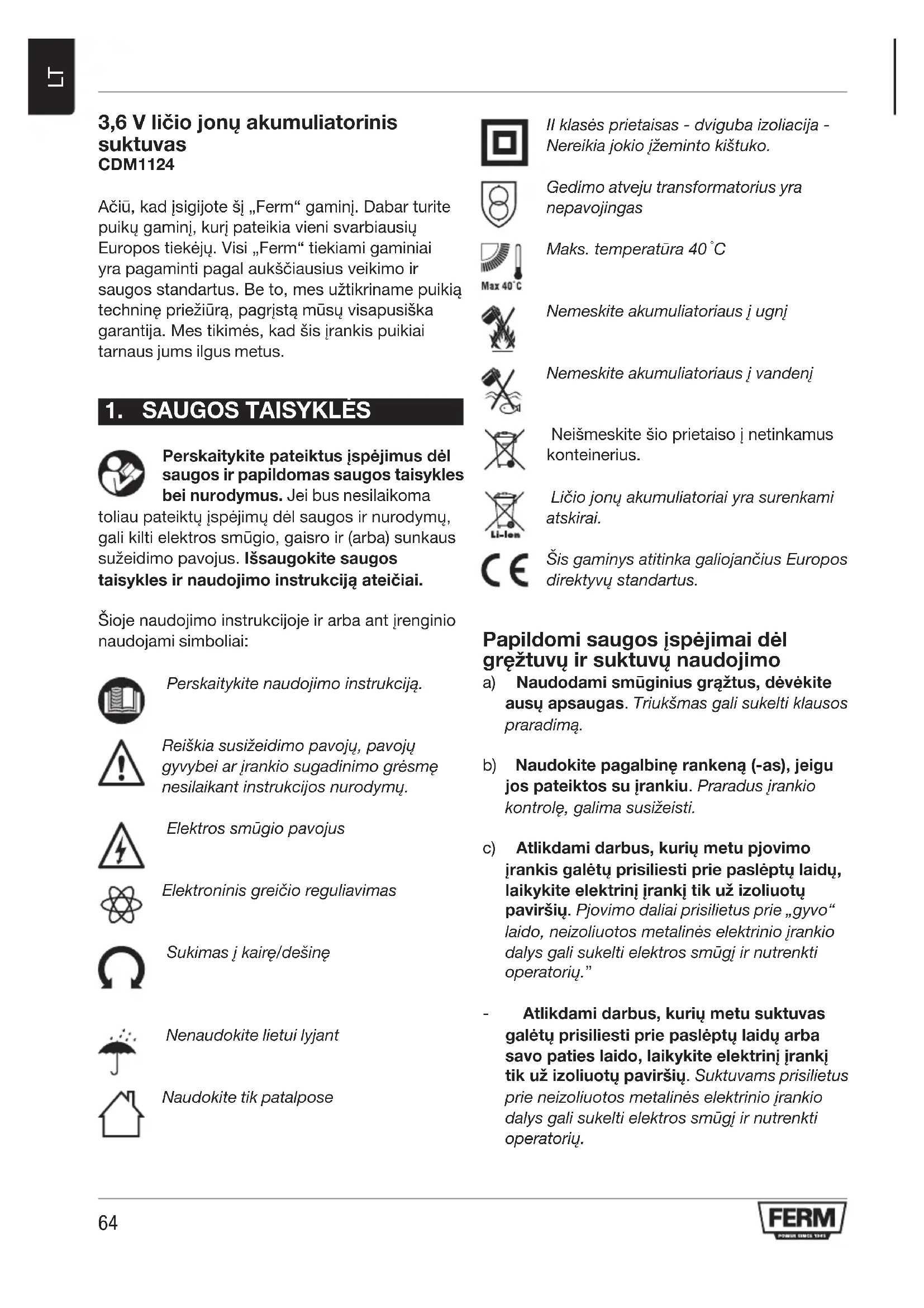 3,6 V ličio jonų akumuliatorinis suktuvas CDM1124 Ačiū,kadįsigijotešį„Ferm“gaminį.Dabarturite puikųgaminį,kurįpateikiavienisvarbiausių Europostiekėjų.Visi„Ferm“tiekiamigaminiai yrapagamintipagalaukščiausiusveikimoir saugosstandartus.Beto,mesužtikrinamepuikią techninępriežiūrą,pagrįstąmūsųvisapusiška garantija.Mestikimės,kadšisįrankispuikiai tarnaus jums ilgus metus.
