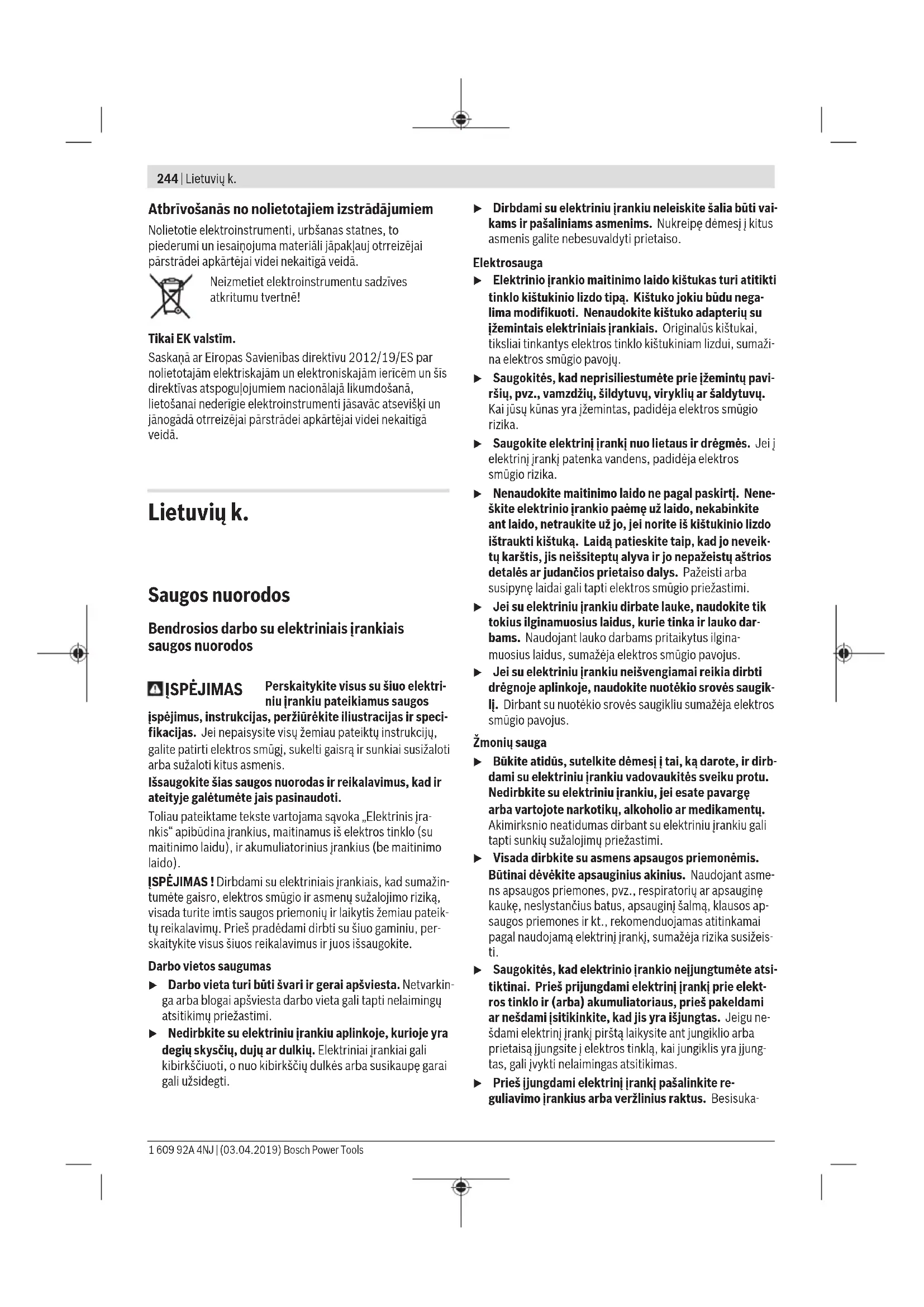 Ūdens spiedientvertne 2 609 390 308 Adapteris G1/2" 2 608 598 043 Vakuumsūcējs mitrajai un sausajai uzsūkšanai GAS35MAFC Vakuumsūcējs mitrajai un sausajai uzsūkšanai GAS55MAFC Klientu apkalpošanas dienests un konsultācijas par lietošanu Klientu apkalpošanas dienests atbildēs uz Jūsu jautājumiem par izstrādājumu remontu un apkalpošanu, kā arī par to rezerves daļām. Kopsalikuma attēlus un informāciju par rezerves daļām Jūs varat atrast interneta vietnē: www.bosch-pt.com Bosch konsultantu grupa palīdzēs Jums vislabākajā veidā rast atbildes uz jautājumiem par mūsu izstrādājumiem un to piederumiem. Pieprasot konsultācijas un pasūtot rezerves daļas, noteikti paziņojiet 10 zīmju izstrādājuma numuru, kas norādīts uz izstrādājuma marķējuma plāksnītes. Latvijas Republika Robert Bosch SIA Bosch elektroinstrumentu servisa centrs Mūkusalas ielā 97 LV-1004 Rīga Tālr.: 67146262 Telefakss: 67146263 E-pasts: service-pt@lv.bosch.com Bosch Power Tools 1 609 92A 4NJ | (03.04.2019)244 | Lietuvių k. Atbrīvošanās no nolietotajiem izstrādājumiem Nolietotie elektroinstrumenti, urbšanas statnes, to piederumi un iesaiņojuma materiāli jāpakļauj otrreizējai pārstrādei apkārtējai videi nekaitīgā veidā. Neizmetiet elektroinstrumentu sadzīves atkritumu tvertnē! Tikai EK valstīm. Saskaņā ar Eiropas Savienības direktīvu 2012/19/ES par nolietotajām elektriskajām un elektroniskajām ierīcēm un šīs direktīvas atspoguļojumiem nacionālajā likumdošanā, lietošanai nederīgie elektroinstrumenti jāsavāc atsevišķi un jānogādā otrreizējai pārstrādei apkārtējai videi nekaitīgā veidā. Lietuvių k. Saugos nuorodos Bendrosios darbo su elektriniais įrankiais saugos nuorodos ĮSPĖJIMAS Perskaitykite visus su šiuo elektri- niu įrankiu pateikiamus saugos įspėjimus, instrukcijas, peržiūrėkite iliustracijas ir speci- fikacijas. Jei nepaisysite visų žemiau pateiktų instrukcijų, galite patirti elektros smūgį, sukelti gaisrą ir sunkiai susižaloti arba sužaloti kitus asmenis. Išsaugokite šias saugos nuorodas ir reikalavimus, kad ir ateityje galėtumėte jais pasinaudoti. Toliau pateiktame tekste vartojama sąvoka „Elektrinis įra- nkis“ apibūdina įrankius, maitinamus iš elektros tinklo (su maitinimo laidu), ir akumuliatorinius įrankius (be maitinimo laido). ĮSPĖJIMAS ! Dirbdami su elektriniais įrankiais, kad sumažin- tumėte gaisro, elektros smūgio ir asmenų sužalojimo riziką, visada turite imtis saugos priemonių ir laikytis žemiau pateik- tų reikalavimų. Prieš pradėdami dirbti su šiuo gaminiu, per- skaitykite visus šiuos reikalavimus ir juos išsaugokite. Darbo vietos saugumas u Darbo vieta turi būti švari ir gerai apšviesta. Netvarkin- ga arba blogai apšviesta darbo vieta gali tapti nelaimingų atsitikimų priežastimi. u Nedirbkite su elektriniu įrankiu aplinkoje, kurioje yra degių skysčių, dujų ar dulkių. Elektriniai įrankiai gali kibirkščiuoti, o nuo kibirkščių dulkės arba susikaupę garai gali užsidegti. u Dirbdami su elektriniu įrankiu neleiskite šalia būti vai- kams ir pašaliniams asmenims. Nukreipę dėmesį į kitus asmenis galite nebesuvaldyti prietaiso. Elektrosauga u Elektrinio įrankio maitinimo laido kištukas turi atitikti tinklo kištukinio lizdo tipą. Kištuko jokiu būdu nega- lima modifikuoti. Nenaudokite kištuko adapterių su įžemintais elektriniais įrankiais. Originalūs kištukai, tiksliai tinkantys elektros tinklo kištukiniam lizdui, sumaži- na elektros smūgio pavojų. u Saugokitės, kad neprisiliestumėte prie įžemintų pavi- ršių, pvz., vamzdžių, šildytuvų, viryklių ar šaldytuvų. Kai jūsų kūnas yra įžemintas, padidėja elektros smūgio rizika. u Saugokite elektrinį įrankį nuo lietaus ir drėgmės. Jei į elektrinį įrankį patenka vandens, padidėja elektros smūgio rizika. u Nenaudokite maitinimo laido ne pagal paskirtį. Nene- škite elektrinio įrankio paėmę už laido, nekabinkite ant laido, netraukite už jo, jei norite iš kištukinio lizdo ištraukti kištuką. Laidą patieskite taip, kadjo neveik- tų karštis, jis neišsiteptų alyva ir jo nepažeistų aštrios detalės ar judančios prietaiso dalys. Pažeisti arba susipynę laidai gali tapti elektros smūgio priežastimi. u Jei su elektriniu įrankiu dirbate lauke, naudokite tik tokius ilginamuosius laidus, kurie tinka ir lauko dar- bams. Naudojant lauko darbams pritaikytus ilgina- muosius laidus, sumažėja elektros smūgio pavojus. u Jei su elektriniu įrankiu neišvengiamai reikia dirbti drėgnoje aplinkoje, naudokite nuotėkio srovės saugik- lį. Dirbant su nuotėkio srovės saugikliu sumažėja elektros smūgio pavojus. Žmonių sauga u Būkite atidūs, sutelkite dėmesį į tai, kądarote, ir dirb- dami su elektriniu įrankiu vadovaukitės sveiku protu. Nedirbkite su elektriniu įrankiu, jei esate pavargę arba vartojote narkotikų, alkoholio ar medikamentų. Akimirksnio neatidumas dirbant su elektriniu įrankiu gali tapti sunkių sužalojimų priežastimi. u Visada dirbkite su asmens apsaugos priemonėmis. Būtinai dėvėkite apsauginius akinius. Naudojant asme- ns apsaugos priemones, pvz., respiratorių ar apsauginę kaukę, neslystančius batus, apsauginį šalmą, klausos ap- saugos priemones ir kt., rekomenduojamas atitinkamai pagal naudojamą elektrinį įrankį, sumažėja rizika susižeis- ti. u Saugokitės, kad elektrinio įrankio neįjungtumėte atsi- tiktinai. Prieš prijungdami elektrinį įrankį prie elekt- ros tinklo ir (arba) akumuliatoriaus, prieš pakeldami ar nešdami įsitikinkite, kad jis yra išjungtas. Jeigu ne- šdami elektrinį įrankį pirštą laikysite ant jungiklio arba prietaisą įjungsite į elektros tinklą, kai jungiklis yra įjung- tas, gali įvykti nelaimingas atsitikimas. u Prieš įjungdami elektrinį įrankį pašalinkite re- guliavimo įrankius arba veržlinius raktus. Besisuka- 1 609 92A 4NJ | (03.04.2019) Bosc