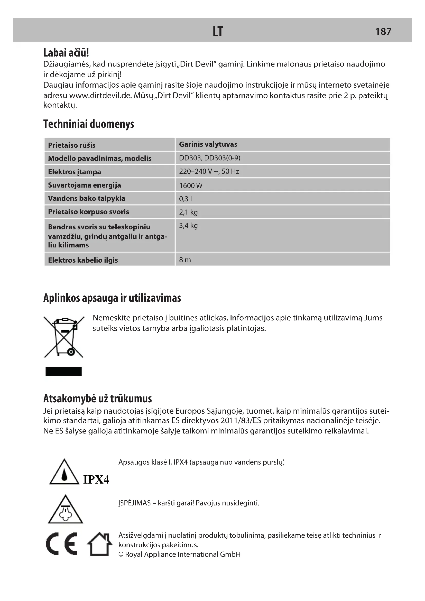 186IPX4 Aplinkos apsauga ir utilizavimas Nemeskite prietaiso į buitines atliekas. Informacijos apie tinkamą utilizavimą Jums suteiks vietos tarnyba arba įgaliotasis platintojas. Atsakomybė už trūkumus Jei prietaisą kaip naudotojas įsigijote Europos Sąjungoje, tuomet, kaip minimalūs garantijos sutei- kimo standartai, galioja atitinkamas ES direktyvos 2011/83/ES pritaikymas nacionalinėje teisėje. Ne ES šalyse galioja atitinkamoje šalyje taikomi minimalūs garantijos suteikimo reikalavimai. Atsižvelgdami į nuolatinį produktų tobulinimą, pasiliekame teisę atlikti techninius ir konstrukcijos pakeitimus.© Royal Appliance International GmbH Labai ačiū! Džiaugiamės, kad nusprendėte įsigyti „Dirt Devil“ gaminį. Linkime malonaus prietaiso naudojimo ir dėkojame už pirkinį! Daugiau informacijos apie gaminį rasite šioje naudojimo instrukcijoje ir mūsų interneto svetainėje adresu www.dirtdevil.de. Mūsų „Dirt Devil“ klientų aptarnavimo kontaktus rasite prie 2p. pateiktų kontaktų. Techniniai duomenys Prietaiso rūšisGarinis valytuvasModelio pavadinimas, modelisDD303, DD303(0-9)Elektros įtampa220–240 V ~, 50 HzSuvartojama energija1600 WVandens bako talpykla0,3 lPrietaiso korpuso svoris2,1 kgBendras svoris su teleskopiniu vamzdžiu, grindų antgaliu ir antga-liu kilimams3,4 kgElektros kabelio ilgis 8 m ĮSPĖJIMAS – karšti garai! Pavojus nusideginti.Apsaugos klasė I, IPX4 (apsauga nuo vandens purslų)