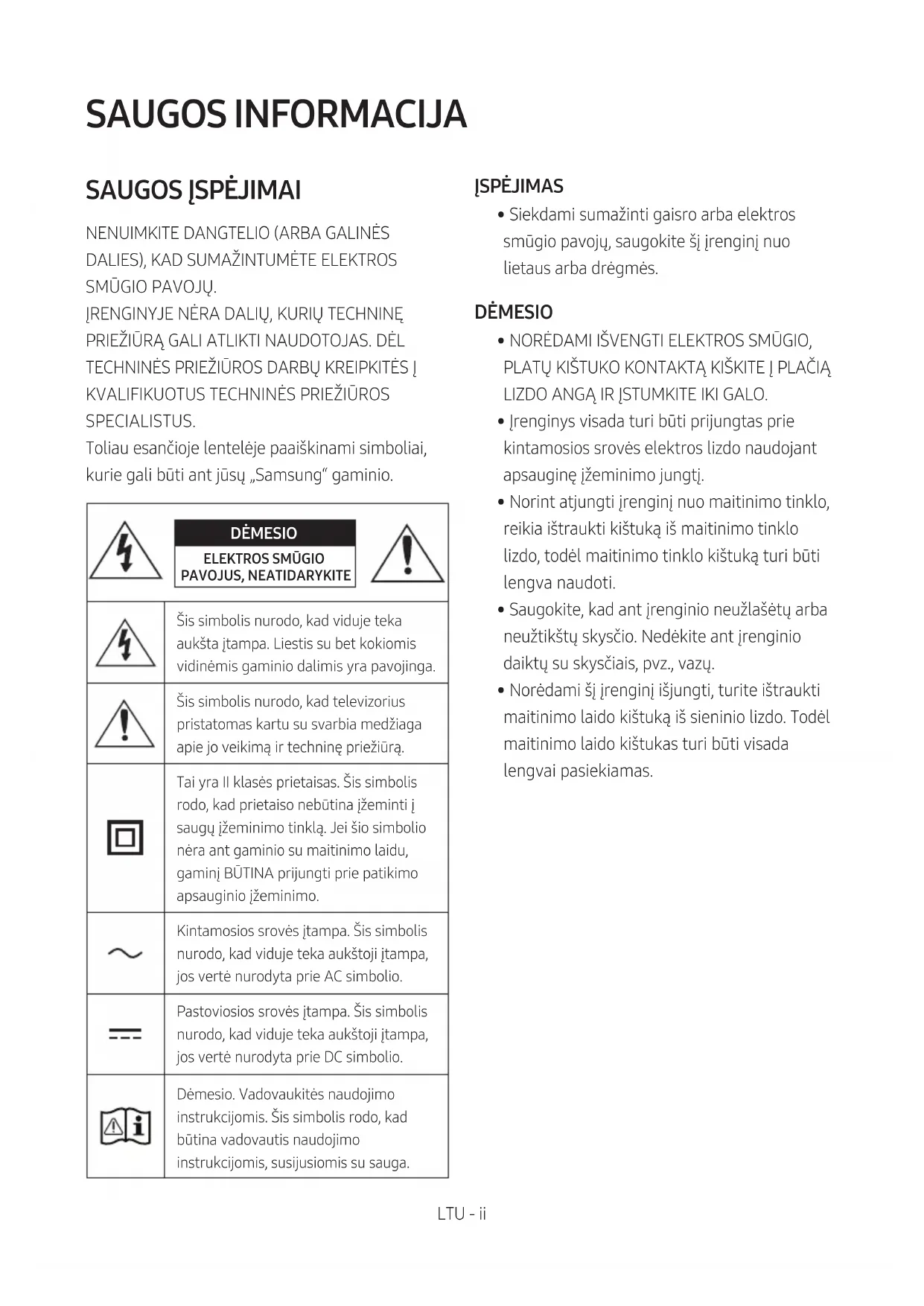 SPECIALISTUS. Toliau esančioje lentelėje paaiškinami simboliai, kurie gali būti ant jūsų „Samsung“ gaminio. DĖMESIO ELEKTROS SMŪGIO PAVOJUS, NEATIDARYKITEŠis simbolis nurodo, kad viduje teka aukšta įtampa. Liestis su bet kokiomis vidinėmis gaminio dalimis yra pavojinga.Šis simbolis nurodo, kad televizorius pristatomas kartu su svarbia medžiaga apie jo veikimą ir techninę priežiūrą.Tai yra II klasės prietaisas. Šis simbolis rodo, kad prietaiso nebūtina įžeminti į saugų įžeminimo tinklą. Jei šio simbolio nėra ant gaminio su maitinimo laidu, gaminį BŪTINA prijungti prie patikimo apsauginio įžeminimo. Kintamosios srovės įtampa. Šis simbolis nurodo, kad viduje teka aukštoji įtampa, jos vertė nurodyta prie AC simbolio.Pastoviosios srovės įtampa. Šis simbolis nurodo, kad viduje teka aukštoji įtampa, jos vertė nurodyta prie DC simbolio.Dėmesio. Vadovaukitės naudojimo instrukcijomis. Šis simbolis rodo, kad būtina vadovautis naudojimo instrukcijomis, susijusiomis su sauga. ĮSPĖJIMAS