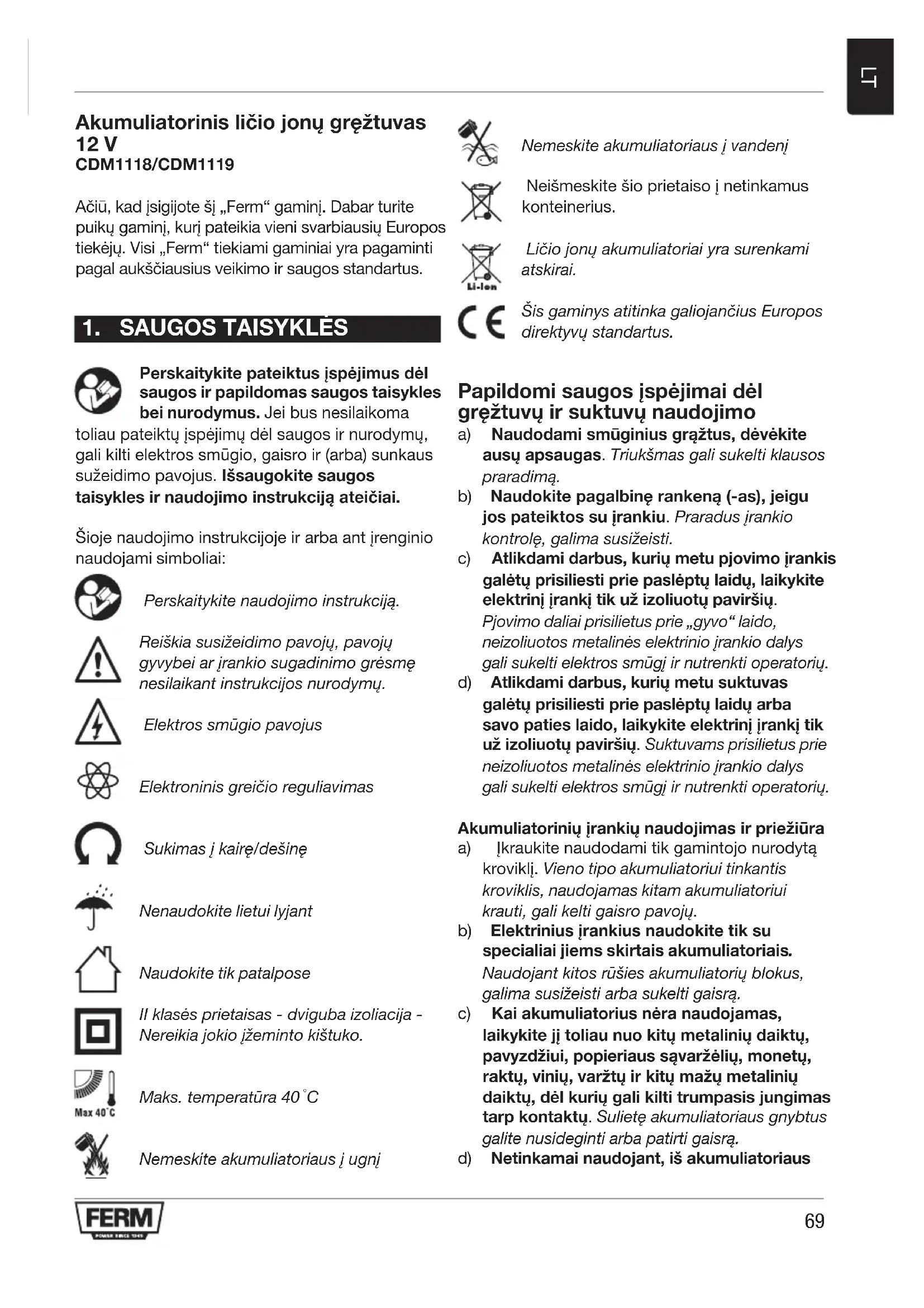 Akumuliatorinis ličio jonų gręžtuvas 12 V CDM1118/CDM1119 Ačiū,kadįsigijotešį„Ferm“gaminį.Dabarturite puikųgaminį,kurįpateikiavienisvarbiausiųEuropos tiekėjų.Visi„Ferm“tiekiamigaminiaiyrapagaminti pagalaukščiausiusveikimoirsaugosstandartus.