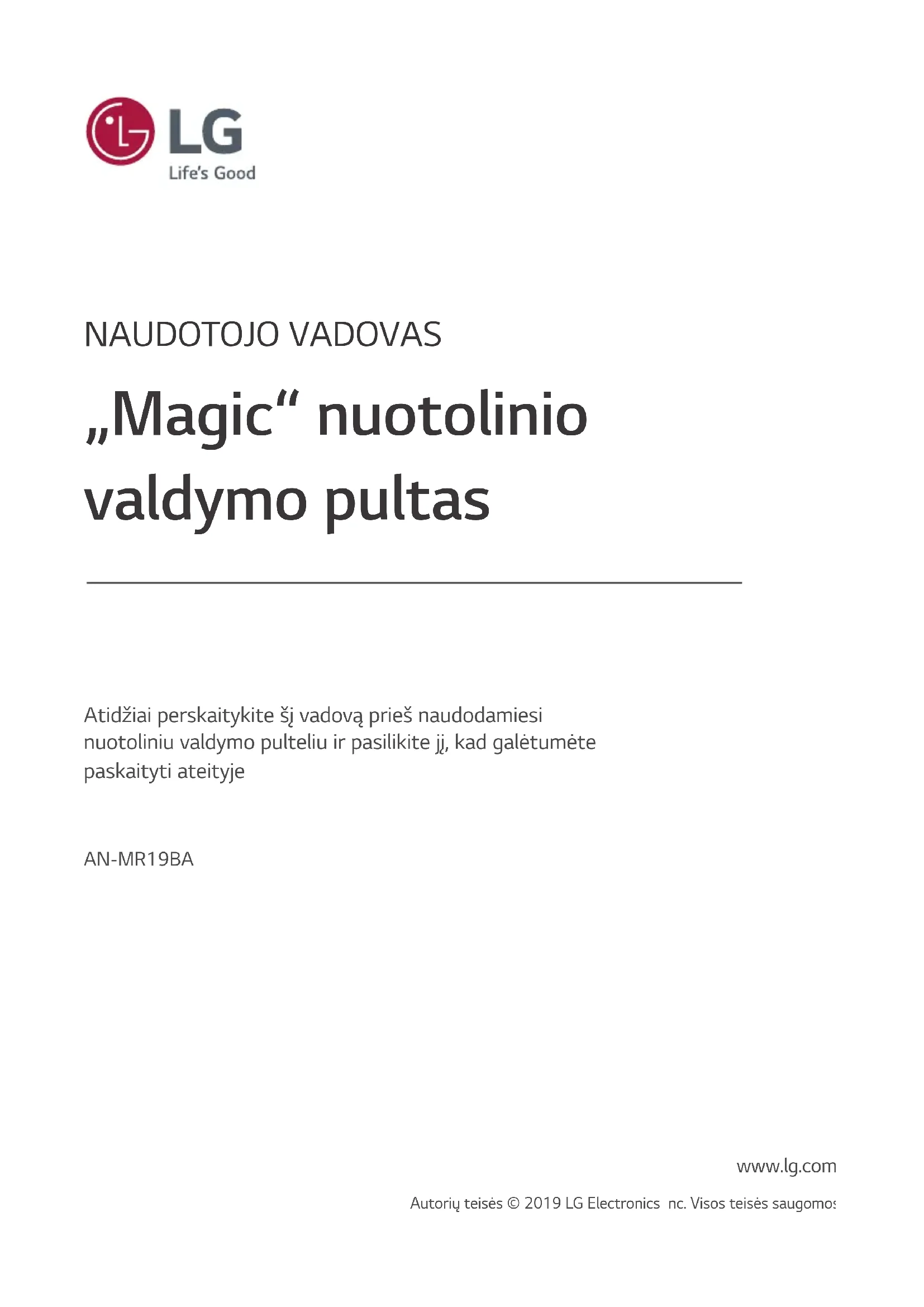 Modeļa Nr. AN-MR19BA Frekvenču diapazons 2,400 GHz līdz 2,4835 GHz zejas jauda (maks.) 4 dBm Kanāls 40 kanāli Barošanas avots AA 1,5 V, 2 sārma akumulatori Darba temperatūras diapazons 0 °C līdz 40 °CAN-MR19BA Atidžiai perskaitykite šį vadovą prieš naudodamiesi nuotoliniu valdymo pulteliu ir pasilikite jį, kad galėtumėte paskaityti ateityje „Magic“ nuotolinio valdymo pultas NAUDOTOJO VADOVAS www.lg.com Autorių teisės © 2019 LG Electronics nc. Visos teisės saugomos.2 PRIEDAI Rodomas nuotolinio valdymo pulto vaizdas gali skirtis nuo realaus gaminio. ( Priklausomai nuo šalies) Nuotolinio valdymo pultas „Magic“ ir šarminiai maitinimo elementai (AA) Naudotojo vadovas