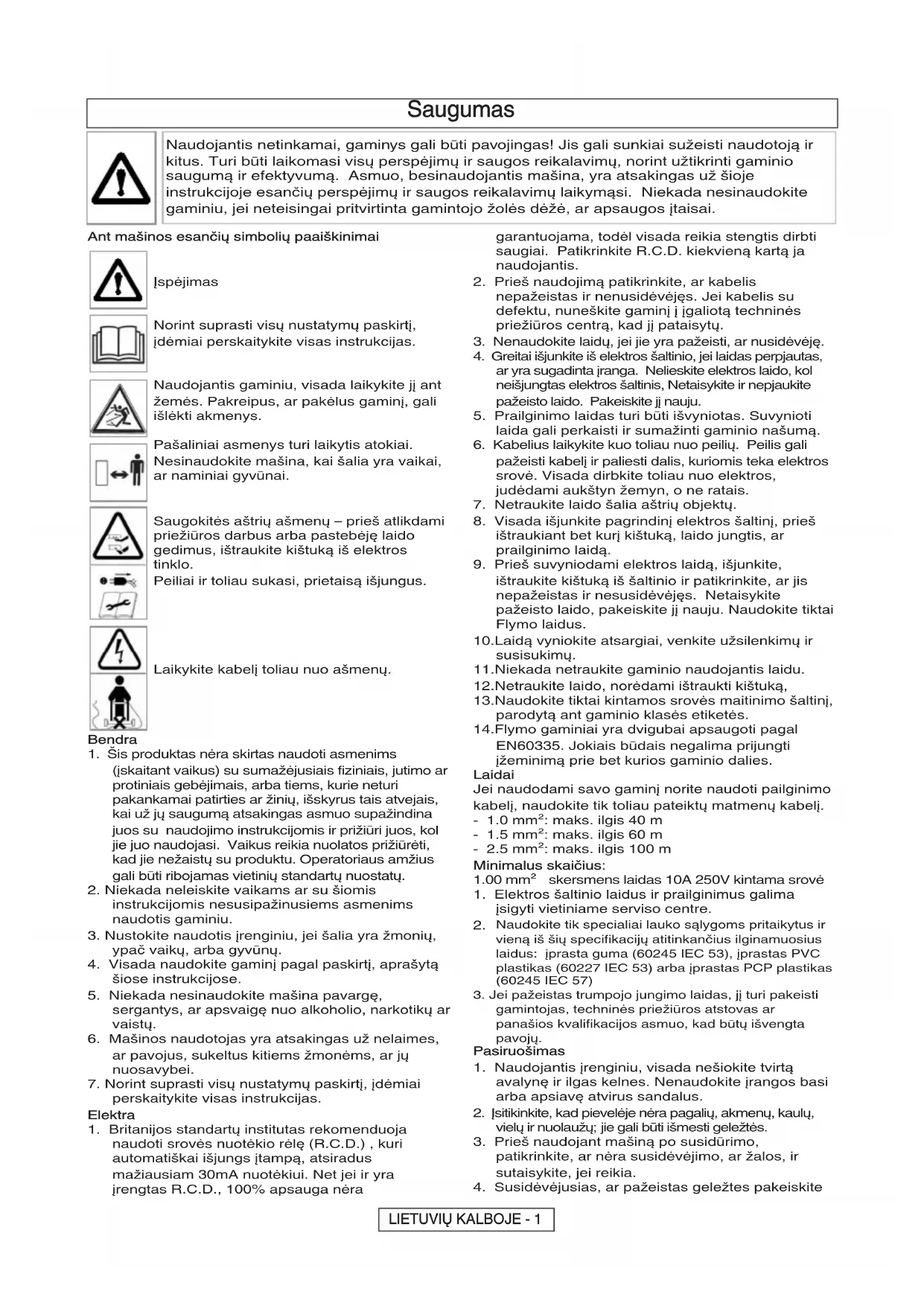 ištraukite kištuką iš šaltinio ir patikrinkite, ar jis nepažeistas ir nesusidėvėjęs. Netaisykite pažeisto laido, pakeiskite jį nauju. Naudokite tiktai Flymo laidus. 10.Laidą vyniokite atsargiai, venkite užsilenkimų ir susisukimų. 11.Niekada netraukite gaminio naudojantis laidu. 12.Netraukite laido, norėdami ištraukti kištuką, 13.Naudokite tiktai kintamos srovės maitinimo šaltinį, parodytą ant gaminio klasės etiketės. 14.Flymo gaminiai yra dvigubai apsaugoti pagal EN60335. Jokiais būdais negalima prijungti įžeminimą prie bet kurios gaminio dalies. Laidai Jei naudodami savo gaminį norite naudoti pailginimo kabelį, naudokite tik toliau pateiktų matmenų kabelį. - 1.0 mm²: maks. ilgis 40 m - 1.5 mm²: maks. ilgis 60 m - 2.5 mm²: maks. ilgis 100 m Minimalus skaičius: