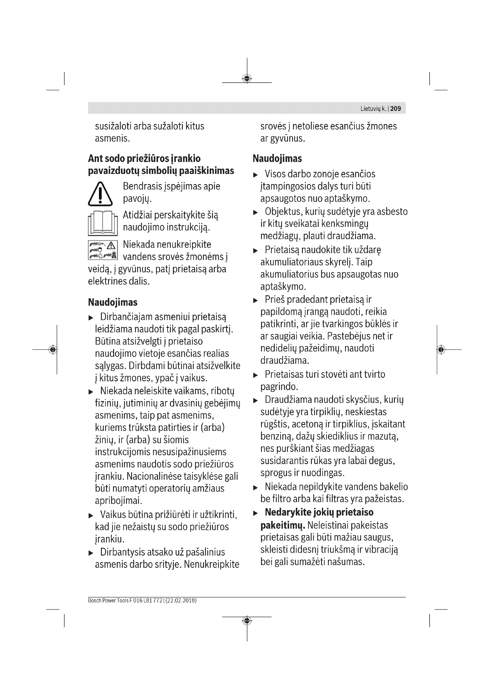 Niekada neleiskite vaikams, riboty fiziniu, jutiminiu ar dvasiniu gebejimu asmenims, taip pat asmenims, kuriems truksta patirties ir (arba) ziniu, ir (arba) su siomis instrukcijomis nesusipazinusiems asmenims naudotis sodo prieziuros jrankiu. Nacionalinese taisyklse gali buti numatyti operatoriu amziaus apribojimai.