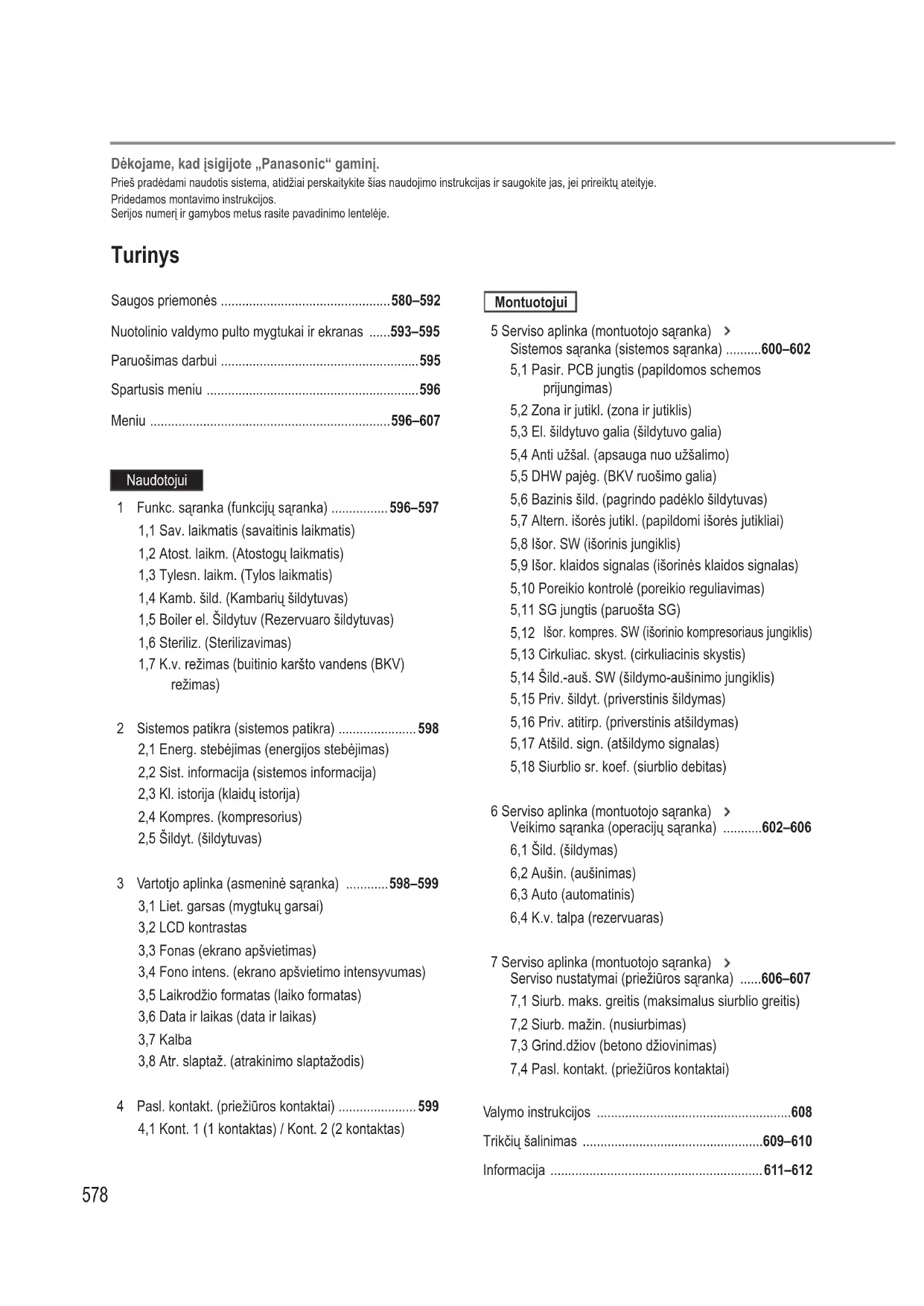 Memo Informacije578 Turinys Saugos priemonės 580–592 Nuotolinio valdymo pulto mygtukai ir ekranas 593–595 Paruošimas darbui 595 Spartusis meniu 596 Meniu 596–607 Naudotojui 1 Funkc. sąranka (funkcijų sąranka) 596–597 1,1 Sav. laikmatis (savaitinis laikmatis) 1,2 Atost. laikm. (Atostogų laikmatis) 1,3 Tylesn. laikm. (Tylos laikmatis) 1,4 Kamb. šild. (Kambarių šildytuvas) 1,5 Boiler el. Šildytuv (Rezervuaro šildytuvas) 1,6 Steriliz. (Sterilizavimas) 1,7 K.v. režimas (buitinio karšto vandens (BKV) režimas) 2 Sistemos patikra (sistemos patikra) 598 2,1 Energ. stebėjimas (energijos stebėjimas) 2,2 Sist. informacija (sistemos informacija) 2,3 Kl. istorija (klaidų istorija) 2,4 Kompres. (kompresorius) 2,5 Šildyt. (šildytuvas) 3 Vartotjo aplinka (asmeninė sąranka) 598–599 3,1 Liet. garsas (mygtukų garsai) 3,2 LCD kontrastas 3,3 Fonas (ekrano apšvietimas) 3,4 Fono intens. (ekrano apšvietimo intensyvumas) 3,5 Laikrodžio formatas (laiko formatas) 3,6 Data ir laikas (data ir laikas) 3,7 Kalba 3,8 Atr. slaptaž. (atrakinimo slaptažodis) 4 Pasl. kontakt. (priežiūros kontaktai) 599 4,1 Kont. 1 (1 kontaktas) / Kont. 2 (2 kontaktas) Montuotojui 5 Serviso aplinka (montuotojo sąranka) Sistemos sąranka (sistemos sąranka) 600–602 5,1 Pasir. PCB jungtis (papildomos schemos prijungimas) 5,2 Zona ir jutikl. (zona ir jutiklis) 5,3 El. šildytuvo galia (šildytuvo galia) 5,4 Anti užšal. (apsauga nuo užšalimo) 5,5 DHW pajėg. (BKV ruošimo galia) 5,6 Bazinis šild. (pagrindo padėklo šildytuvas) 5,7 Altern. išorės jutikl. (papildomi išorės jutikliai) 5,8 Išor. SW (išorinis jungiklis) 5,9 Išor. klaidos signalas (išorinės klaidos signalas) 5,10 Poreikio kontrolė (poreikio reguliavimas) 5,11 SG jungtis (paruošta SG) 5,12 Išor. kompres. SW (išorinio kompresoriaus jungiklis) 5,13 Cirkuliac. skyst. (cirkuliacinis skystis) 5,14 Šild.-auš. SW (šildymo-aušinimo jungiklis) 5,15 Priv. šildyt. (priverstinis šildymas) 5,16 Priv. atitirp. (priverstinis atšildymas) 5,17 Atšild. sign. (atšildymo signalas) 5,18 Siurblio sr. koef. (siurblio debitas) 6 Serviso aplinka (montuotojo sąranka) Veikimo sąranka (operacijų sąranka) 602–606 6,1 Šild. (šildymas) 6,2 Aušin. (aušinimas) 6,3 Auto (automatinis) 6,4 K.v. talpa (rezervuaras) 7 Serviso aplinka (montuotojo sąranka) Serviso nustatymai (priežiūros sąranka) 606–607 7,1 Siurb. maks. greitis (maksimalus siurblio greitis) 7,2 Siurb. mažin. (nusiurbimas) 7,3 Grind.džiov (betono džiovinimas) 7,4 Pasl. kontakt. (priežiūros kontaktai) Valymo instrukcijos 608 Trikčių šalinimas 609–610 Informacija 611–612 Dėkojame, kad įsigijote „Panasonic“ gaminį. Prieš pradėdami naudotis sistema, atidžiai perskaitykite šias naudojimo instrukcijas ir saugokite jas, jei prireiktų ateityje. Pridedamos montavimo instrukcijos Serijos numerį ir gamybos metus rasite pavadinimo lentelėje.Naudojimo sąlygos ŠILDYMAS (REZERVUARAS) ŠILDYMAS (KONTŪRAS)