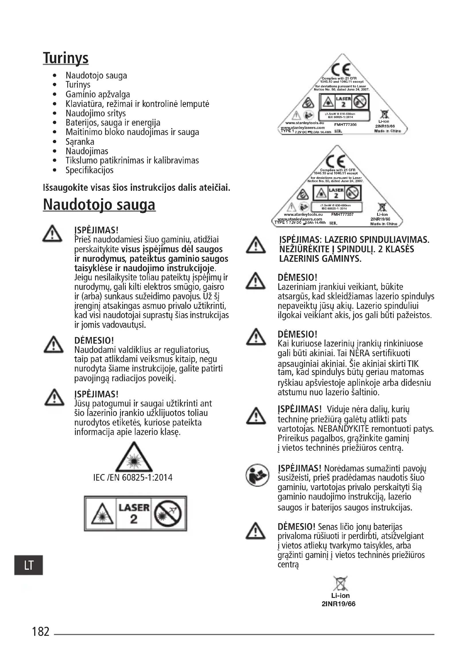 ĮSPĖJIMAS: LAZERIO SPINDULIAVIMAS. NEŽIŪRĖKITE Į SPINDULĮ. 2 KLASĖS LAZERINIS GAMINYS. DĖMESIO! Lazeriniam įrankiui veikiant, būkite atsargūs, kad skleidžiamas lazerio spindulys nepaveiktų jūsų akių. Lazerio spinduliui ilgokai veikiant akis, jos gali būti pažeistos. DĖMESIO! Kai kuriuose lazerinių įrankių rinkiniuose gali būti akiniai. Tai NĖRA sertikuoti apsauginiai akiniai. Šie akiniai skirti TIK tam, kad spindulys būtų geriau matomas ryškiau apšviestoje aplinkoje arba didesniu atstumu nuo lazerio šaltinio. ĮSPĖJIMAS! Viduje nėra dalių, kurių techninę priežiūrą galėtų atlikti pats vartotojas. NEBANDYKITE remontuoti patys. Prireikus pagalbos, grąžinkite gaminį įvietos techninės priežiūros centrą. ĮSPĖJIMAS! Norėdamas sumažinti pavojų susižeisti, prieš pradėdamas naudotis šiuo gaminiu, vartotojas privalo perskaityti šią gaminio naudojimo instrukciją, lazerio saugos ir baterijos saugos instrukcijas. DĖMESIO! Senas ličio jonų baterijas privaloma rūšiuoti ir perdirbti, atsižvelgiant įvietos atliekų tvarkymo taisykles, arba grąžinti gaminį į vietos techninės priežiūros centrą 2INR19/66 Li-ion183 Gaminio apžvalga A pav. – Lazerinis įrankis