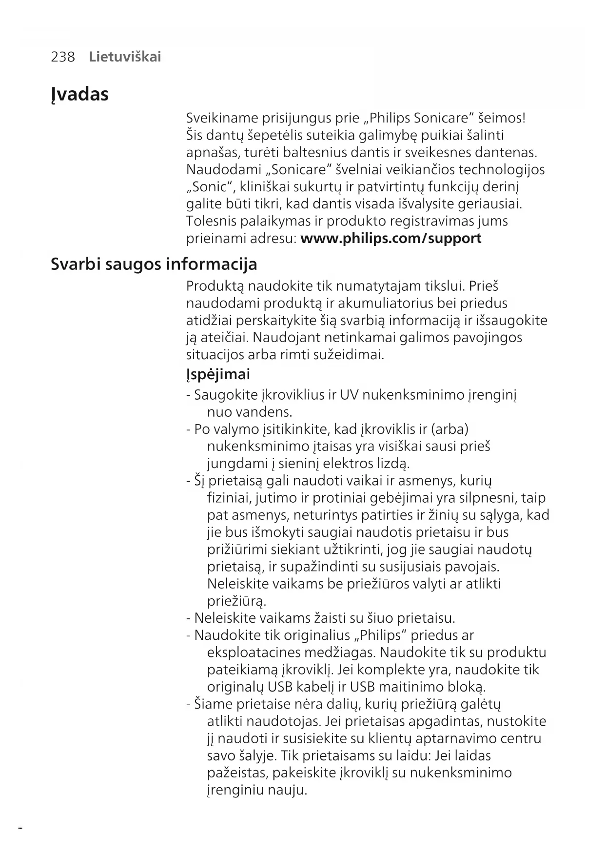 Lietuviškai Įvadas Sveikiname prisijungus prie „Philips Sonicare“ šeimos! Šis dantų šepetėlis suteikia galimybę puikiai šalinti apnašas, turėti baltesnius dantis ir sveikesnes dantenas. Naudodami „Sonicare“ švelniai veikiančios technologijos „Sonic“, kliniškai sukurtų ir patvirtintų funkcijų derinį galite būti tikri, kad dantis visada išvalysite geriausiai. Tolesnis palaikymas ir produkto registravimas jums prieinami adresu: www.philips.com/support Svarbi saugos informacija Produktą naudokite tik numatytajam tikslui. Prieš naudodami produktą ir akumuliatorius bei priedus atidžiai perskaitykite šią svarbią informaciją ir išsaugokite ją ateičiai. Naudojant netinkamai galimos pavojingos situacijos arba rimti sužeidimai. Įspėjimai - Saugokite įkroviklius ir UV nukenksminimo įrenginį nuo vandens. - Po valymo įsitikinkite, kad įkroviklis ir (arba) nukenksminimo įtaisas yra visiškai sausi prieš jungdami į sieninį elektros lizdą. - Šį prietaisą gali naudoti vaikai ir asmenys, kurių fiziniai, jutimo ir protiniai gebėjimai yra silpnesni, taip pat asmenys, neturintys patirties ir žinių su sąlyga, kad jie bus išmokyti saugiai naudotis prietaisu ir bus prižiūrimi siekiant užtikrinti, jog jie saugiai naudotų prietaisą, ir supažindinti su susijusiais pavojais. Neleiskite vaikams be priežiūros valyti ar atlikti priežiūrą. - Neleiskite vaikams žaisti su šiuo prietaisu. - Naudokite tik originalius „Philips“ priedus ar eksploatacines medžiagas. Naudokite tik su produktu pateikiamą įkroviklį. Jei komplekte yra, naudokite tik originalų USB kabelį ir USB maitinimo bloką. - Šiame prietaise nėra dalių, kurių priežiūrą galėtų atlikti naudotojas. Jei prietaisas apgadintas, nustokite jį naudoti ir susisiekite su klientų aptarnavimo centru savo šalyje. Tik prietaisams su laidu: Jei laidas pažeistas, pakeiskite įkroviklį su nukenksminimo įrenginiu nauju.239 Lietuviškai - Nenaudokite įkroviklio ir (arba) nukenksminimo įtaiso įrenginio lauke arba netoli įkaitusių paviršių. - Jokių produkto dalių neplaukite indaplovėje. - Šis prietaisas skirtas valyti tik dantis, dantenas ir liežuvį. - Visada laikykite dezinfekavimo įrenginį vaikams nepasiekiamoje vietoje. - Nebenaudokite nukenksminimo įrenginio, jei UV šviesos lemputė lieka šviesti atidarius dureles. UV šviesa gali būti pavojinga žmonių akims ir odai. - Dezinfekavimo įrenginį naudokite tik uždėję apsauginį skydelį. - Nelieskite UV nukenksminimo įrenginio UV šviesos lemputės, kai ji karšta. - Nebenaudokite šepetėlio galvutės, jei jos šereliai suspausti ar sulinkę. Šepetėlio galvutę keiskite kas 3 mėnesius arba dažniau, jei atsiranda susidėvėjimo požymių. - Venkite tiesioginio kontakto su produktais, kuriuose yra eterinių aliejų arba kokosų aliejaus. Kontaktas gali lemti šerių atsiskyrimą. - Nustokite naudoti prietaisą ir pasitarkite su odontologu/ gydytoju, jei po naudojimo pasireiškia per didelis kraujavimas, po 1 savaitės naudojimo kraujavimas tęsiasi arba jei jaučiate diskomfortą ar skausmą. - Jei per ankstesnius 2 mėnesius jums buvo atlikta burnos ertmės arba dantenų operacija, prieš naudodamiesi prietaisu pasitarkite su savo odontologu. - Jei jums implantuotas širdies stimuliatorius ar kitas prietaisas, prieš naudodamiesi pasitarkite su gydytoju ar implantuoto prietaiso gamintoju. - Jei jums kilo su medicina susijusių klausimų, prieš naudodami šį prietaisą pasikonsultuokite su gydytoju. - Šis prietaisas yra asmeninis priežiūros prietaisas ir nėra skirtas naudoti keliems pacientams odontologijos praktikai ar įstaigoje. Baterijos saugos instrukcijos - Šiame prietaise yra baterijos, kurias išimti turi tik įgudę asmenys.240 Lietuviškai - Produktą naudokite tik numatytajam tikslui. Prieš naudodami produktą ir akumuliatorius bei priedus atidžiai perskaitykite šią informaciją ir išsaugokite ją ateičiai. Naudojant netinkamai gali kelti pavojų arba rimtus sužeidimus. Teikiami priedai skirtingiems produktams gali skirtis. - Naudokite tik originalius „Philips“ priedus ir eksploatacines medžiagas. Naudokite tik nuimamą maitinimo bloką TCBxxxx, HX6100, HX6110, HX6160 arba WAAxxxx. - Laikykite produktą ir akumuliatorius toliau nuo ugnies bei vietose, kur nėra tiesioginės saulės šviesos ar aukštos temperatūros. - Jei produktas tampa neįprastai karštas arba jaučiamas kvapas, pasikeičia spalva arba įkrovimas trunka ilgiau nei turėtų, nustokite naudoti ir įkrauti produktą bei kreipkitės į „Philips“. - Produktų ir jų baterijų nedėkite į mikrobangų krosneles arba indukcines virykles. - Neatidarykite, nemodifikuokite, nepjaustykite, nesugadinkite ir neišrinkite produkto ar baterijos, kad išvengtumėte baterijų perkaitimo arba toksinių ir pavojingų medžiagų paskleidimo. Užtikrinkite, kad naudojant akumuliatorius nebūtų trumpojo jungimo, perkrovimo arba atvirkštinio krovimo. - Šiame prietaise yra nekeičiamų baterijų. Kai baigiasi baterijos naudojimo laikas, prietaisą būtina tinkamai šalinti, žr. skyrių apie perdirbimą. - Jei baterijos pažeistos arba teka, venkite sąlyčio su oda arba akimis. Taip atsitikus, nedelsdami gerai paskalaukite vandeniu ir kreipkitės į gydytoją. - Prieš tvarkydami baterijas įsitikinkite, kad jūsų rankos, produktas ir baterijos yra sausi. - Jei išėmę baterijas norite išvengti jų atsitiktinio trumpojo jungimo, neleiskite baterijų gnybtams liestis su metaliniais daiktais (pvz., monetomis, plaukų smeigtukais, žiedais). Draudžiama vynioti baterijas į aliuminio foliją. Prieš šalindami baterijas apvyniokite jų gnybtus lipnia juosta arba įdėkite baterijas į plastikinį maišelį.241 Lietuviškai - Įkraukite, naudokite ir laikykite produktą nuo 0°C iki 40°C temperatūroje. Laikymo ir gabenimo sąlygos Temperatūra: nuo –10°C iki 60°C. Elektromagnetiniai laukai (EML) Šis Philips prie