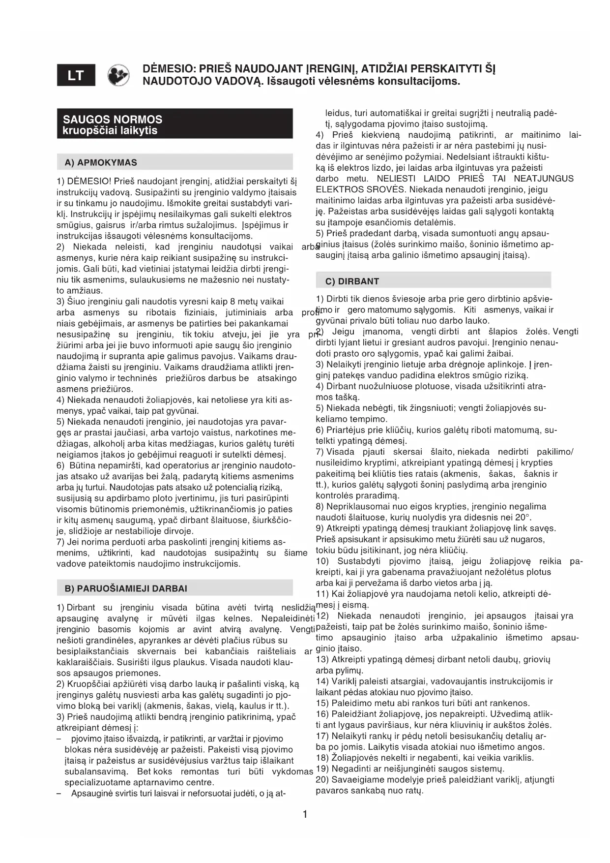 Sérült vagy meglazult részek Állítsa le a gépet és húzza ki a tápvezetéket. Ellenőrizze, hogy nincsenek-e rajta sérülések. Ellenőrizze, hogy nincsenek-e meglazult részek, ha szükséges, rögzítse. Az ellenőrzést, cserét vagy javítást szakszervizzel végeztesse el1 SAUGOS NORMOS kruopščiai laikytis A) APMOKYMAS 1) DĖMESIO! Prieš naudojant įrenginį, atidžiai perskaityti šį instrukcijų vadovą. Susipažinti su įrenginio valdymo įtaisais ir su tinkamu jo naudojimu. Išmokite greitai sustabdyti vari- klį. Instrukcijų ir įspėjimų nesilaikymas gali sukelti elektros smūgius, gaisrus ir/arba rimtus sužalojimus. Įspėjimus ir instrukcijas išsaugoti vėlesnėms konsultacijoms. 2) Niekada neleisti, kad įrenginiu naudotųsi vaikai arba asmenys, kurie nėra kaip reikiant susipažinę su instrukci- jomis. Gali būti, kad vietiniai įstatymai leidžia dirbti įrengi- niu tik asmenims, sulaukusiems ne mažesnio nei nustaty- to amžiaus. 3) Šiuo įrenginiu gali naudotis vyresni kaip 8 metų vaikai arba asmenys su ribotais ziniais, jutiminiais arba proti- niais gebėjimais, ar asmenys be patirties bei pakankamai nesusipažinę su įrenginiu, tik tokiu atveju, jei jie yra pri- žiūrimi arba jei jie buvo informuoti apie saugų šio įrenginio naudojimą ir supranta apie galimus pavojus. Vaikams drau- džiama žaisti su įrenginiu. Vaikams draudžiama atlikti įren- ginio valymo ir techninės priežiūros darbus be atsakingo asmens priežiūros. 4) Niekada nenaudoti žoliapjovės, kai netoliese yra kiti as- menys, ypač vaikai, taip pat gyvūnai. 5) Niekada nenaudoti įrenginio, jei naudotojas yra pavar- gęs ar prastai jaučiasi, arba vartojo vaistus, narkotines me- džiagas, alkoholį arba kitas medžiagas, kurios galėtų turėti neigiamos įtakos jo gebėjimui reaguoti ir sutelkti dėmesį. 6) Būtina nepamiršti, kad operatorius ar įrenginio naudoto- jas atsako už avarijas bei žalą, padarytą kitiems asmenims arba jų turtui. Naudotojas pats atsako už potencialią riziką, susijusią su apdirbamo ploto įvertinimu, jis turi pasirūpinti visomis būtinomis priemonėmis, užtikrinančiomis jo paties ir kitų asmenų saugumą, ypač dirbant šlaituose, šiurkščio- je, slidžioje ar nestabilioje dirvoje. 7) Jei norima perduoti arba paskolinti įrenginį kitiems as- menims, užtikrinti, kad naudotojas susipažintų su šiame vadove pateiktomis naudojimo instrukcijomis.