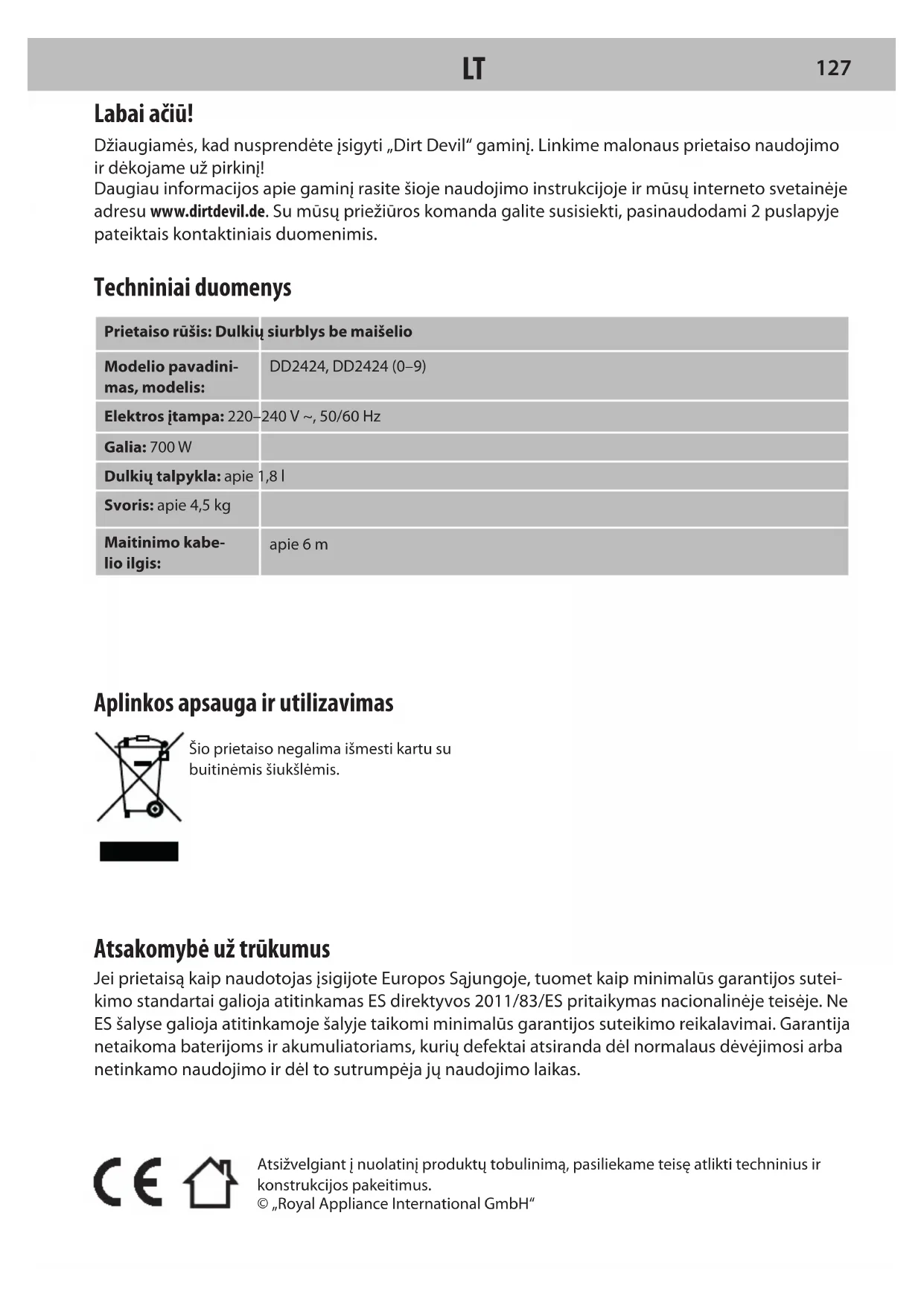 Atsakomybė už trūkumus Jei prietaisą kaip naudotojas įsigijote Europos Sąjungoje, tuomet kaip minimalūs garantijos sutei- kimo standartai galioja atitinkamas ES direktyvos 2011/83/ES pritaikymas nacionalinėje teisėje. Ne ES šalyse galioja atitinkamoje šalyje taikomi minimalūs garantijos suteikimo reikalavimai. Garantija netaikoma baterijoms ir akumuliatoriams, kurių defektai atsiranda dėl normalaus dėvėjimosi arba netinkamo naudojimo ir dėl to sutrumpėja jų naudojimo laikas. Atsižvelgiant į nuolatinį produktų tobulinimą, pasiliekame teisę atlikti techninius ir konstrukcijos pakeitimus. © „Royal Appliance International GmbH“ Labai ačiū! Džiaugiamės, kad nusprendėte įsigyti „Dirt Devil“ gaminį. Linkime malonaus prietaiso naudojimo ir dėkojame už pirkinį! Daugiau informacijos apie gaminį rasite šioje naudojimo instrukcijoje ir mūsų interneto svetainėje adresu www.dirtdevil.de. Su mūsų priežiūros komanda galite susisiekti, pasinaudodami 2puslapyje pateiktais kontaktiniais duomenimis. Techniniai duomenys Prietaiso rūšis: Dulkių siurblys be maišelio Modelio pavadini- mas, modelis: DD2424, DD2424 (0–9) Elektros įtampa: 220–240 V ~, 50/60 Hz Galia: 700 W Dulkių talpykla: apie 1,8 l Svoris: apie 4,5 kg Maitinimo kabe- lio ilgis: apie 6 m