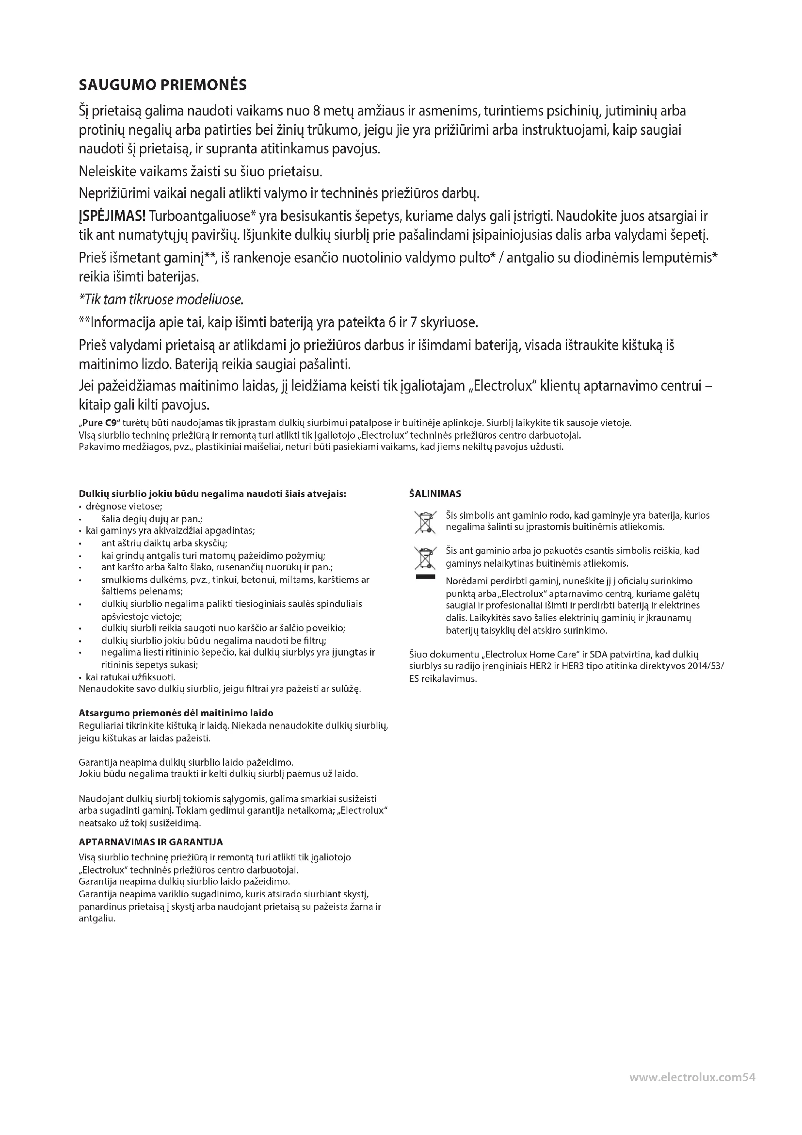 Šį prietaisą galima naudoti vaikams nuo 8 metų amžiaus ir asmenims, turintiems psichinių, jutiminių arba protinių negalių arba patirties bei žinių trūkumo, jeigu jie yra prižiūrimi arba instruktuojami, kaip saugiai naudoti šį prietaisą, ir supranta atitinkamus pavojus. Neleiskite vaikams žaisti su šiuo prietaisu. Neprižiūrimi vaikai negali atlikti valymo ir techninės priežiūros darbų. ĮSPĖJIMAS! Turboantgaliuose* yra besisukantis šepetys, kuriame dalys gali įstrigti. Naudokite juos atsargiai ir tik ant numatytųjų paviršių. Išjunkite dulkių siurblį prie pašalindami įsipainiojusias dalis arba valydami šepetį. Prieš išmetant gaminį**, iš rankenoje esančio nuotolinio valdymo pulto* / antgalio su diodinėmis lemputėmis* reikia išimti baterijas. *Tik tam tikruose modeliuose. **Informacija apie tai, kaip išimti bateriją yra pateikta 6 ir 7 skyriuose. Prieš valydami prietaisą ar atlikdami jo priežiūros darbus ir išimdami bateriją, visada ištraukite kištuką iš maitinimo lizdo. Bateriją reikia saugiai pašalinti. Jei pažeidžiamas maitinimo laidas, jį leidžiama keisti tik įgaliotajam „Electrolux“ klientų aptarnavimo centrui – kitaip gali kilti pavojus. „Pure C9“ turėtų būti naudojamas tik įprastam dulkių siurbimui patalpose ir buitinėje aplinkoje. Siurblį laikykite tik sausoje vietoje. Visą siurblio techninę priežiūrą ir remontą turi atlikti tik įgaliotojo „Electrolux“ techninės priežiūros centro darbuotojai. Pakavimo medžiagos, pvz., plastikiniai maišeliai, neturi būti pasiekiami vaikams, kad jiems nekiltų pavojus uždusti. Dulkių siurblio jokiu būdu negalima naudoti šiais atvejais: