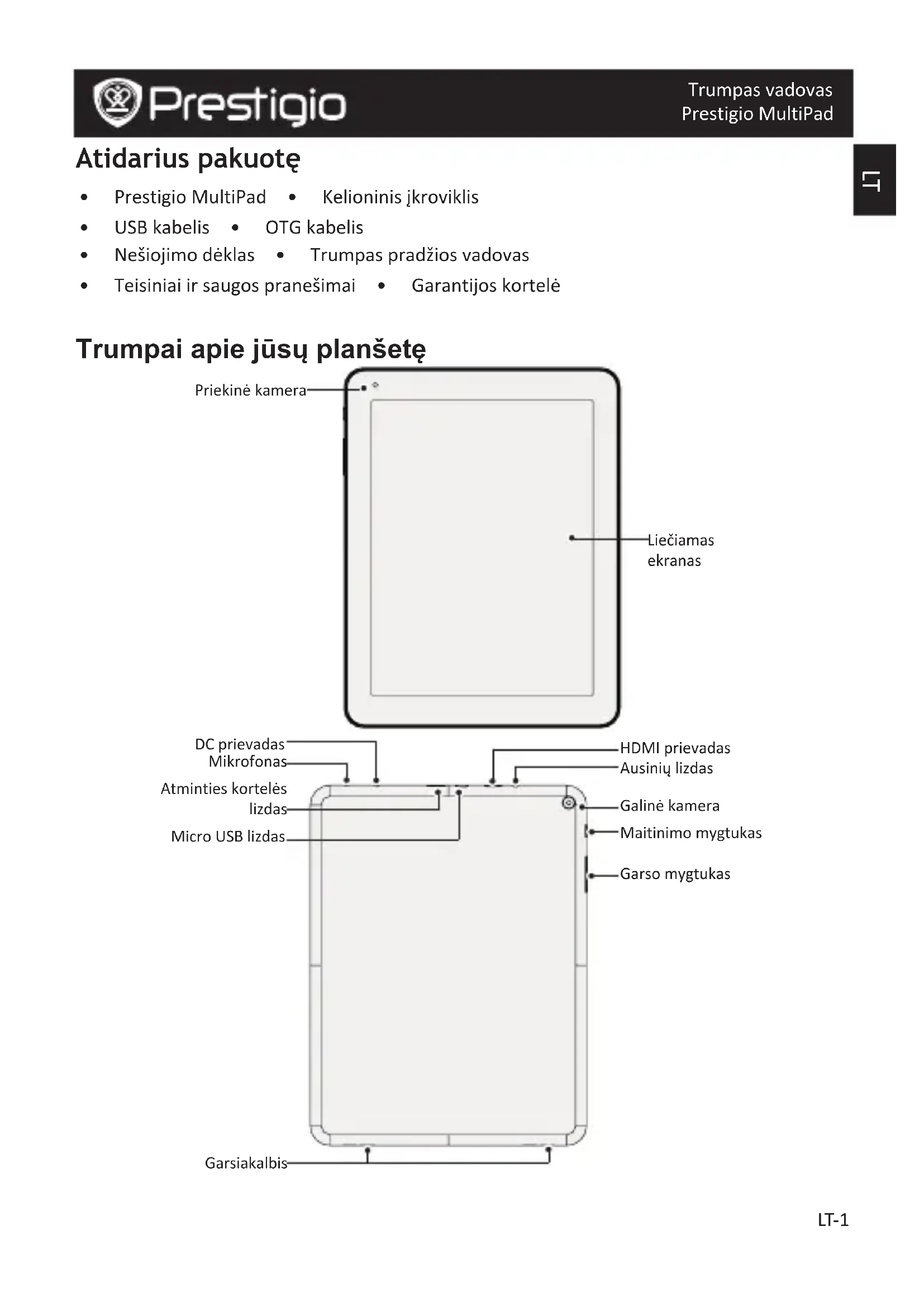 Trumpas vadovas Prestigio MultiPad Matmenys 241.5*185*9.3mm Svoris 626g KadangiPrestigiogaminiaiyranuolatostobulinamiirnaujinami,jūsųprietaiso programinėiraparatinėįrangagališiektiekskirtissavoišvaizdaarbapakeistomis funkcijomisnuotų,kuriosnurodytosšiametrumpamepradžiosvadove. Prestigiopareiškia,kadšisMultipadatitinkapagrindiniusreikalavimusirkitusatitinkamus reglamentus,išdėstytusESdirektyvoje1999/5/EB.Pilnąatitiktiesdeklaracijosversijągalite rastičia: http://www.prestigio.com/compliance. Siekiantišvengtigalimųpakenkimųklausai,nesiklausykitedideliugarsuilgąlaiką.LV-1