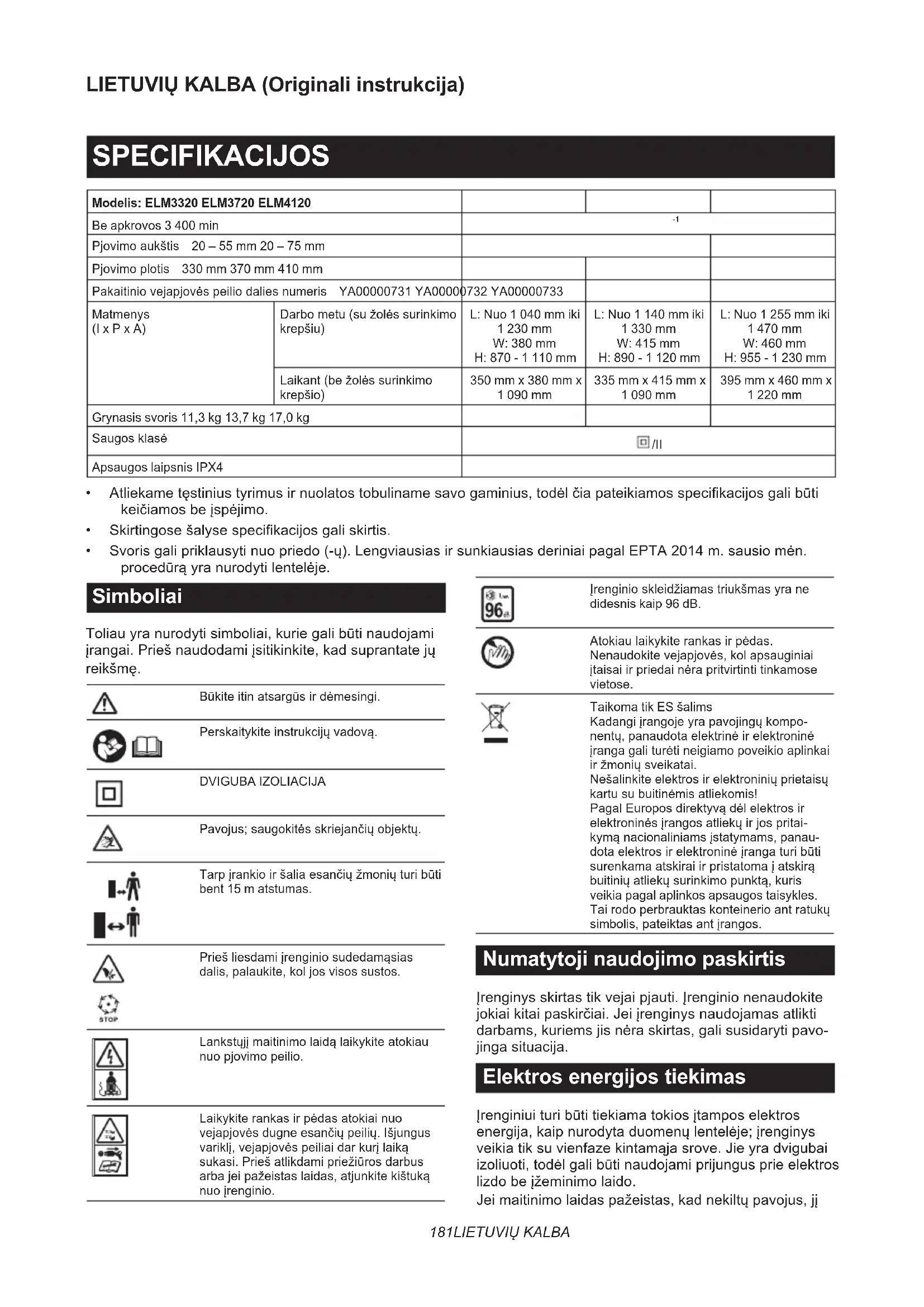 - Svorisgalipriklausytinuopriedo(-ų).LengviausiasirsunkiausiasderiniaipagalEPTA2014m.sausiomėn. procedūrąyranurodytilentelėje. Simboliai Toliauyranurodytisimboliai,kuriegalibūtinaudojami įrangai.Priešnaudodamiįsitikinkite,kadsuprantatejų reikšmę. Būkiteitinatsargūsirdėmesingi. Perskaitykiteinstrukcijųvadovą. DVIGUBA IZOLIACIJA Pavojus;saugokitėsskriejančiųobjektų. Tarpįrankioiršaliaesančiųžmoniųturibūti bent 15 m atstumas. Priešliesdamiįrenginiosudedamąsias dalis,palaukite,koljosvisossustos. Lankstųjįmaitinimolaidąlaikykiteatokiau nuopjovimopeilio. Laikykiterankasirpėdasatokiainuo vejapjovėsdugneesančiųpeilių.Išjungus variklį,vejapjovėspeiliaidarkurįlaiką sukasi.Priešatlikdamipriežiūrosdarbus arbajeipažeistaslaidas,atjunkitekištuką nuoįrenginio. Įrenginioskleidžiamastriukšmasyrane didesnis kaip 96 dB. Atokiaulaikykiterankasirpėdas. Nenaudokitevejapjovės,kolapsauginiai įtaisaiirpriedainėrapritvirtintitinkamose vietose. Taikoma tik ES šalims Kadangiįrangojeyrapavojingųkompo- nentų,panaudotaelektrinėirelektroninė įrangagaliturėtineigiamopoveikioaplinkai iržmoniųsveikatai. Nešalinkiteelektrosirelektroniniųprietaisų kartusubuitinėmisatliekomis! PagalEuroposdirektyvądėlelektrosir elektroninėsįrangosatliekųirjospritai- kymąnacionaliniamsįstatymams,panau- dotaelektrosirelektroninėįrangaturibūti surenkamaatskiraiirpristatomaįatskirą buitiniųatliekųsurinkimopunktą,kuris veikia pagal aplinkos apsaugos taisykles. Tairodoperbrauktaskonteinerioantratukų simbolis,pateiktasantįrangos. Numatytoji naudojimo paskirtis Įrenginysskirtastikvejaipjauti.Įrenginionenaudokite jokiaikitaipaskirčiai.Jeiįrenginysnaudojamasatlikti darbams,kuriemsjisnėraskirtas,galisusidarytipavo- jingasituacija. Elektros energijos tiekimas Įrenginiuituribūtitiekiamatokiosįtamposelektros energija,kaipnurodytaduomenųlentelėje;įrenginys veikiatiksuvienfazekintamąjasrove.Jieyradvigubai izoliuoti,todėlgalibūtinaudojamiprijungusprieelektros lizdobeįžeminimolaido. Jeimaitinimolaidaspažeistas,kadnekiltųpavojus,jį182 LIETUVIŲ KALBA turipakeistigamintojasarbajotechninėspriežiūros atstovas. Viešosioms žemos įtampos skirstymo sistemoms (nuo 220 iki 250 V) Perjungiantelektrinioįrenginiooperacijasįtampagali svyruoti.Šioįrenginionaudojimasnepalankiomis elektrostinklosąlygomisgalidarytiįtakąkitosįrangos darbui.Kaipilnutinėįėjimovaržayralygiarmažesnė negu 0,425 om. (skirta ELM3720) arba 0,427 om. (skirta ELM4120),galimamanyti,kadnebusjokioneigiamo poveikio.Šiamįrankiuinaudojamaselektrostinklo lizdasturibūtiapsaugotassaugikliuarbaapsauginiu grandinėsnutraukikliu,pasižyminčiulėtosuveikimo charakteristika. Triukšmas Taikomas standartas : EN IEC 62841-4-3 Modelis Garsoslėgiolygis Garso galios lygis
