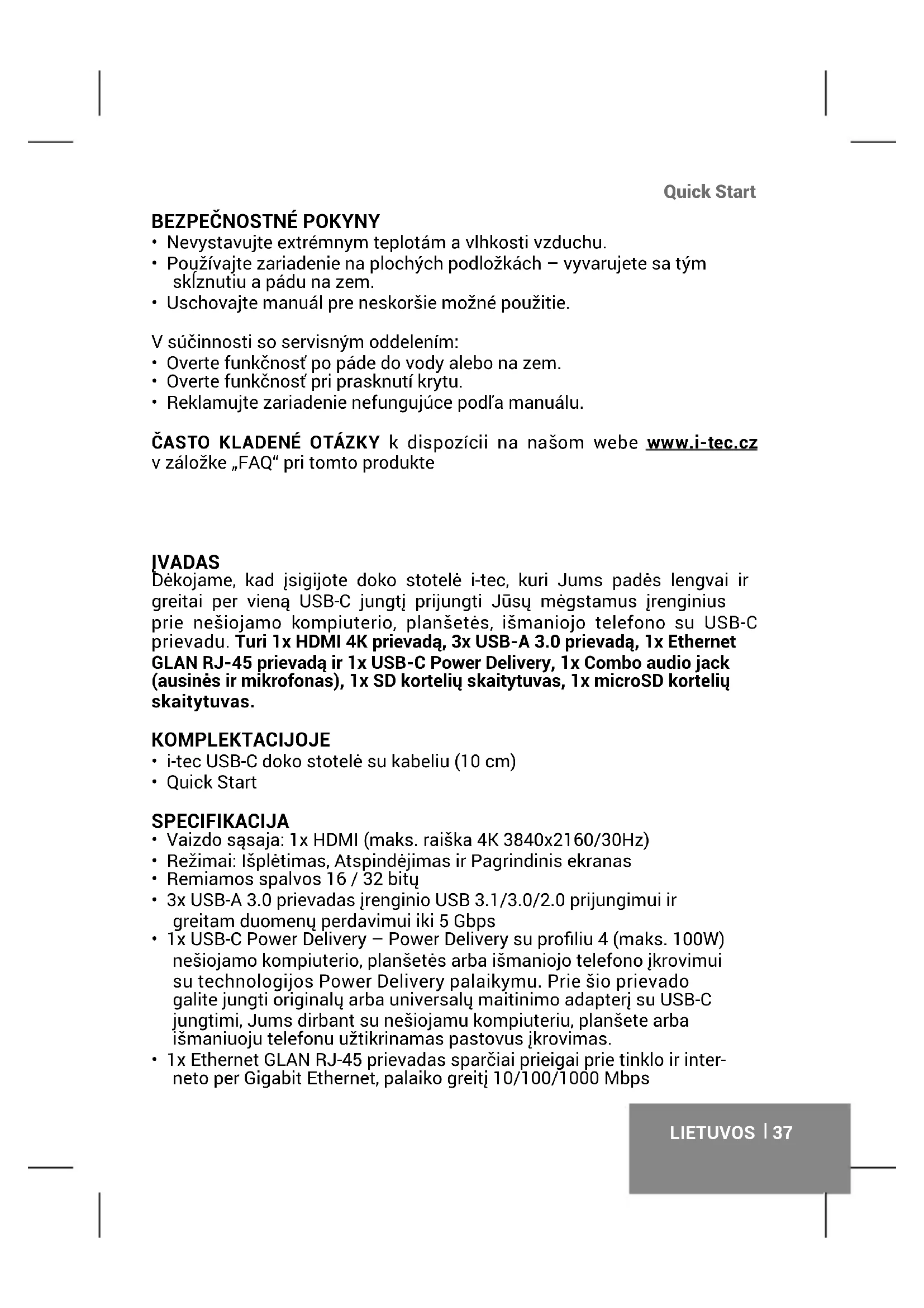 - Reklamujte zariadenie nefungujúce podľa manuálu. ČASTO KLADENÉ OTÁZKY k dispozícii na našom webe www.i-tec.cz v záložke „FAQ“ pri tomto produkte LIETUVOS ĮVADAS Dėkojame, kad įsigijote doko stotelė i-tec, kuri Jums padės lengvai ir greitai per vieną USB-C jungtį prijungti Jūsų mėgstamus įrenginius prie nešiojamo kompiuterio, planšetės, išmaniojo telefono su USB-C prievadu. Turi 1x HDMI 4K prievadą, 3x USB-A 3.0 prievadą, 1x Ethernet GLAN RJ-45 prievadą ir 1x USB-C Power Delivery, 1x Combo audio jack (ausinės ir mikrofonas), 1x SD kortelių skaitytuvas, 1x microSD kortelių skaitytuvas. KOMPLEKTACIJOJE