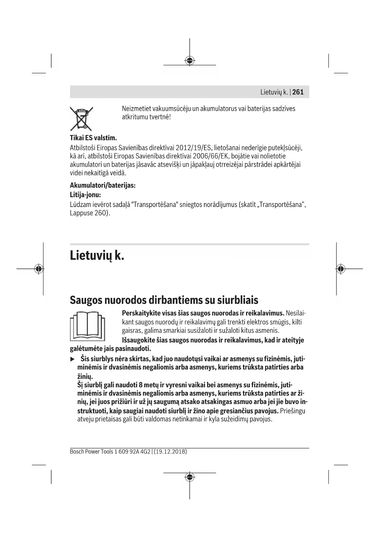 ir sandėliuojant °C -10...+50 rekomenduojami akumuliatoriai 1 607 A35 08. Rekomenduojamas tinklo adapteris 1 600 A01 6A. A) Ribota galia, esant temperatūrai <0 °C Techniniai duomenys nustatyti su tiekiamame komplekte esančiais akumuliatoriais. Montavimas u Prieš pradėdami siurblio techninės priežiūros, valymo ar reguliavimo darbus, keisdami papildomą įrangą arba norėdami siurblį sandėliuoti, išimkite akumulia- torių. Ši atsargumo priemonė apsaugos jus nuo netikėto siurblio įsijungimo. Akumuliatoriaus įkrovimas (žr. A pav.) u Naudokite tik techninių duomenų skyriuje nurodytą tinklo adapterį. Tik toks tinklo adapteris yra pritaikytas prie jūsų siurblyje naudojamo ličio jonų akumuliato- riaus. Nuoroda: akumuliatorius pristatomas iš dalies įkrautas. Kad akumuliatorius veiktų visa galia, prieš pirmąjį naudojimą jį su tinklo adapteriu visiškai įkraukite. Ličio jonų akumuliatorių galima įkrauti bet kada, eksploatavimo trukmė dėl to nesutrum- pėja. Krovimo proceso nutraukimas akumuliatoriui nekenkia. 1 609 92A 4G2 | (19.12.2018) Bosch Power ToolsLietuvių k. | 265 Celių apsaugos sistema „Electronic Cell Protection“ (ECP) saugo ličio jonų akumuliatorių nuo visiškos iškrovos. Kai akumuliatorius išsikrauna, apsauginis išjungiklis išjungia siurb- lį. u Siurbliui automatiškai išsijungus, nebespauskite įjungimo-išjungimo jungiklio. Taip galite sugadinti ličio jonų akumuliatorių. Akumuliatorius turi NTC temperatūros kontrolės daviklį, kuris leidžia įkrauti akumuliato- rių tik tuomet, kai jo temperatūra yra tarp 10 °C ir 35 °C. Todėl labai pailgėja akumuliato- riaus eksploatavimo trukmė. Akumuliatorių (3) galite įkrauti atskirai arba siurblyje. – Atidenkite dangtelį (6). – Akumuliatorių (3) USB kabeliu (11) sujunkite su tinklo adapteriu (10). – Tinklo adapterį (10) įstatykite į kištukinį lizdą. Pradedamas įkrovimas. Akumuliatoriaus įkrovos indikatorius (4) informuoja apie vykstantį įkrovimo procesą. Įkrovimo metu siurblys yra deaktyvintas ir jo naudoti negalima. Jei ketinate daryti ilgesnę pertrauką, atjunkite tinklo adapterį (10) nuo elektros tinklo. Akumuliatoriaus įdėjimas ir išėmimas (žr. B1−B2 pav.) u Įdėdami akumuliatorių nenaudokite jėgos. Akumuliatorius sukonstruotas taip, kad į siurblį jį būtų galima įstatyti tik tinkama padėtimi. – Stumkite akumuliatorių (3) į akumuliatoriaus skyrių (12) iki atramos. – Norėdami išimti akumuliatorių (3), paspauskite ant akumuliatoriaus esančius atblo- kavimo mygtukus (13) ir ištraukite akumuliatorių iš akumuliatoriaus skyriaus (12). Laikykitės pateiktų šalinimo nurodymų. Akumuliatoriaus įkrovos būklės indikatorius Akumuliatoriaus įkrovos indikatorius (4) automatiškai suaktyvinamas, kai tik pajudina- mas akumuliatorius (3). Akumuliatoriaus įkrovos indikatorius (4) po kelių sekundžių užgęsta, kai akumuliatorius (3) nebejudinamas. Darbo proceso su siurbliu metu akumu- liatoriaus įkrovos indikatorius (4) yra išjungtas. Įkrovimas Akumuliatorius atskirai arba siurblyje (judant) Įkrovimas (akumuliatorius su prijungtu tinklo adapteriu) 100 % Žalia (nuolat) Žalia (nuolat) Bosch Power Tools 1 609 92A 4G2 | (19.12.2018)266 | Lietuvių k. Įkrovimas Akumuliatorius atskirai arba siurblyje (judant) Įkrovimas (akumuliatorius su prijungtu tinklo adapteriu) 100 %−50 % Žalia (nuolat) Žalia (mirksinti) 50 %−20 % Geltona (nuolat) Žalia (mirksinti) 20 %−5 % Raudona (nuolat) Žalia (mirksinti) 5 %−0 % Raudona (mirksinti) Žalia (mirksinti) Nuoroda: po ilgesnio akumuliatoriaus (3) sandėliavimo ir nenaudojimo laiko gali būti, kad nebus suaktyvintas akumuliatoriaus įkrovos indikatorius (4). Taip akumuliatorius (3) yra saugomas nuo visiškos iškrovos. Kai tik akumuliatorius (3) įkraunamas, indikatorius vėl suaktyvinamas. Tokiu atveju, įkrovimo laikas pailgėja. Akumuliatoriaus įkrovos indikatorius (4) užgęsta praėjus kelioms minutėms po to, kai akumuliatorius (3) visiškai įkraunamas. Nuoroda: jei akumuliatoriaus įkrovos būklės indikatorius (4) mirksi baltai, vadinasi tem- peratūra yra už leidžiamojo aplinkos temperatūros diapazono ribų. Kai pasiekiamas lei- džiamosios temperatūros diapazonas, automatiškai prasideda įkrovimo procesas. Įkrovi- mo metu akumuliatoriaus įkrovos būklės indikatorius (4) mirksi žaliai. Siurbimo priedų montavimas Siurblio papildomą įrangą galima tiesiogiai sujungti su dulkių surinkimo dėžute(8). – Siurblio papildomos įrangos dalis tvirtai įstatykite į dulkių surinkimo dėžutę (8) ir vieną į kitą. Naudojimas u Prieš pradėdami siurblio techninės priežiūros, valymo ar reguliavimo darbus, keisdami papildomą įrangą arba norėdami siurblį sandėliuoti, išimkite akumulia- torių. Ši atsargumo priemonė apsaugos jus nuo netikėto siurblio įsijungimo. u Atkreipkite dėmesį į tai, kad „USB Type-C“ įvorės dangtelis (6) veikimo metu būtų uždengtas. Taip išvengsite dulkių patekimo. Paruošimas naudoti u Prieš pradėdami siurbti įsitikinkite, kad tvirtai sumontuotas filtravimo mazgas. 1 609 92A 4G2 | (19.12.2018) Bosch Power ToolsLietuvių k. | 267 u Naudokite tik nepažeistus filtrus (be įtrūkių, skylių ir pan.). Pažeistą filtrą ne- delsdami pakeiskite. Įjungimas ir išjungimas – Norėdami siurblį įjungti, paspauskite įjungimo-išjungimo mygtuką (2). – Norėdami siurblį išjungti, dar kartą paspauskite įjungimo-išjungimo mygtuką (2). Priežiūra ir servisas Priežiūra ir valymas u Prieš pradėdami siurblio techninės priežiūros, valymo ar reguliavimo darbus, keisdami papildomą įrangą arba norėdami siurblį sandėliuoti, išimkite akumulia- torių. Ši atsargumo priemonė apsaugos jus nuo netikėto siurblio įsijungimo. u Kad galėtumėte gerai ir saugiai dirbti, pasirūpinkite, kad ventiliacinės angos ir siurblys būtų švarūs. – Retkarčiais nuvalykite siurblio korpusą drėgna šluoste. – Užte