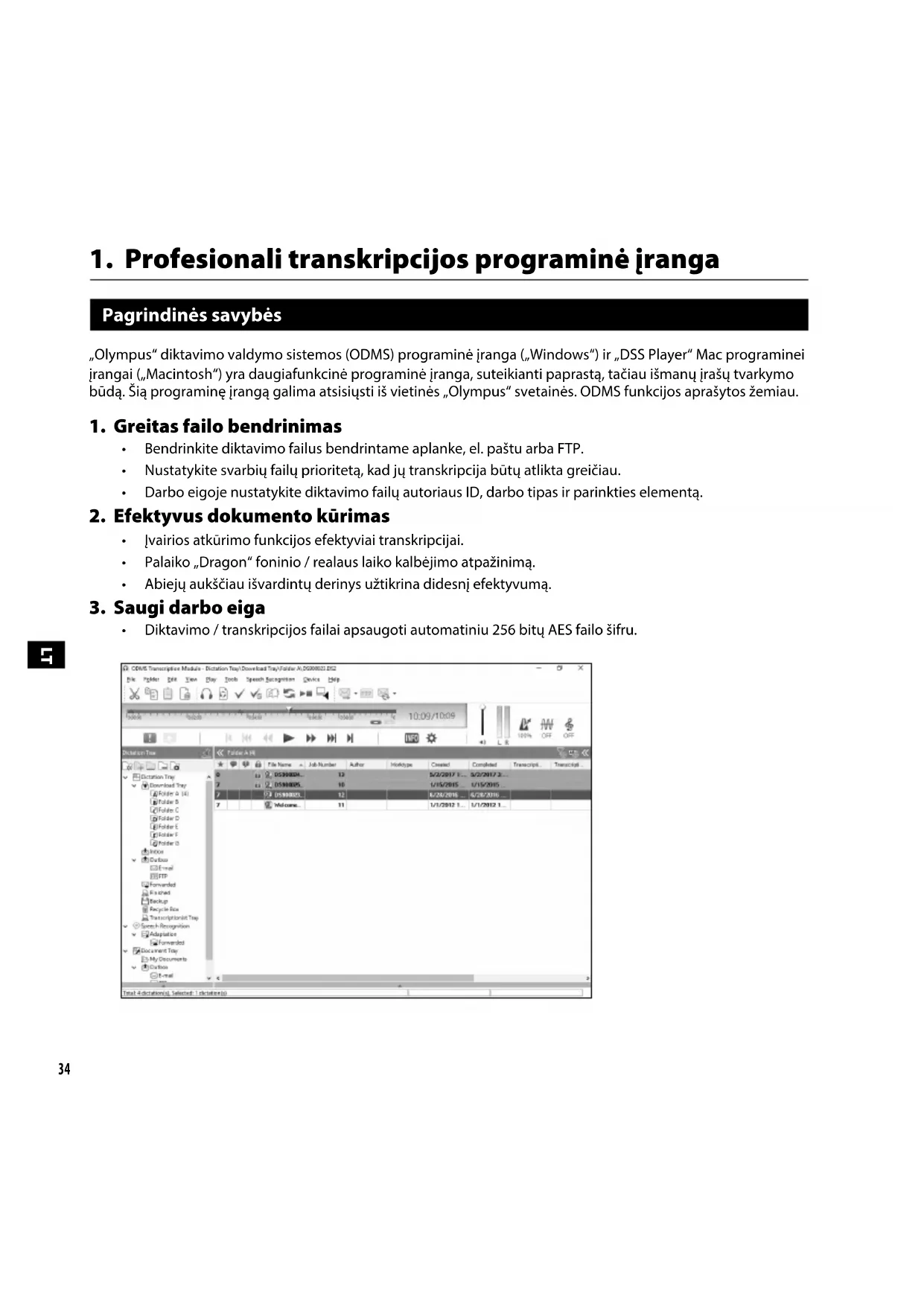 Pagrindinės savybės „Olympus“ diktavimo valdymo sistemos (ODMS) programinė įranga („Windows“) ir „DSS Player“ Mac programinei įrangai („Macintosh“) yra daugiafunkcinė programinė įranga, suteikianti paprastą, tačiau išmanų įrašų tvarkymo būdą. Šią programinę įrangą galima atsisiųsti iš vietinės „Olympus“ svetainės. ODMS funkcijos aprašytos žemiau.