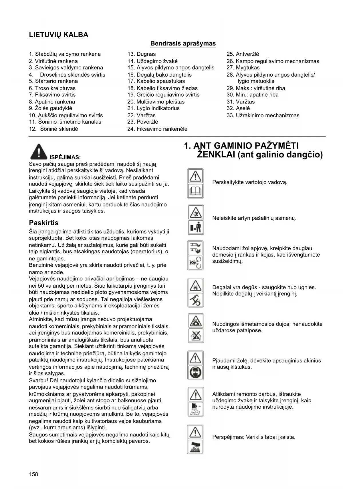 Perskaitykite vartotojo vadovą. Neleiskite artyn pašalinių asmenų. Naudodami žoliapjovę, kreipkite daugiau dėmesio į rankas ir kojas, kad išvengtumėte susižeidimų. Degalai yra degūs - saugokite nuo ugnies. Nepilkite degalų į veikiantį įrenginį. Nuodingos išmetamosios dujos; nenaudokite uždarose patalpose. Pjaudami žolę, dėvėkite apsauginius akinius ir ausų kištukus. Atlikdami remonto darbus, ištraukite uždegimo žvakę ir taisykite įrenginį, kaip nurodyta naudojimo instrukcijoje. Perspėjimas: Variklis labai įkaista.159