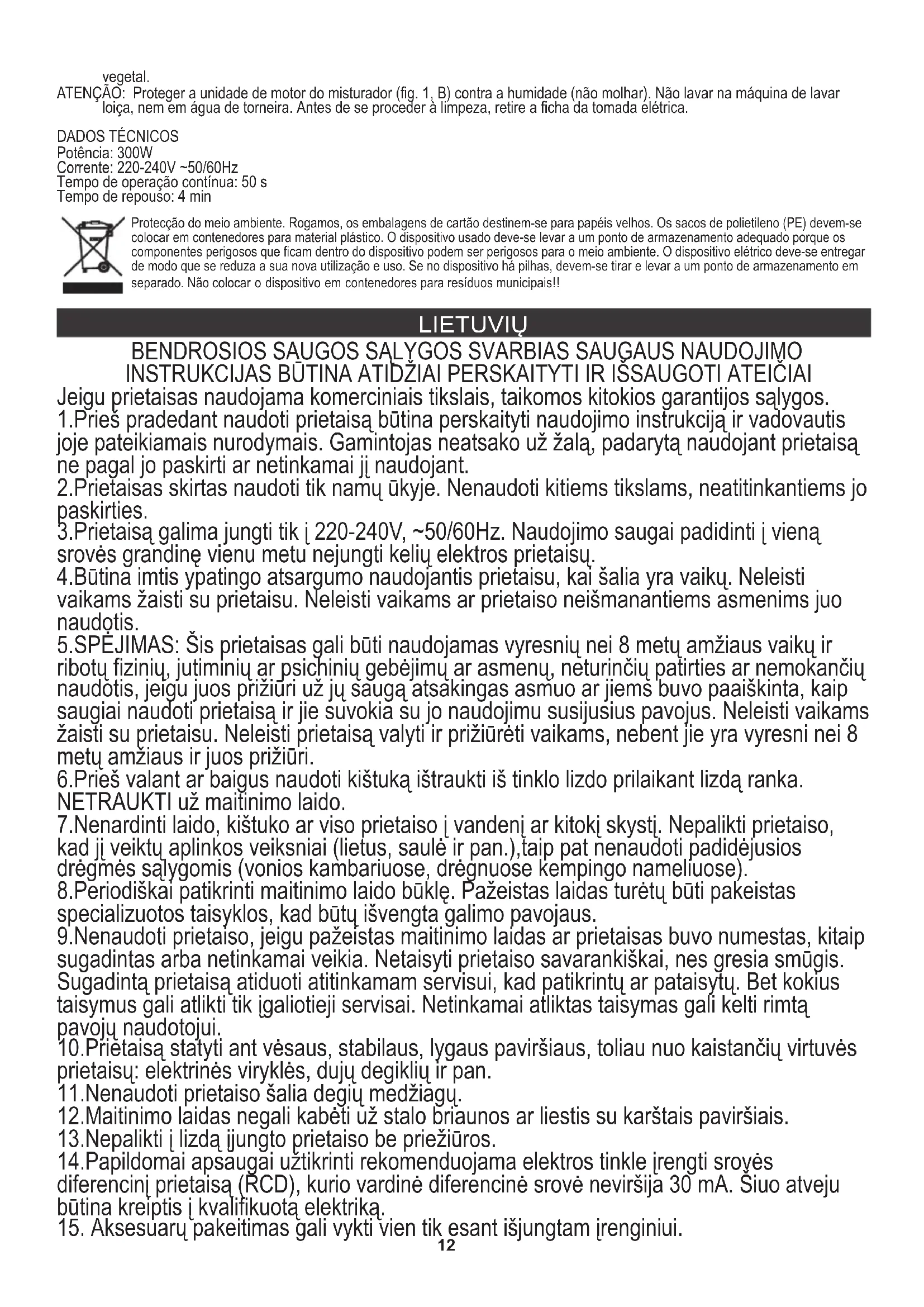 4. Certos legumes, p.ex. cenoura, podem deixar manchas coloridas no aparelho. Para removê-las, usar um pano embebido num óleo O misturador manual serve para preparar sopas, molhos, alimentos de bebés, assim como para misturar bebidas e coquetéis. 2. Enfiar o acessório profundamente num recipiente enchido com produtos para misturar e ligar o misturador premindo o botão (fig. 1, A1 ou A2). 11LIETUVIŲ BENDROSIOS SAUGOS SĄLYGOS SVARBIAS SAUGAUS NAUDOJIMO INSTRUKCIJAS BŪTINA ATIDŽIAI PERSKAITYTI IR IŠSAUGOTI ATEIČIAI Jeigu prietaisas naudojama komerciniais tikslais, taikomos kitokios garantijos sąlygos. 1.Prieš pradedant naudoti prietaisą būtina perskaityti naudojimo instrukciją ir vadovautis joje pateikiamais nurodymais. Gamintojas neatsako už žalą, padarytą naudojant prietaisą ne pagal jo paskirti ar netinkamai jį naudojant. 2.Prietaisas skirtas naudoti tik namų ūkyje. Nenaudoti kitiems tikslams, neatitinkantiems jo paskirties. 3.Prietaisą galima jungti tik į 220-240V, ~50/60Hz. Naudojimo saugai padidinti į vieną srovės grandinę vienu metu nejungti kelių elektros prietaisų. 9.Nenaudoti prietaiso, jeigu pažeistas maitinimo laidas ar prietaisas buvo numestas, kitaip sugadintas arba netinkamai veikia. Netaisyti prietaiso savarankiškai, nes gresia smūgis. Sugadintą prietaisą atiduoti atitinkamam servisui, kad patikrintų ar pataisytų. Bet kokius taisymus gali atlikti tik įgaliotieji servisai. Netinkamai atliktas taisymas gali kelti rimtą pavojų naudotojui. 6.Prieš valant ar baigus naudoti kištuką ištraukti iš tinklo lizdo prilaikant lizdą ranka. NETRAUKTI už maitinimo laido. 8.Periodiškai patikrinti maitinimo laido būklę. Pažeistas laidas turėtų būti pakeistas specializuotos taisyklos, kad būtų išvengta galimo pavojaus. 7.Nenardinti laido, kištuko ar viso prietaiso į vandenį ar kitokį skystį. Nepalikti prietaiso, kad jį veiktų aplinkos veiksniai (lietus, saulė ir pan.),taip pat nenaudoti padidėjusios drėgmės sąlygomis (vonios kambariuose, drėgnuose kempingo nameliuose). 4.Būtina imtis ypatingo atsargumo naudojantis prietaisu, kai šalia yra vaikų. Neleisti vaikams žaisti su prietaisu. Neleisti vaikams ar prietaiso neišmanantiems asmenims juo naudotis. 5.SPĖJIMAS: Šis prietaisas gali būti naudojamas vyresnių nei 8 metų amžiaus vaikų ir ribotų fizinių, jutiminių ar psichinių gebėjimų ar asmenų, neturinčių patirties ar nemokančių naudotis, jeigu juos prižiūri už jų saugą atsakingas asmuo ar jiems buvo paaiškinta, kaip saugiai naudoti prietaisą ir jie suvokia su jo naudojimu susijusius pavojus. Neleisti vaikams žaisti su prietaisu. Neleisti prietaisą valyti ir prižiūrėti vaikams, nebent jie yra vyresni nei 8 metų amžiaus ir juos prižiūri. 13.Nepalikti į lizdą įjungto prietaiso be priežiūros. 14.Papildomai apsaugai užtikrinti rekomenduojama elektros tinkle įrengti srovės diferencinį prietaisą (RCD), kurio vardinė diferencinė srovė neviršija 30 mA. Šiuo atveju būtina kreiptis į kvalifikuotą elektriką. 11.Nenaudoti prietaiso šalia degių medžiagų.