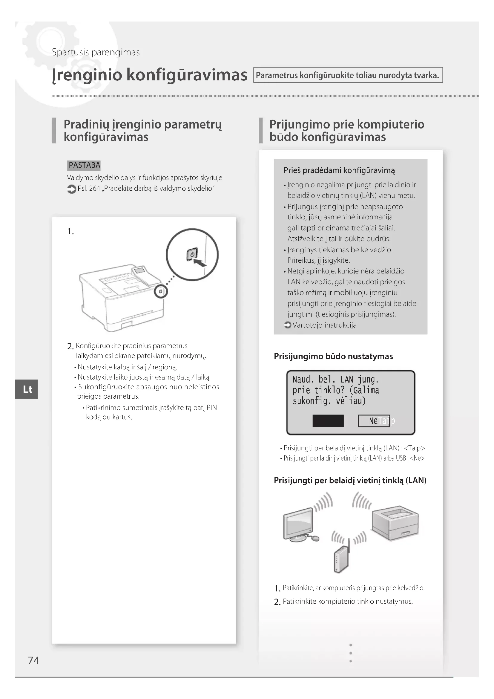4. Pasirinkite prieigos tašką (SSID).5. Įveskite WEP kodą (tinklo kodą) ir pasirinkite <Taikyti>.6. Pasirinkite<Taip>.•Palaukite,kolpasirodyspranešimas<Prijungta.>.7. Pasirinkite<Uždaryti>.•PerkeliasminutesIPadresasbussukonfigūruotas automatiškai. Įdiekite tvarkyklę ir programinę įrangą. Psl. 76 „Programinės įrangos diegimas“Pradinių parametrų konfigūravimas baigtas.Prisijungti per laidinį vietinį tinklą (LAN)Įrenginys tiekiamas be LAN kabelio.Prireikus, jį įsigykite. Patikrinkite, ar kompiuteris prijungtas prie kelvedžio. Patikrinkite kompiuterio tinklo nustatymus. Prijunkite LAN kabelį.•Prijungękabelį,palaukitekeliasminutes(IPadresas bus nustatytas automatiškai).•JeikompiuteryjenustatytasstatinisIPadresas,nustatykite įrenginio IP adresą rankiniu būdu. Įdiekite tvarkyklę ir programinę įrangą. Psl. 76 „Programinės įrangos diegimas“Pradinių parametrų konfigūravimas baigtas.