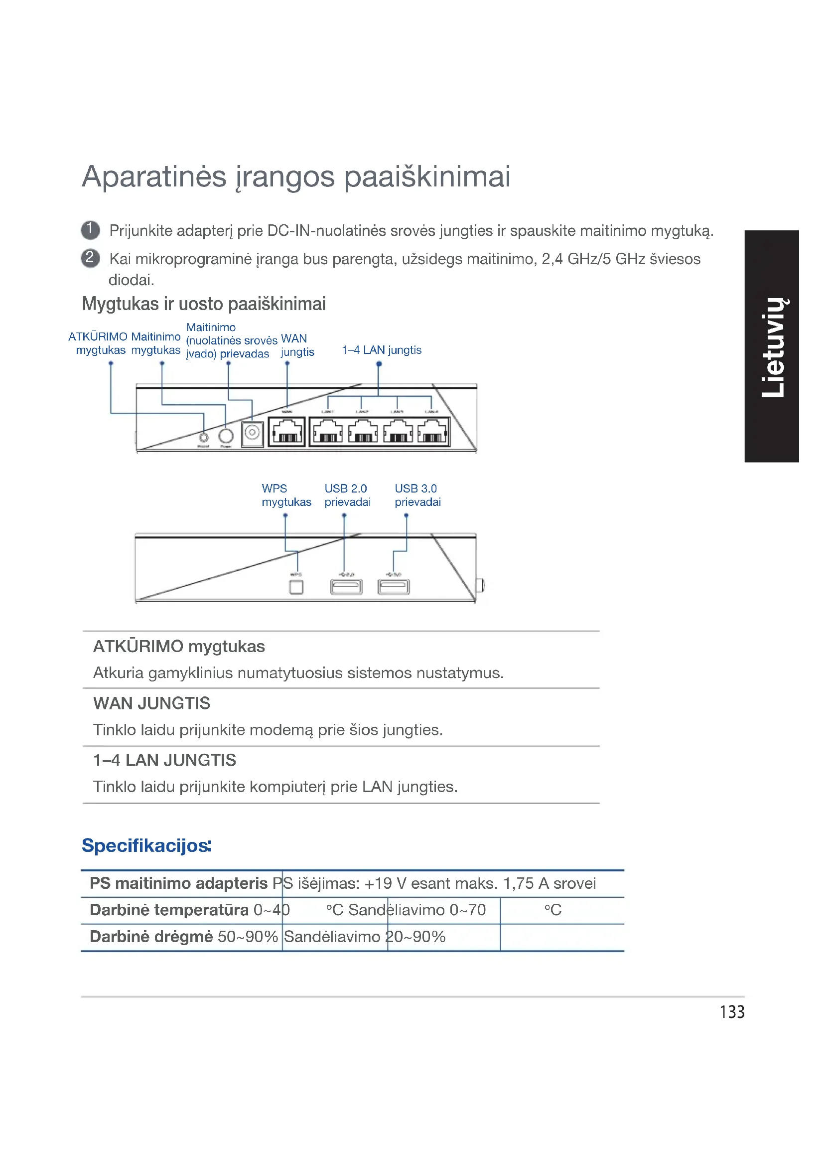 Kai mikroprograminė įranga bus parengta, užsidegs maitinimo, 2,4 GHz/5 GHz šviesos diodai. Aparatinės įrangos paaiškinimai Mygtukas ir uosto paaiškinimai ATKŪRIMO mygtukas Atkuria gamyklinius numatytuosius sistemos nustatymus. WAN JUNGTIS Tinklo laidu prijunkite modemą prie šios jungties. 1–4 LAN JUNGTIS Tinklo laidu prijunkite kompiuterį prie LAN jungties. WPS mygtukasMaitinimo mygtukasMaitinimo (nuolatinės srovės įvado) prievadas WAN jungtis1–4 LAN jungtisATKŪRIMO mygtukasUSB 2.0 prievadaiUSB 3.0 prievadai PS maitinimo adapteris PS išėjimas: +19 V esant maks. 1,75 A srovei Darbinė temperatūra 0~40