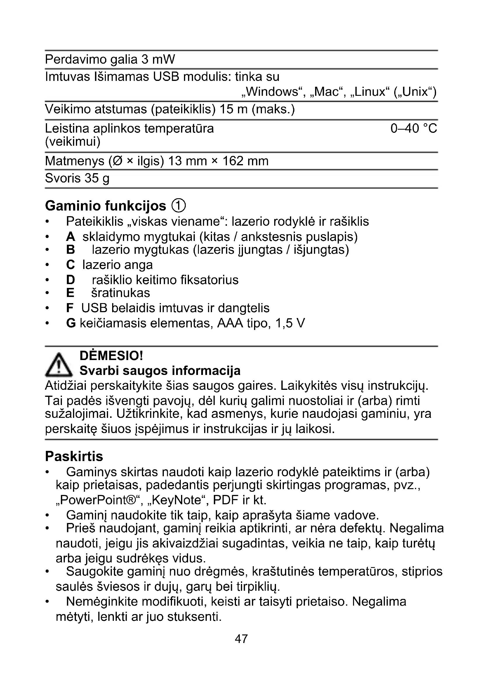 Techniniai duomenys Veikimoįtampa NS 1,5 V (AAA elementas) Lazerioišėjimogalia <1 mW Lazerio bangos ilgis 630–680 nm (raudona) Lazerioklasė 2 Pateikiklio veikimas RD transliavimas, 2,4 GHz diapazonas Siųstuvas Įmontuotasįkotelį47 Perdavimo galia 3 mW Imtuvas IšimamasUSBmodulis:tinkasu „Windows“, „Mac“, „Linux“ („Unix“) Veikimo atstumas (pateikiklis) 15 m (maks.) Leistinaaplinkostemperatūra (veikimui) 0–40 °C Matmenys (Ø × ilgis) 13 mm × 162 mm Svoris 35 g Gaminio funkcijos