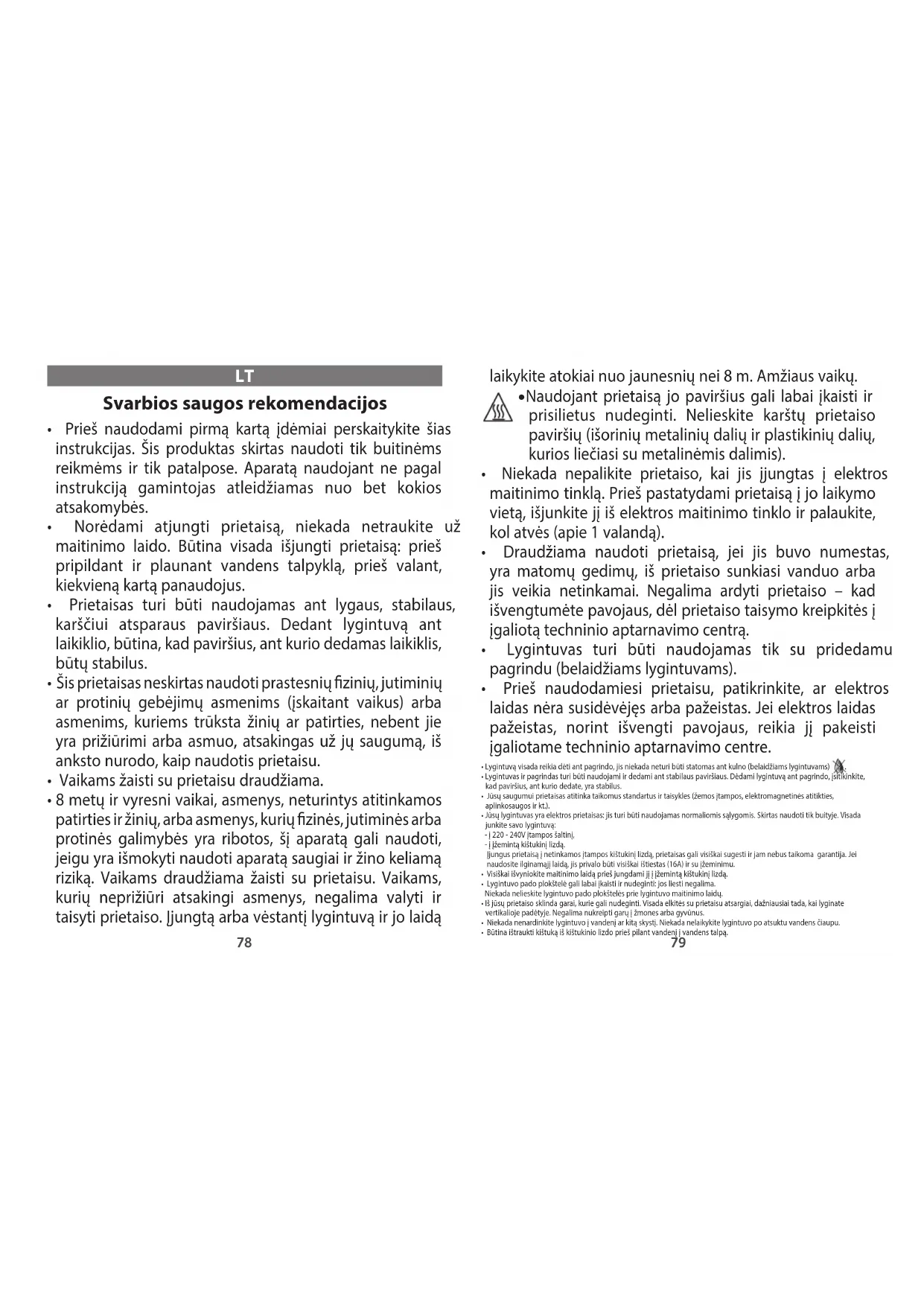 - 8 metų ir vyresni vaikai, asmenys, neturintys atitinkamos patirties ir žinių, arba asmenys, kurių zinės, jutiminės arba protinės galimybės yra ribotos, šį aparatą gali naudoti, jeigu yra išmokyti naudoti aparatą saugiai ir žino keliamą riziką. Vaikams draudžiama žaisti su prietaisu. Vaikams, kurių neprižiūri atsakingi asmenys, negalima valyti ir taisyti prietaiso. Įjungtą arba vėstantį lygintuvą ir jo laidą 78LV Svarīgi ieteikumi drošībai