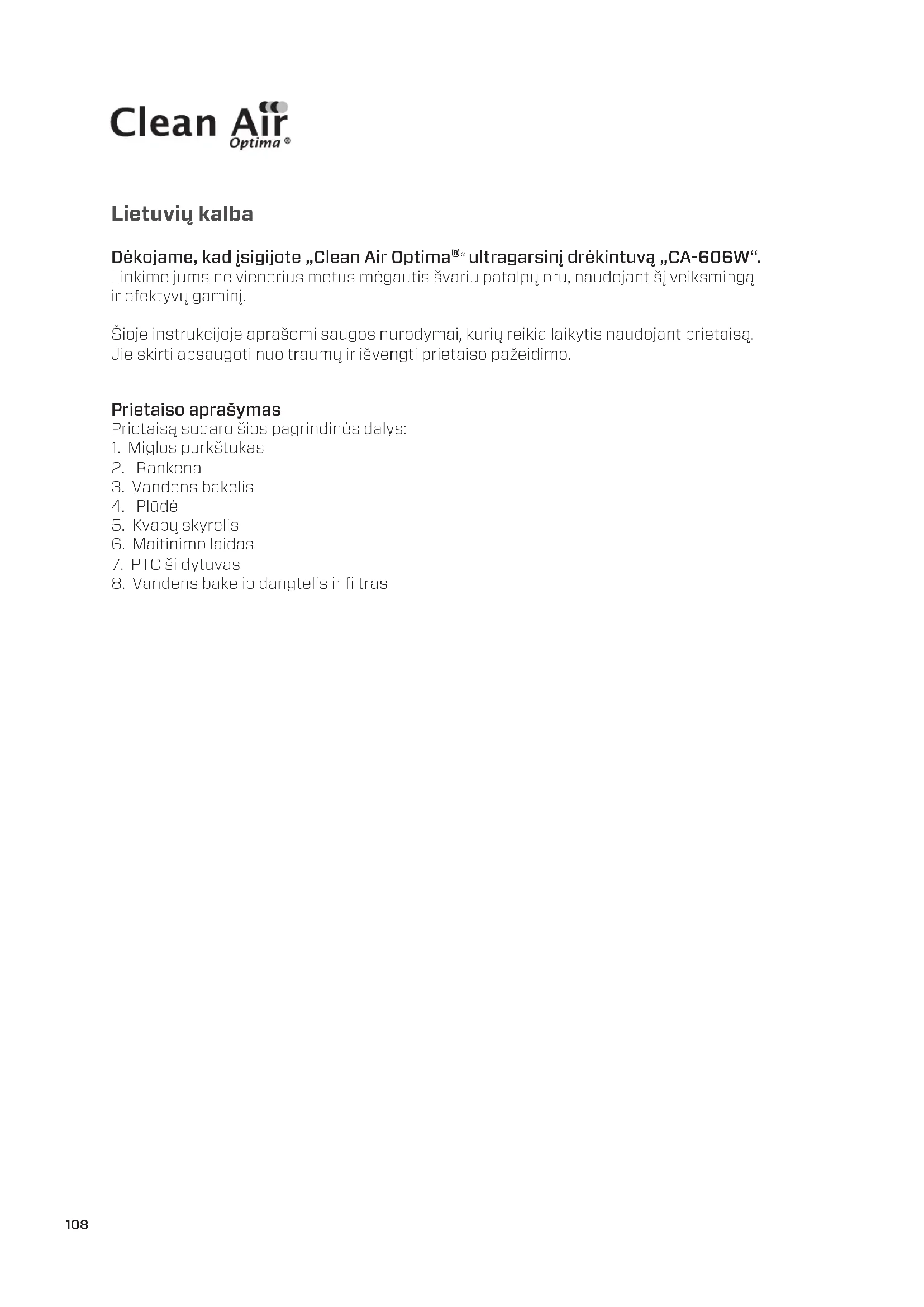 Dėkojame, kad įsigijote „Clean Air Optima®“ ultragarsinį drėkintuvą „CA-606W“.