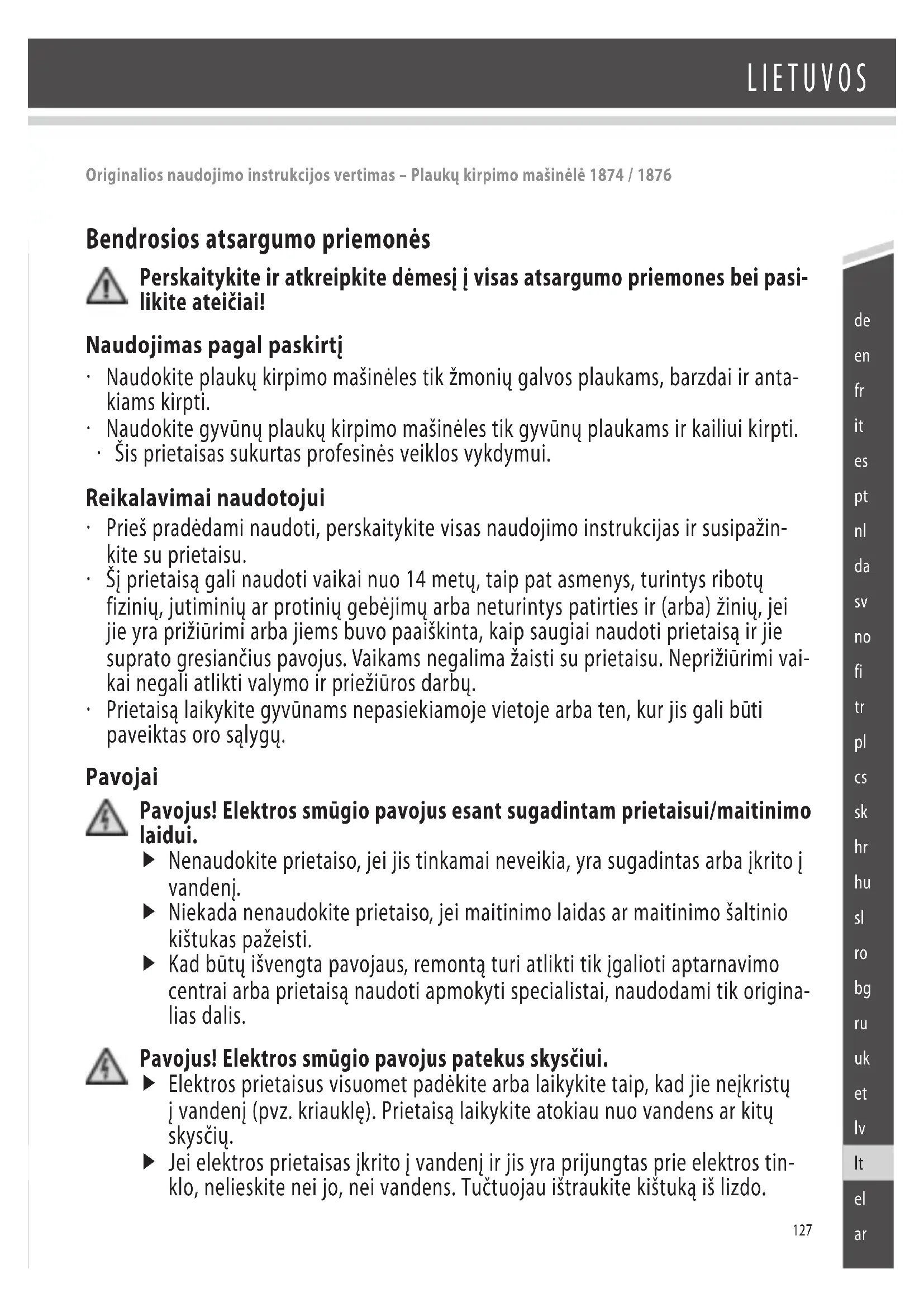 - Prietaisą laikykite gyvūnams nepasiekiamoje vietoje arba ten, kur jis gali būti paveiktas oro sąlygų. Pavojai Pavojus! Elektros smūgio pavojus esant sugadintam prietaisui/maitinimo laidui. f Nenaudokite prietaiso, jei jis tinkamai neveikia, yra sugadintas arba į krito į vandenį. f Niekada nenaudokite prietaiso, jei maitinimo laidas ar maitinimo šaltinio kištukas pažeisti. f Kad būtų išvengta pavojaus, remontą turi atlikti tik į galioti aptarnavimo centrai arba prietaisą naudoti apmokyti specialistai, naudodami tik origina- lias dalis. Pavojus! Elektros smūgio pavojus patekus skysčiui. f Elektros prietaisus visuomet padėkite arba laikykite taip, kad jie neįkristų į vandenį (pvz. kriauklę). Prietaisą laikykite atokiau nuo vandens ar kitų skysčių. f Jei elektros prietaisas įkrito į vandenį ir jis yra prijungtas prie elektros tin- klo, nelieskite nei jo, nei vandens. Tučtuojau ištraukite kištuką iš lizdo. Originalios naudojimo instrukcijos vertimas – Plaukų kirpimo mašinėlė 1874 / 1876128 LIETUVOS