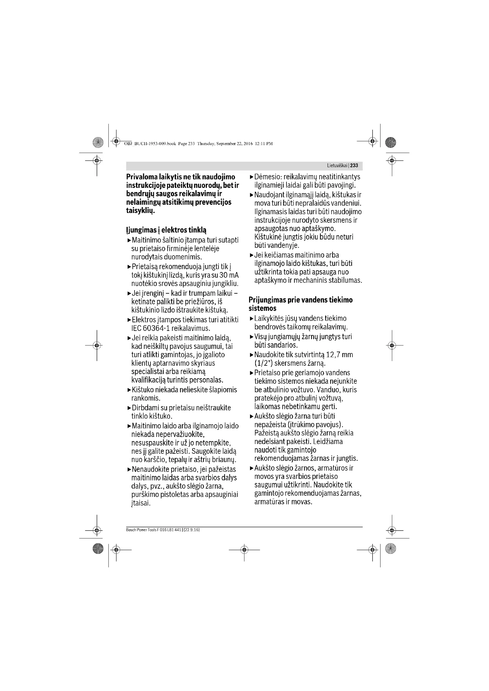 =4,7 =1,5 OBJ_BUCH-1953-009.book Page 236 Thursday, September 22, 2016 12:11 PMLietuviškai | 237 Bosch Power Tools F 016 L81 441 | (22.9.16) Montavimas ir naudojimas Paruošimas eksploatuoti Jūsų saugumui Dėmesio! Prieš pradėdami techninės priežiūros arba valymo darbus prietaisą išjunkite ir iš lizdo ištraukite kištuką. Tą patį būtina padaryti, jei buvo pažeistas, įpjautas ar susipainiojo maitinimo laidas. Darbinė įtampa yra 230 V AC, 50 Hz (ne ES šalyse 220 V, 240 V atitinkamai pagal modelį). Naudokite tik aprobuotus ilginamuosius laidus. Informacijos galite gauti įgaliotame klientų aptarnavimo skyriuje. Jei dirbdami su aukšto slėgio plovimo įrenginiu norite naudoti ilginamąjį laidą, jo skersmuo turi būti ne mažesnis kaip: – 1,5mm