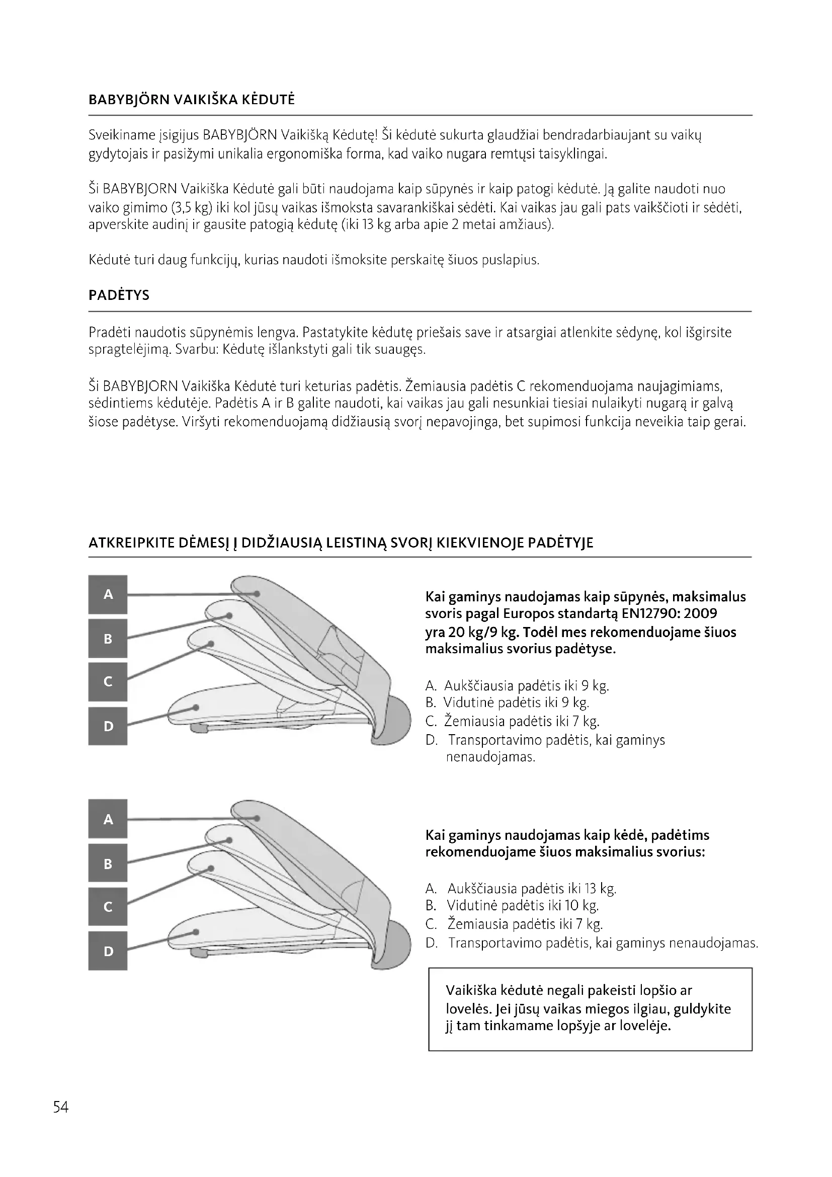 Sveikiname įsigijus BABYBJÖRN Vaikišką Kėdutę! Ši kėdutė sukurta glaudžiai bendradarbiaujant su vaikų gydytojais ir pasižymi unikalia ergonomiška forma, kad vaiko nugara remtųsi taisyklingai. Ši BABYBJORN Vaikiška Kėdutė gali būti naudojama kaip sūpynės ir kaip patogi kėdutė. Ją galite naudoti nuo vaiko gimimo (3,5 kg) iki kol jūsų vaikas išmoksta savarankiškai sėdėti. Kai vaikas jau gali pats vaikščioti ir sėdėti, apverskite audinį ir gausite patogią kėdutę (iki 13 kg arba apie 2 metai amžiaus). Kėdutė turi daug funkcijų, kurias naudoti išmoksite perskaitę šiuos puslapius. Kai gaminys naudojamas kaip sūpynės, maksimalus svoris pagal Europos standartą EN12790: 2009 yra 20 kg/9 kg. Todėl mes rekomenduojame šiuos maksimalius svorius padėtyse. A. Aukščiausia padėtis iki 9 kg. B. Vidutinė padėtis iki 9 kg. C. Žemiausia padėtis iki 7 kg. D. Transportavimo padėtis, kai gaminys nenaudojamas. ATKREIPKITE DĖMESĮ Į DIDŽIAUSIĄ LEISTINĄ SVORĮ KIEKVIENOJE PADĖTYJE Kai gaminys naudojamas kaip kėdė, padėtims rekomenduojame šiuos maksimalius svorius: A. Aukščiausia padėtis iki 13 kg. B. Vidutinė padėtis iki 10 kg. C. Žemiausia padėtis iki 7 kg. D. Transportavimo padėtis, kai gaminys nenaudojamas. PADĖTYS Pradėti naudotis sūpynėmis lengva. Pastatykite kėdutę priešais save ir atsargiai atlenkite sėdynę, kol išgirsite spragtelėjimą. Svarbu: Kėdutę išlankstyti gali tik suaugęs. Ši BABYBJORN Vaikiška Kėdutė turi keturias padėtis. Žemiausia padėtis C rekomenduojama naujagimiams, sėdintiems kėdutėje. Padėtis A ir B galite naudoti, kai vaikas jau gali nesunkiai tiesiai nulaikyti nugarą ir galvą šiose padėtyse. Viršyti rekomenduojamą didžiausią svorį nepavojinga, bet supimosi funkcija neveikia taip gerai. Vaikiška kėdutė negali pakeisti lopšio ar lovelės. Jei jūsų vaikas miegos ilgiau, guldykite jį tam tinkamame lopšyje ar lovelėje.55