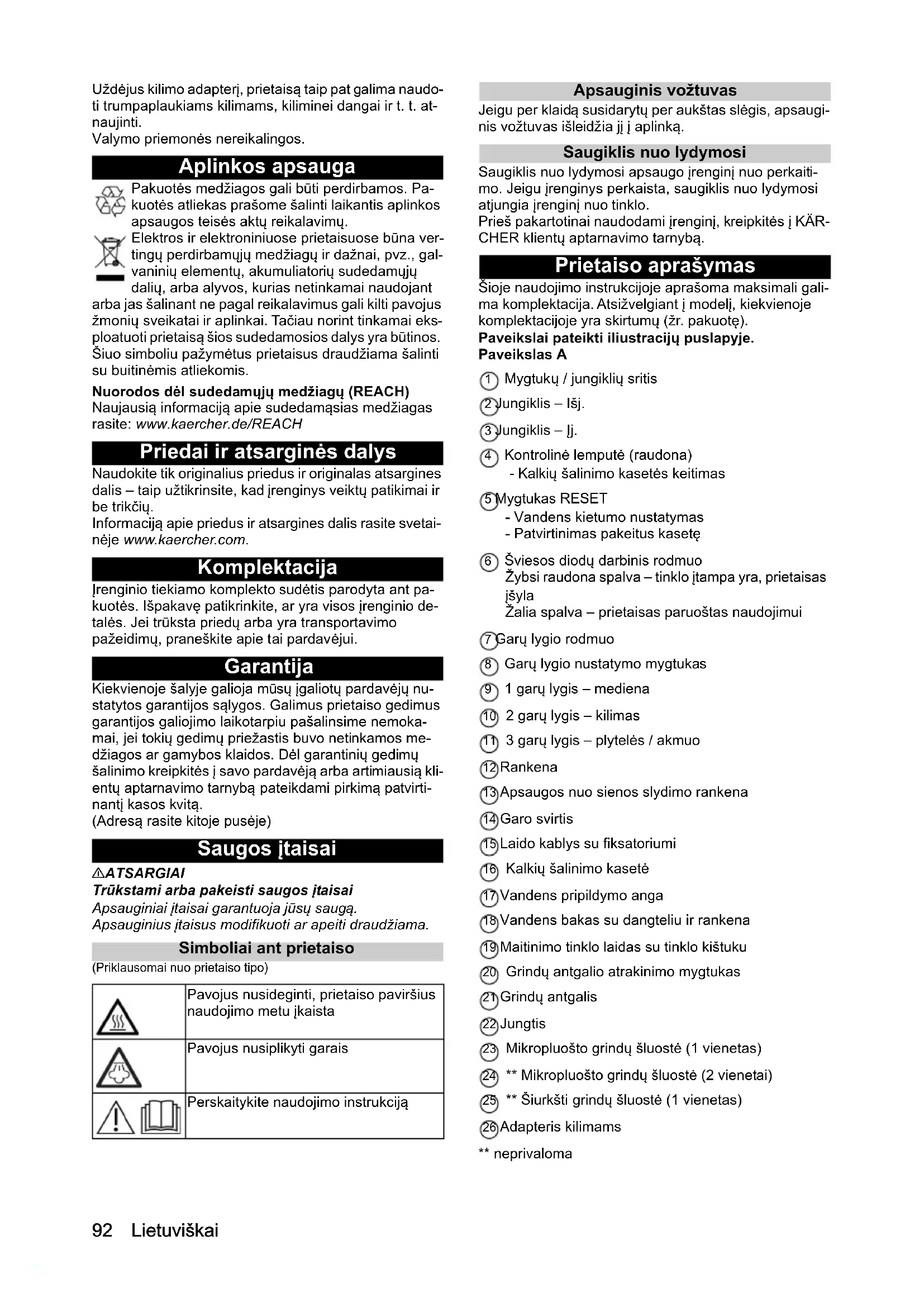 - Techniniai duomenys Lietuviškai Uždėjus kilimo adapterį, prietaisą taip pat galima naudo- ti trumpaplaukiams kilimams, kiliminei dangai ir t. t. at- naujinti. Valymo priemonės nereikalingos. Aplinkos apsauga Pakuotės medžiagos gali būti perdirbamos. Pa- kuotės atliekas prašome šalinti laikantis aplinkos apsaugos teisės aktų reikalavimų. Elektros ir elektroniniuose prietaisuose būna ver- tingų perdirbamųjų medžiagų ir dažnai, pvz., gal- vaninių elementų, akumuliatorių sudedamųjų dalių, arba alyvos, kurias netinkamai naudojant arba jas šalinant ne pagal reikalavimus gali kilti pavojus žmonių sveikatai ir aplinkai. Tačiau norint tinkamai eks- ploatuoti prietaisą šios sudedamosios dalys yra būtinos. Šiuo simboliu pažymėtus prietaisus draudžiama šalinti su buitinėmis atliekomis. Nuorodos dėl sudedamųjų medžiagų (REACH) Naujausią informaciją apie sudedamąsias medžiagas rasite: www.kaercher.de/REACH Priedai ir atsarginės dalys Naudokite tik originalius priedus ir originalas atsargines dalis – taip užtikrinsite, kad įrenginys veiktų patikimai ir be trikčių. Informaciją apie priedus ir atsargines dalis rasite svetai- nėje www.kaercher.com. Komplektacija Įrenginio tiekiamo komplekto sudėtis parodyta ant pa- kuotės. Išpakavę patikrinkite, ar yra visos įrenginio de- talės. Jei trūksta priedų arba yra transportavimo pažeidimų, praneškite apie tai pardavėjui. Garantija Kiekvienoje šalyje galioja mūsų įgaliotų pardavėjų nu- statytos garantijos sąlygos. Galimus prietaiso gedimus garantijos galiojimo laikotarpiu pašalinsime nemoka- mai, jei tokių gedimų priežastis buvo netinkamos me- džiagos ar gamybos klaidos. Dėl garantinių gedimų šalinimo kreipkitės į savo pardavėją arba artimiausią kli- entų aptarnavimo tarnybą pateikdami pirkimą patvirti- nantį kasos kvitą. (Adresą rasite kitoje pusėje) Saugos įtaisai 몇 ATSARGIAI Trūkstami arba pakeisti saugos įtaisai Apsauginiai įtaisai garantuoja jūsų saugą. Apsauginius įtaisus modifikuoti ar apeiti draudžiama. Simboliai ant prietaiso (Priklausomai nuo prietaiso tipo) Apsauginis vožtuvas Jeigu per klaidą susidarytų per aukštas slėgis, apsaugi- nis vožtuvas išleidžia jį į aplinką. Saugiklis nuo lydymosi Saugiklis nuo lydymosi apsaugo įrenginį nuo perkaiti- mo. Jeigu įrenginys perkaista, saugiklis nuo lydymosi atjungia įrenginį nuo tinklo. Prieš pakartotinai naudodami įrenginį, kreipkitės į KÄR- CHER klientų aptarnavimo tarnybą. Prietaiso aprašymas Šioje naudojimo instrukcijoje aprašoma maksimali gali- ma komplektacija. Atsižvelgiant į modelį, kiekvienoje komplektacijoje yra skirtumų (žr. pakuotę). Paveikslai pateikti iliustracijų puslapyje. Paveikslas A 1 Mygtukų / jungiklių sritis 2 Jungiklis – Išj. 3 Jungiklis – Įj. 4 Kontrolinė lemputė (raudona) - Kalkių šalinimo kasetės keitimas 5 Mygtukas RESET - Vandens kietumo nustatymas - Patvirtinimas pakeitus kasetę 6 Šviesos diodų darbinis rodmuo Žybsi raudona spalva – tinklo įtampa yra, prietaisas įšyla Žalia spalva – prietaisas paruoštas naudojimui 7 Garų lygio rodmuo 8 Garų lygio nustatymo mygtukas 9 1 garų lygis – mediena 10 2 garų lygis – kilimas 11 3 garų lygis – plytelės / akmuo 12 Rankena 13 Apsaugos nuo sienos slydimo rankena 14 Garo svirtis 15 Laido kablys su fiksatoriumi 16 Kalkių šalinimo kasetė 17 Vandens pripildymo anga 18 Vandens bakas su dangteliu ir rankena 19 Maitinimo tinklo laidas su tinklo kištuku 20 Grindų antgalio atrakinimo mygtukas 21 Grindų antgalis 22 Jungtis 23 Mikropluošto grindų šluostė (1 vienetas) 24 ** Mikropluošto grindų šluostė (2 vienetai) 25 ** Šiurkšti grindų šluostė (1 vienetas) 26 Adapteris kilimams ** neprivaloma Pavojus nusideginti, prietaiso paviršius naudojimo metu įkaista Pavojus nusiplikyti garais Perskaitykite naudojimo instrukcijąLietuviškai 93 Pirmasis parengimas eksploatuoti DĖMESIO Prietaiso pažeidimai dėl susikaupusių kalkių Kalkių šalinimo kasetė tinkamai veikia tik tuo atveju, jei- gu prieš 1-ą kartą paleisdami prietaisą, pritaikote jį prie vietos vandens kietumo. Nustatykite prietaise vietos vandens kietumą. Prieš naudodami prietaisą vietoje, kurioje vandens kie- tumas kitoks (pvz., persikrausčius), priderinkite jį prie vietos vandens kietumo p. 9792