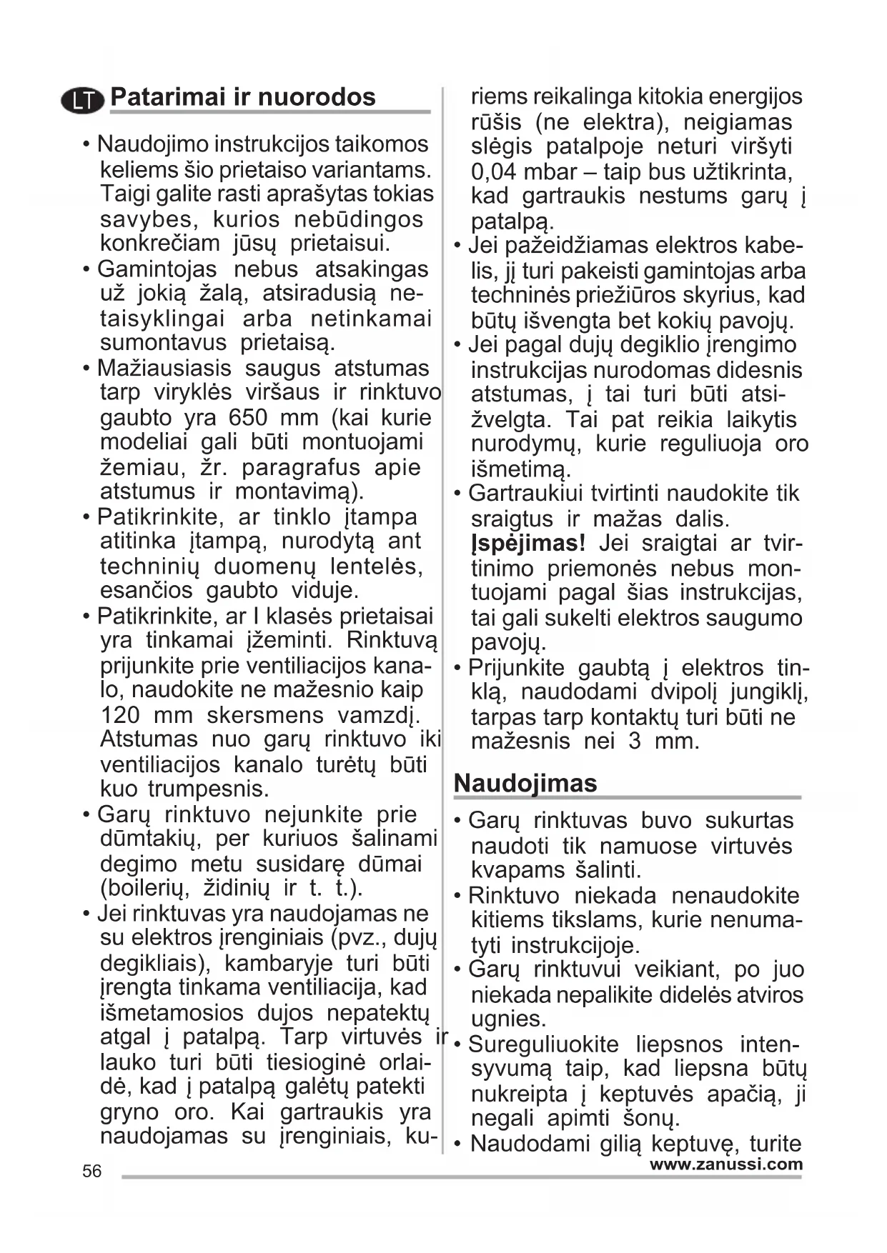 - Garų rinktuvo nejunkite prie dūmtakių, per kuriuos šalinami degimo metu susidarę dūmai (boilerių, židinių ir t. t.).