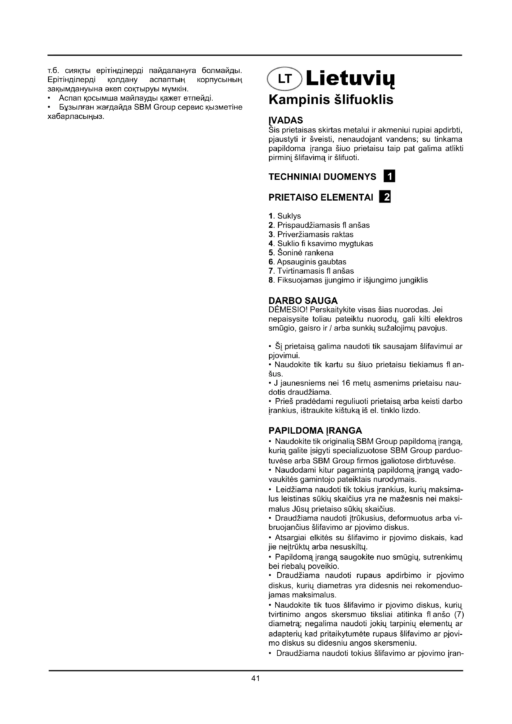 - Бұзылған жағдайда SBM Group сервис қызметіне хабарласыңыз. Kampinis šlifuoklis ĮVADAS Šis prietaisas skirtas metalui ir akmeniui rupiai apdirbti, pjaustyti ir šveisti, nenaudojant vandens; su tinkama papildoma įranga šiuo prietaisu taip pat galima atlikti pirminį šlifavimą ir šlifuoti. TECHNINIAI DUOMENYS 1 PRIETAISO ELEMENTAI 2 1. Suklys2. Prispaudžiamasis fl anšas3. Priveržiamasis raktas4. Suklio fi ksavimo mygtukas5. Šoninė rankena6. Apsauginis gaubtas7. Tvirtinamasis fl anšas8. Fiksuojamas įjungimo ir išjungimo jungiklis DARBO SAUGA DĖMESIO! Perskaitykite visas šias nuorodas. Jeinepaisysite toliau pateiktu nuorodų, gali kilti elektros smūgio, gaisro ir / arba sunkių sužalojimų pavojus.