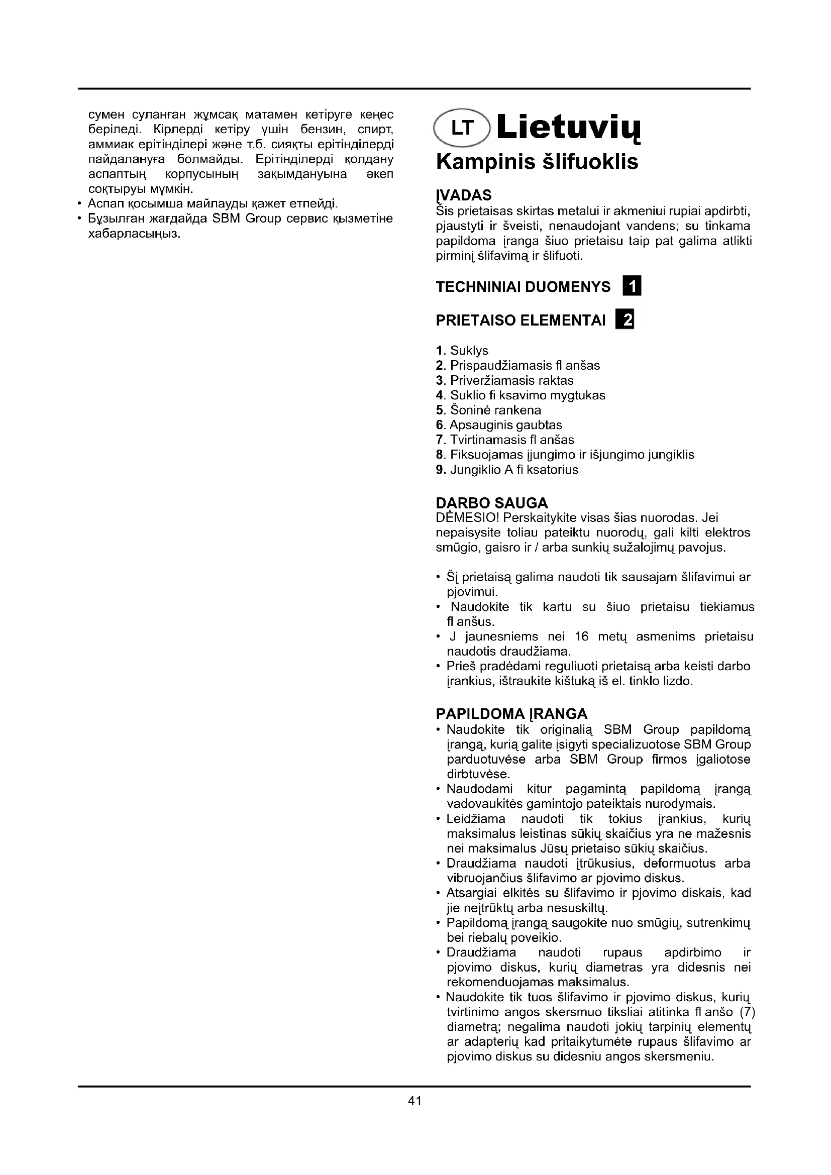 - Бұзылған жағдайда SBM Group сервис қызметіне хабарласыңыз. Kampinis šlifuoklis ĮVADAS Šis prietaisas skirtas metalui ir akmeniui rupiai apdirbti, pjaustyti ir šveisti, nenaudojant vandens; su tinkama papildoma įranga šiuo prietaisu taip pat galima atlikti pirminį šlifavimą ir šlifuoti. TECHNINIAI DUOMENYS 1 PRIETAISO ELEMENTAI 2 1. Suklys2. Prispaudžiamasis fl anšas3. Priveržiamasis raktas4. Suklio fi ksavimo mygtukas5. Šoninė rankena6. Apsauginis gaubtas7. Tvirtinamasis fl anšas8. Fiksuojamas įjungimo ir išjungimo jungiklis9. Jungiklio A fi ksatorius DARBO SAUGA DĖMESIO! Perskaitykite visas šias nuorodas. Jeinepaisysite toliau pateiktu nuorodų, gali kilti elektros smūgio, gaisro ir / arba sunkių sužalojimų pavojus.