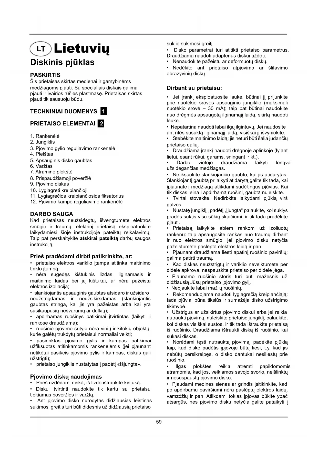 - Pjaudami medines sienas ar grindis įsitikinkite, kad po apdirbamu paviršiumi nėra paslėptų elektros laidų, vamzdžių ir pan. Atlikdami tokias įpjovas būkite ypač atsargūs, nes pjovimo disku netyčia galite pataikyti į60 paslėptą kliūtį. • Jei kyla daug dulkių, dirbkite su respiratorium. Jei yra galimybė, naudokite dulkių nusiurbimo sistemą.