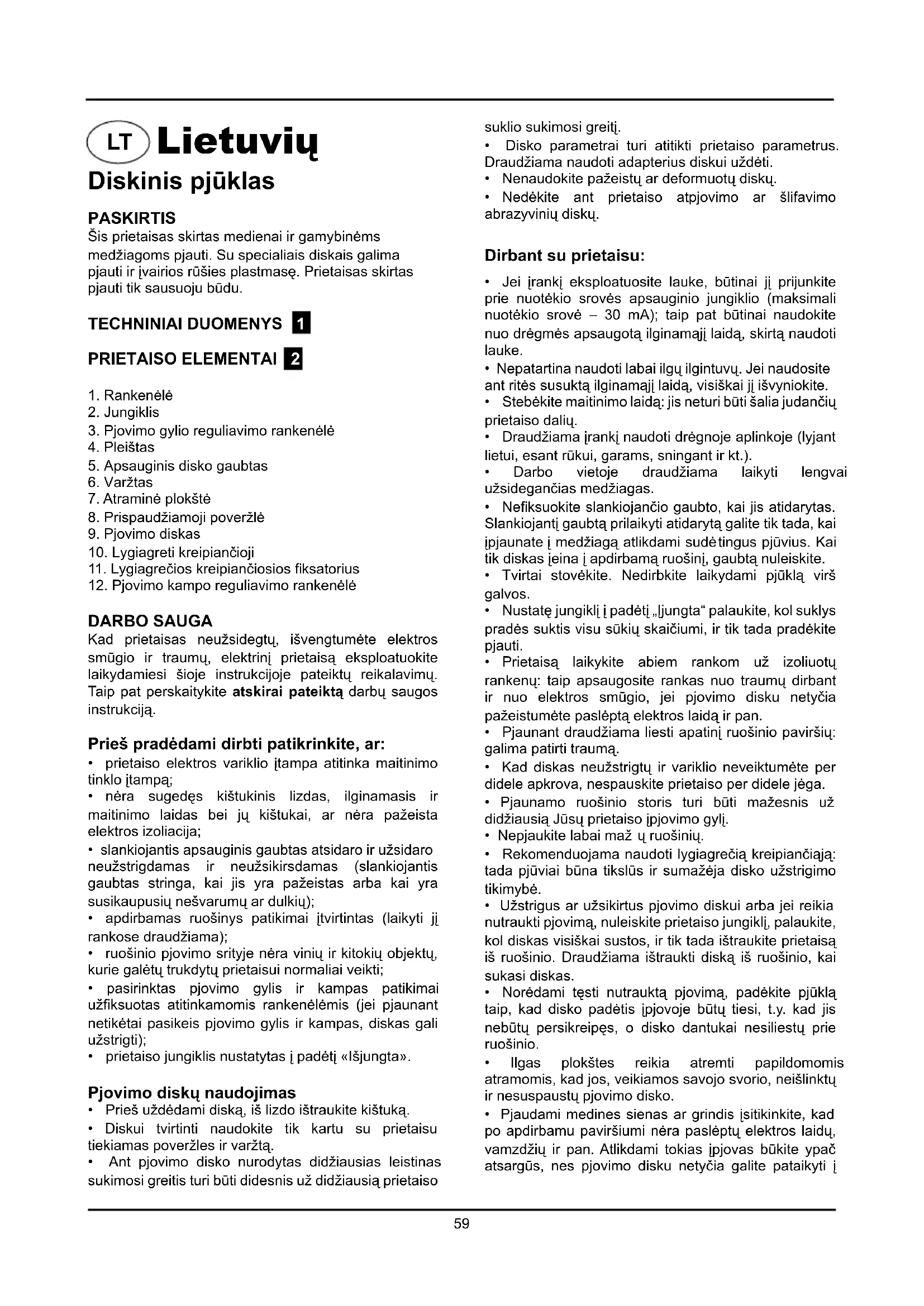 - Užstrigus ar užsikirtus p jovimo diskui arba jei reikia nutraukti p jovima, nuleiskite prietaiso jungikl, palaukite, kol diskas visiskai sustos, ir tik tada ištraukite prietaisa is ruosinio. Draudžiama ištraukti diska is ruosinio, kai sukasi diskas.