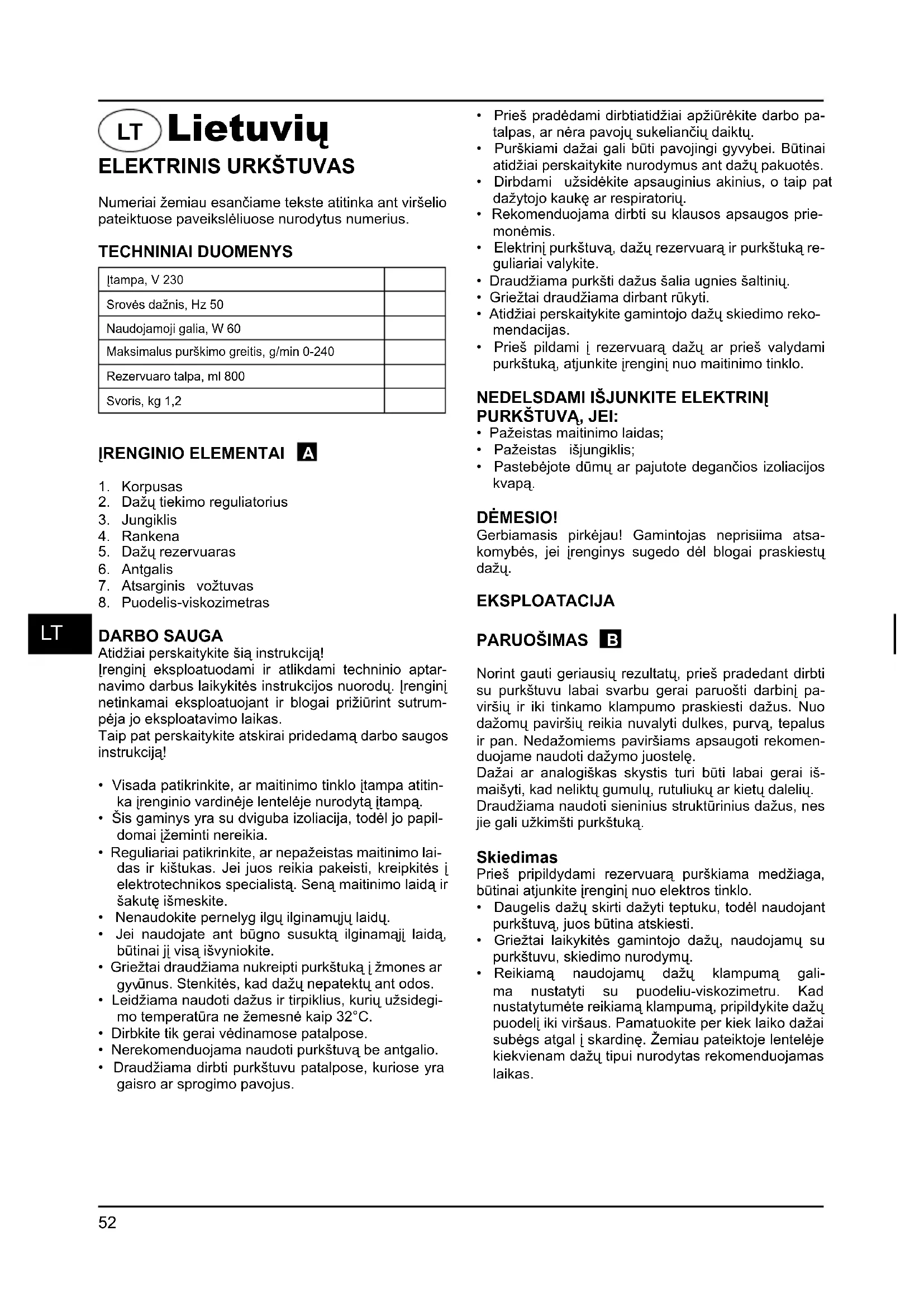- Pastebėjote dūmų ar pajutote degančios izoliacijos kvapą. DĖMESIO! Gerbiamasis pirkėjau! Gamintojas neprisiima atsa- komybės, jei įrenginys sugedo dėl blogai praskiestų dažų. EKSPLOATACIJA