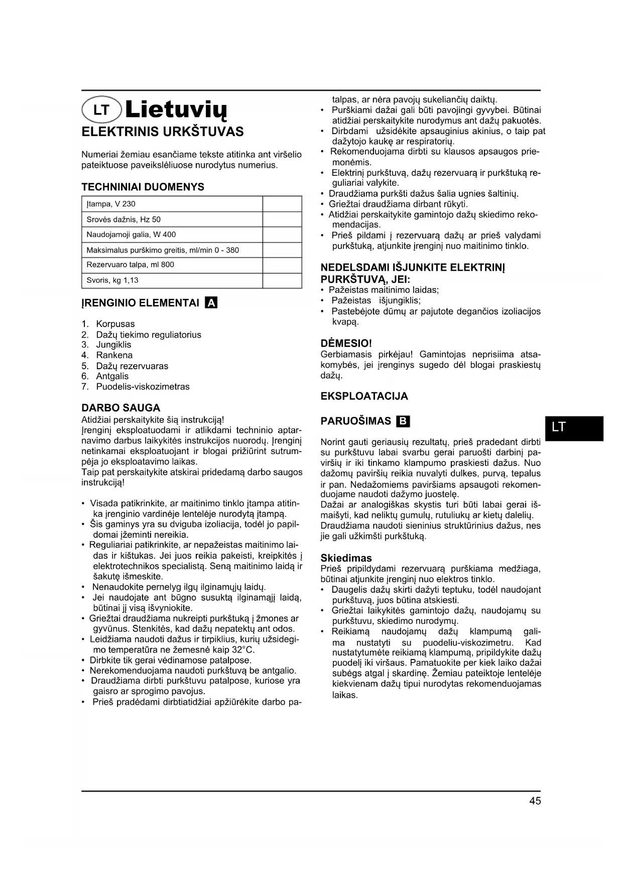 Numeriai žemiau esančiame tekste atitinka ant viršelio pateiktuose paveikslėliuose nurodytus numerius. TECHNINIAI DUOMENYS Įtampa, V 230Srovės dažnis, Hz 50Naudojamoji galia, W 400Maksimalus purškimo greitis, ml/min 0 - 380Rezervuaro talpa, ml 800 Svoris, kg 1,13