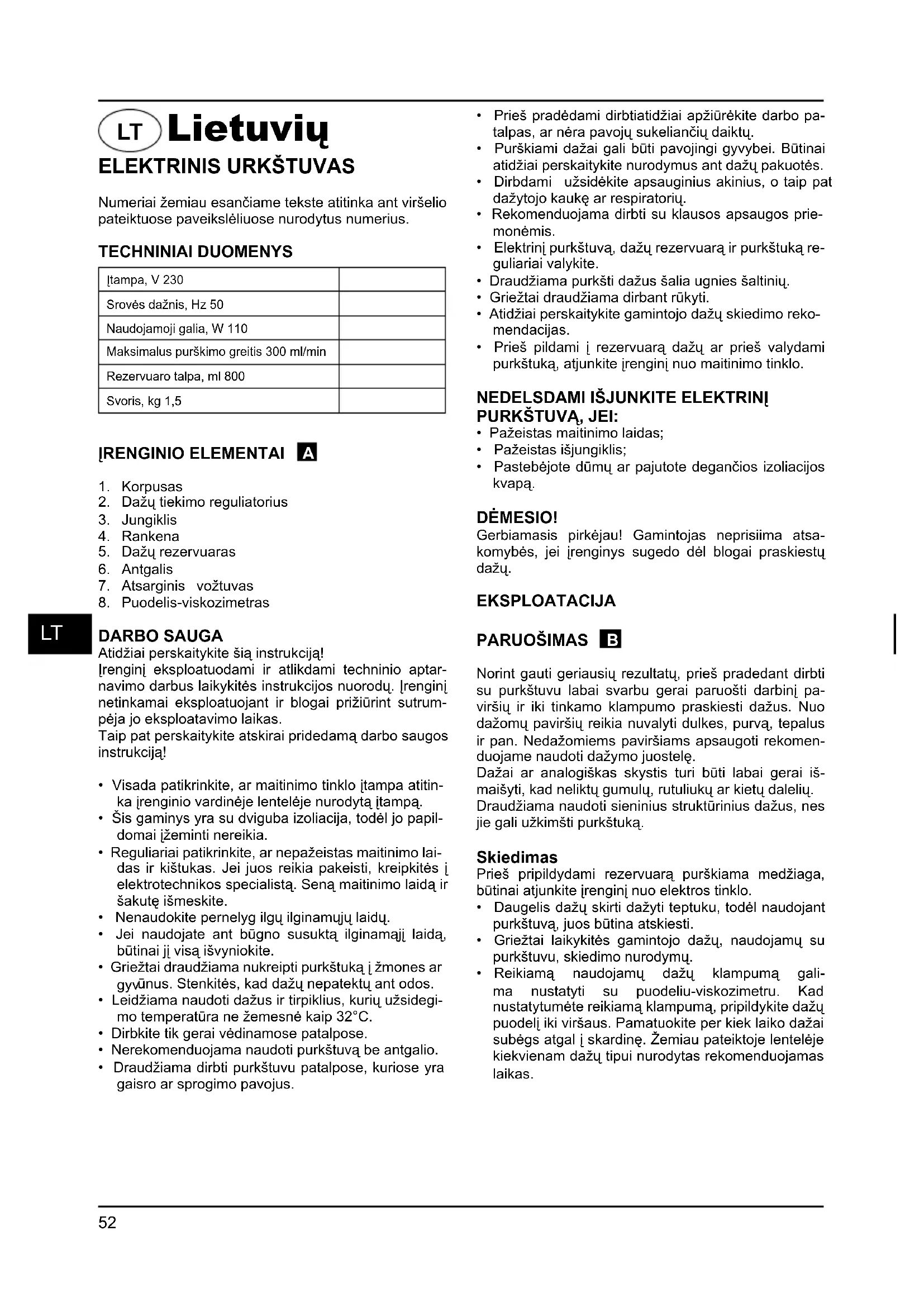 Numeriai žemiau esančiame tekste atitinka ant viršelio pateiktuose paveikslėliuose nurodytus numerius. TECHNINIAI DUOMENYS Įtampa, V 230Srovės dažnis, Hz 50Naudojamoji galia, W 110Maksimalus purškimo greitis 300 ml/minRezervuaro talpa, ml 800Svoris, kg 1,5