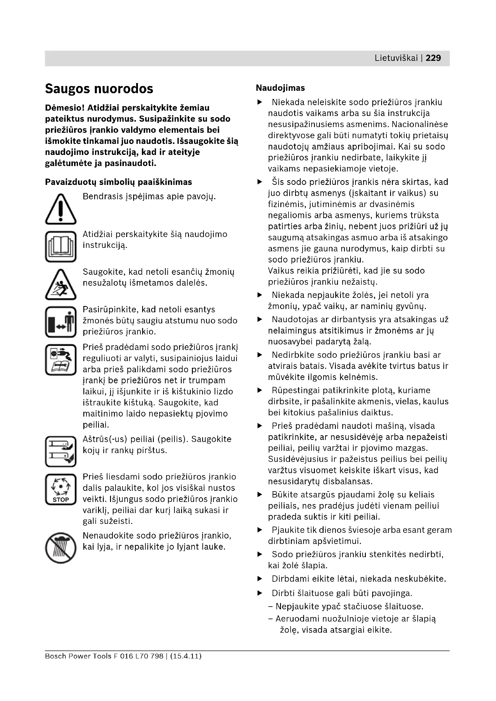 Saugos nuorodos Dėmesio! Atidžiai perskaitykite žemiau pateiktus nurodymus. Susipažinkite su sodo priežiūros įrankio valdymo elementais bei išmokite tinkamai juo naudotis. Išsaugokite šią naudojimo instrukciją, kad ir ateityje galėtumėte ja pasinaudoti. Pavaizduotų simbolių paaiškinimas Bendrasis įspėjimas apie pavojų. Atidžiai perskaitykite šią naudojimo instrukciją. Saugokite, kad netoli esančių žmonių nesužalotų išmetamos dalelės. Pasirūpinkite, kad netoli esantys žmonės būtų saugiu atstumu nuo sodo priežiūros įrankio. Prieš pradėdami sodo priežiūros įrankį reguliuoti ar valyti, susipainiojus laidui arba prieš palikdami sodo priežiūros įrankį be priežiūros net ir trumpam laikui, jį išjunkite ir iš kištukinio lizdo ištraukite kištuką. Saugokite, kad maitinimo laido nepasiektų pjovimo peiliai. Aštrūs(-us) peiliai (peilis). Saugokite kojų ir rankų pirštus. Prieš liesdami sodo priežiūros įrankio dalis palaukite, kol jos visiškai nustos veikti. Išjungus sodo priežiūros įrankio variklį, peiliai dar kurį laiką sukasi ir gali sužeisti. Nenaudokite sodo priežiūros įrankio, kai lyja, ir nepalikite jo lyjant lauke. Naudojimas f Niekada neleiskite sodo priežiūros įrankiu naudotis vaikams arba su šia instrukcija nesusipažinusiems asmenims. Nacionalinėse direktyvose gali būti numatyti tokių prietaisų naudotojų amžiaus apribojimai. Kai su sodo priežiūros įrankiu nedirbate, laikykite jį vaikams nepasiekiamoje vietoje. f Šis sodo priežiūros įrankis nėra skirtas, kad juo dirbtų asmenys (įskaitant ir vaikus) su fizinėmis, jutiminėmis ar dvasinėmis negaliomis arba asmenys, kuriems trūksta patirties arba žinių, nebent juos prižiūri už jų saugumą atsakingas asmuo arba iš atsakingo asmens jie gauna nurodymus, kaip dirbti su sodo priežiūros įrankiu. Vaikus reikia prižiūrėti, kad jie su sodo priežiūros įrankiu nežaistų. f Niekada nepjaukite žolės, jei netoli yra žmonių, ypač vaikų, ar naminių gyvūnų. f Naudotojas ar dirbantysis yra atsakingas už nelaimingus atsitikimus ir žmonėms ar jų nuosavybei padarytą žalą. f Nedirbkite sodo priežiūros įrankiu basi ar atvirais batais. Visada avėkite tvirtus batus ir mūvėkite ilgomis kelnėmis. f Rūpestingai patikrinkite plotą, kuriame dirbsite, ir pašalinkite akmenis, vielas, kaulus bei kitokius pašalinius daiktus. f Prieš pradėdami naudoti mašiną, visada patikrinkite, ar nesusidėvėję arba nepažeisti peiliai, peilių varžtai ir pjovimo mazgas. Susidėvėjusius ir pažeistus peilius bei peilių varžtus visuomet keiskite iškart visus, kad nesusidarytų disbalansas. f Būkite atsargūs pjaudami žolę su keliais peiliais, nes pradėjus judėti vienam peiliui pradeda suktis ir kiti peiliai. f Pjaukite tik dienos šviesoje arba esant geram dirbtiniam apšvietimui. f Sodo priežiūros įrankiu stenkitės nedirbti, kai žolė šlapia. f Dirbdami eikite lėtai, niekada neskubėkite. f Dirbti šlaituose gali būti pavojinga. – Nepjaukite ypač stačiuose šlaituose. – Aeruodami nuožulnioje vietoje ar šlapią žolę, visada atsargiai eikite. STOP OBJ_BUCH-1393-001.book Page 229 Friday, April 15, 2011 10:36 AM230 | Lietuviškai F 016 L70 798 | (15.4.11) Bosch Power Tools – Nuožulniose vietose visada pjaukite tik skersai šlaito, o ne aukštyn – žemyn. – Keisdami kryptį šlaituose būkite ypač atsargūs. – Eidami atbuli ar traukdami sodo priežiūros įrankį būkite ypač atsargūs. – Pjaudami žolę, sodo priežiūros įrankį visada stumkite pirmyn ir niekada jo netraukite link savęs. f Norint sodo priežiūros įrankį paversti ir pervežti per neapželdintą teritoriją arba pergabenti iš vienos darbo vietos į kitą, būtina, kad sodo priežiūros įrankio peiliai būtų sustoję. f Įjungdami variklį, sodo priežiūros įrankio neverskite, nebent tai yra būtina jį įjungiant aukštoje žolėje. Tokiu atveju, paspaudžiant rankeną žemyn jį galima paversti tik tiek, kiek yra būtina, ir tik į priešingą nuo naudotojo pusę. Sodo priežiūros įrankį nuleidžiant žemyn, abi jūsų rankos turi būti ant rankenos. f Sodo priežiūros įrankį įjunkite laikydamiesi naudojimo instrukcijoje pateiktų nuorodų ir stebėkite, kad jūsų kojos būtų pakankamai toli nuo besisukančių dalių. f Niekada nekiškite rankų arti besisukančių dalių arba po jomis. f Dirbdami su sodo priežiūros įrankiu laikyki- tės saugaus atstumo nuo išmetimo zonos. f Niekad nekelkite ir neneškite sodo priežiūros įrankio, kai veikia variklis. f Niekada nedirbkite sodo priežiūros įrankiu, jei pažeisti apsauginiai įtaisai, gaubtai arba nėra saugos įtaisų, pvz., apsauginio dangčio ar žolės surinkimo krepšio. f Atlikdami žoliapjovės nustatymo darbus būkite ypač atsargūs, kad išvengtumėte rankų ir pėdų suspaudimo tarp judžių peilių ir stacionarių žoliapjovės dalių. f Maitinimo ir ilginamąjį laidą laikykite toliau nuo peilių. Peiliai gali pažeisti laidus, o jums iškils pavojus prisiliesti prie dalių su įtampa. Atsargiai – iškyla elektros smūgio pavojus. Ištraukite kištuką iš kištukinio lizdo: – visada, kai pasišalinate nuo sodo priežiūros įrankio, – prieš šalindami įstrigusias kliūtis, – kai sodo priežiūros įrankį tikrinate, valote arba reguliuojate, – atsitrenkę kliūtį. Nedelsdami patikrinkite, ar sodo priežiūros įrankis nepažeistas ir, jei reikia, kreipkitės į specialistus dėl remonto, – jei sodo priežiūros įrankis pradeda neįprastai vibruoti (nedelsdami patikrinkite). Įjungimas į elektros tinklą f Maitinimo šaltinio įtampa turi sutapti su sodo priežiūros įrankio firminėje lentelėje nurodytais duomenimis. f Sodo priežiūros įrankį rekomenduojama jungti tik į tokį kištukinį lizdą, kuris yra su 30 mA nuotėkio srovės apsauginiu jungikliu. f Šį sodo priežiūros įrankį naudokite tik su gamintojo pateiktus duo