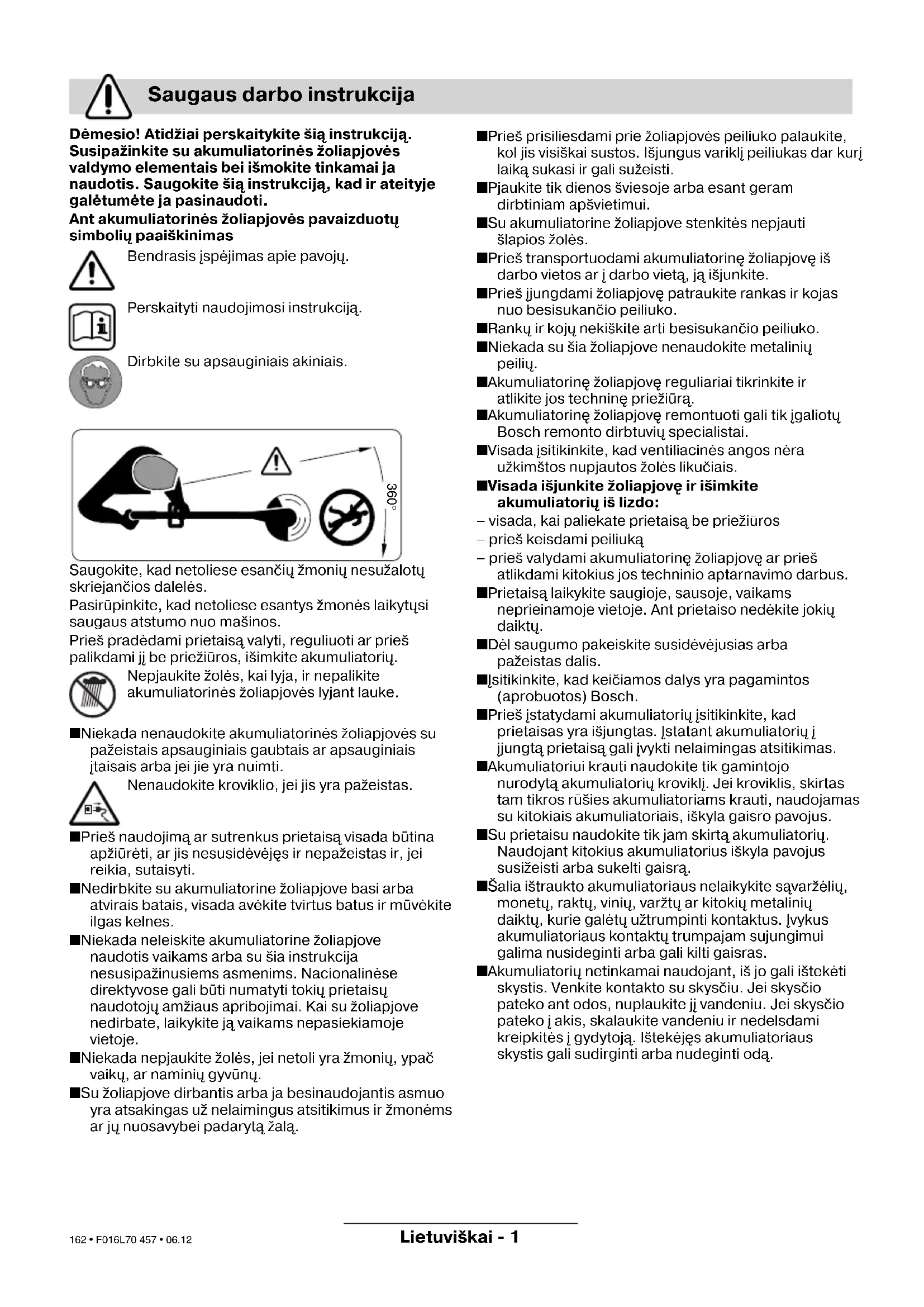 Tiesības uz izmaiām tiek saglabātas Atbrīvošanās no nolietotajiem izstrādājumiem Apkalpošana Deklarācija par atbilstību standartiem F016L70 457.book Seite 6 Montag, 18. Dezember 2006 9:45 09 161 • F016L70 457 • 06.12Lietuviškai - 1 Dėmesio! Atidžiai perskaitykite šią instrukciją. Susipažinkite su akumuliatorinės žoliapjovės valdymo elementais bei išmokite tinkamai ja naudotis. Saugokite šią instrukciją, kad ir ateityje galėtumėte ja pasinaudoti. Ant akumuliatorinės žoliapjovės pavaizduotų simbolių paaiškinimas Bendrasis įspėjimas apie pavojų. Perskaityti naudojimosi instrukciją. Dirbkite su apsauginiais akiniais. Saugokite, kad netoliese esančių žmonių nesužalotų skriejančios dalelės. Pasirūpinkite, kad netoliese esantys žmonės laikytųsi saugaus atstumo nuo mašinos. Prieš pradėdami prietaisą valyti, reguliuoti ar prieš palikdami jį be priežiūros, išimkite akumuliatorių. Nepjaukite žolės, kai lyja, ir nepalikite akumuliatorinės žoliapjovės lyjant lauke. ■ Niekada nenaudokite akumuliatorinės žoliapjovės su pažeistais apsauginiais gaubtais ar apsauginiais įtaisais arba jei jie yra nuimti. Nenaudokite kroviklio, jei jis yra pažeistas. ■ Prieš naudojimą ar sutrenkus prietaisą visada būtina apžiūrėti, ar jis nesusidėvėjęs ir nepažeistas ir, jei reikia, sutaisyti. ■ Nedirbkite su akumuliatorine žoliapjove basi arba atvirais batais, visada avėkite tvirtus batus ir mūvėkite ilgas kelnes. ■ Niekada neleiskite akumuliatorine žoliapjove naudotis vaikams arba su šia instrukcija nesusipažinusiems asmenims. Nacionalinėse direktyvose gali būti numatyti tokių prietaisų naudotojų amžiaus apribojimai. Kai su žoliapjove nedirbate, laikykite ją vaikams nepasiekiamoje vietoje. ■ Niekada nepjaukite žolės, jei netoli yra žmonių, ypač vaikų, ar naminių gyvūnų. ■ Su žoliapjove dirbantis arba ja besinaudojantis asmuo yra atsakingas už nelaimingus atsitikimus ir žmonėms ar jų nuosavybei padarytą žalą. ■ Prieš prisiliesdami prie žoliapjovės peiliuko palaukite, kol jis visiškai sustos. Išjungus variklį peiliukas dar kurį laiką sukasi ir gali sužeisti. ■ Pjaukite tik dienos šviesoje arba esant geram dirbtiniam apšvietimui. ■ Su akumuliatorine žoliapjove stenkitės nepjauti šlapios žolės. ■ Prieš transportuodami akumuliatorinę žoliapjovę iš darbo vietos ar į darbo vietą, ją išjunkite. ■ Prieš įjungdami žoliapjovę patraukite rankas ir kojas nuo besisukančio peiliuko. ■ Rankų ir kojų nekiškite arti besisukančio peiliuko. ■ Niekada su šia žoliapjove nenaudokite metalinių peilių. ■ Akumuliatorinę žoliapjovę reguliariai tikrinkite ir atlikite jos techninę priežiūrą. ■ Akumuliatorinę žoliapjovę remontuoti gali tik įgaliotų Bosch remonto dirbtuvių specialistai. ■ Visada įsitikinkite, kad ventiliacinės angos nėra užkimštos nupjautos žolės likučiais. ■ Visada išjunkite žoliapjovę ir išimkite akumuliatorių iš lizdo: – visada, kai paliekate prietaisą be priežiūros – prieš keisdami peiliuką – prieš valydami akumuliatorinę žoliapjovę ar prieš atlikdami kitokius jos techninio aptarnavimo darbus. ■ Prietaisą laikykite saugioje, sausoje, vaikams neprieinamoje vietoje. Ant prietaiso nedėkite jokių daiktų. ■ Dėl saugumo pakeiskite susidėvėjusias arba pažeistas dalis. ■ Įsitikinkite, kad keičiamos dalys yra pagamintos (aprobuotos) Bosch. ■ Prieš įstatydami akumuliatorių įsitikinkite, kad prietaisas yra išjungtas. Įstatant akumuliatorių į įjungtą prietaisą gali įvykti nelaimingas atsitikimas. ■ Akumuliatoriui krauti naudokite tik gamintojo nurodytą akumuliatorių kroviklį. Jei kroviklis, skirtas tam tikros rūšies akumuliatoriams krauti, naudojamas su kitokiais akumuliatoriais, iškyla gaisro pavojus. ■ Su prietaisu naudokite tik jam skirtą akumuliatorių. Naudojant kitokius akumuliatorius iškyla pavojus susižeisti arba sukelti gaisrą. ■ Šalia ištraukto akumuliatoriaus nelaikykite sąvaržėlių, monetų, raktų, vinių, varžtų ar kitokių metalinių daiktų, kurie galėtų užtrumpinti kontaktus. Įvykus akumuliatoriaus kontaktų trumpajam sujungimui galima nusideginti arba gali kilti gaisras. ■ Akumuliatorių netinkamai naudojant, iš jo gali ištekėti skystis. Venkite kontakto su skysčiu. Jei skysčio pateko ant odos, nuplaukite jį vandeniu. Jei skysčio pateko į akis, skalaukite vandeniu ir nedelsdami kreipkitės į gydytoją. Ištekėjęs akumuliatoriaus skystis gali sudirginti arba nudeginti odą. Saugaus darbo instrukcija 360° F016L70 457.book Seite 1 Montag, 18. Dezember 2006 9:45 09 162 • F016L70 457 • 06.12Lietuviškai - 2 Šis prietaisas skirtas žolei ir piktžolėms pjauti po krūmais bei šlaituose ir kraštuose, kurių neįmanoma pasiekti su žoliapjovėmis ant ratukų. Prietaisas yra tinkamas naudoti pagal paskirtį, kai aplinkos temperatūra yra nuo 0 °C iki 40 °C. Šioje instrukcijoje nurodyta, kaip prietaisą tinkamai surinkti ir saugiai juo naudotis. Todėl labai svarbu, kad šią instrukciją atidžiai perskaitytumėte. Atsargiai išpakuokite akumuliatorinę žoliapjovę ir patikrinkite, ar yra visos žemiau nurodytos dalys: – Žoliapjovė – Apsauginis gaubtas – Pjaunamasis diskas – Pjovimo peiliai – Kroviklis – Naudojimo instrukcija Jei trūksta atsarginių dalių ar jos yra sugedusios, kreipkitės į savo tiekėją. 1 Įjungimo-išjungimo jungiklis 2 Rankena 3 Papildoma rankena 4 Koto viršutinė dalis 5 Koto apatinė dalis 6 Variklio galvutė 7 Ventiliacinės angos 8 Apsauginis gaubtas 9 Akumuliatorius 10 Kroviklis 11 Akumuliatoriaus kroviklio lizdas 12 Šviesadiodis indikatorius 13 Kištukas** 14 Serijos numeris **priklauso nuo šalies, į kurią yra tiekiamas prietaisas Prietaiso komplekte gali būti ne visa pavaizduota arba aprašyta įranga. Techniniai duomenys Akumuliatorinė žoliapjovė- trimeris
