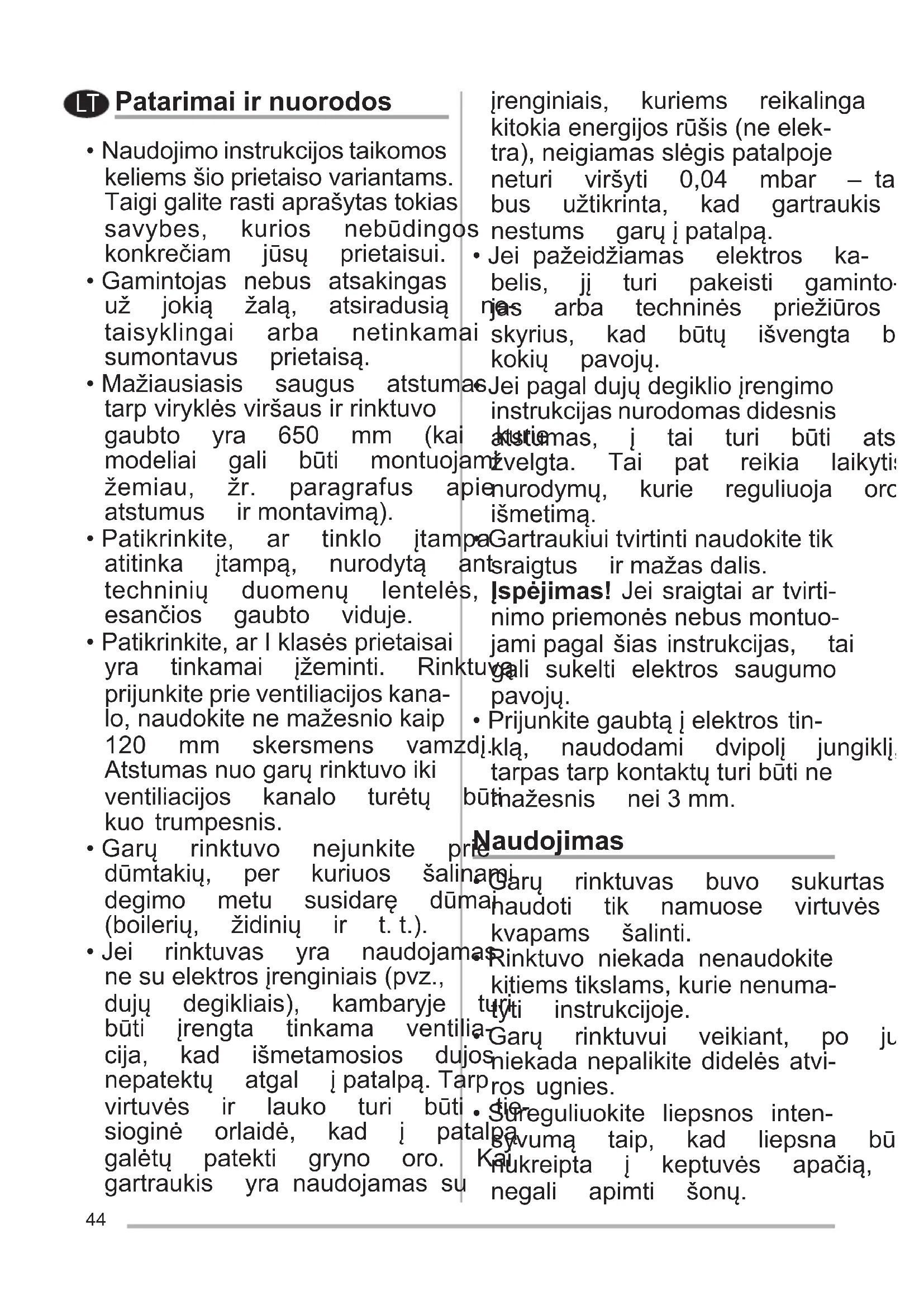 - Garų rinktuvo nejunkite prie dūmtakių, per kuriuos šalinami degimo metu susidarę dūmai (boilerių, židinių ir t.t.).