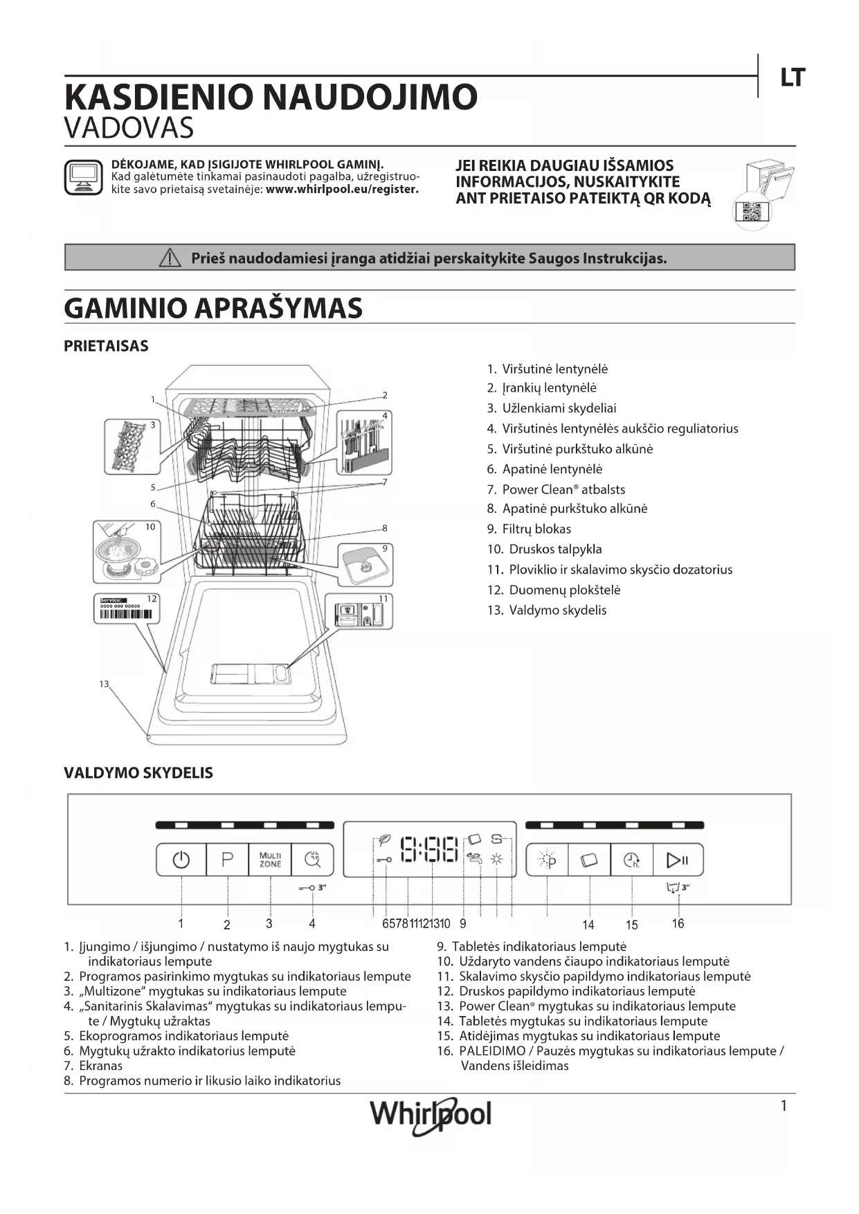 VALDYMO SKYDELIS1. Viršutinė lentynėlė2. Įrankių lentynėlė3. Užlenkiami skydeliai4. Viršutinės lentynėlės aukščio reguliatorius5. Viršutinė purkštuko alkūnė6. Apatinė lentynėlė 7. Power Clean® atbalsts8. Apatinė purkštuko alkūnė9. Filtrų blokas10. Druskos talpykla11. Ploviklio ir skalavimo skysčio dozatorius12. Duomenų plokštelė13. Valdymo skydelis1. Įjungimo / išjungimo / nustatymo iš naujo mygtukas su indikatoriaus lempute2. Programos pasirinkimo mygtukas su indikatoriaus lempute3. „Multizone“ mygtukas su indikatoriaus lempute4. „Sanitarinis Skalavimas“ mygtukas su indikatoriaus lempu-te / Mygtukų užraktas5. Ekoprogramos indikatoriaus lemputė6. Mygtukų užrakto indikatorius lemputė7. Ekranas8. Programos numerio ir likusio laiko indikatorius9. Tabletės indikatoriaus lemputė10. Uždaryto vandens čiaupo indikatoriaus lemputė11. Skalavimo skysčio papildymo indikatoriaus lemputė12. Druskos papildymo indikatoriaus lemputė13. Power Clean® mygtukas su indikatoriaus lempute14. Tabletės mygtukas su indikatoriaus lempute15. Atidėjimas mygtukas su indikatoriaus lempute16. PALEIDIMO / Pauzės mygtukas su indikatoriaus lempute / Vandens išleidimasDĖKOJAME, KAD ĮSIGIJOTE WHIRLPOOL GAMINĮ. Kad galėtumėte tinkamai pasinaudoti pagalba, užregistruo-kite savo prietaisą svetainėje: www.whirlpool.eu/register.JEI REIKIA DAUGIAU IŠSAMIOS INFORMACIJOS, NUSKAITYKITE ANT PRIETAISO PATEIKTĄ QR KODĄ