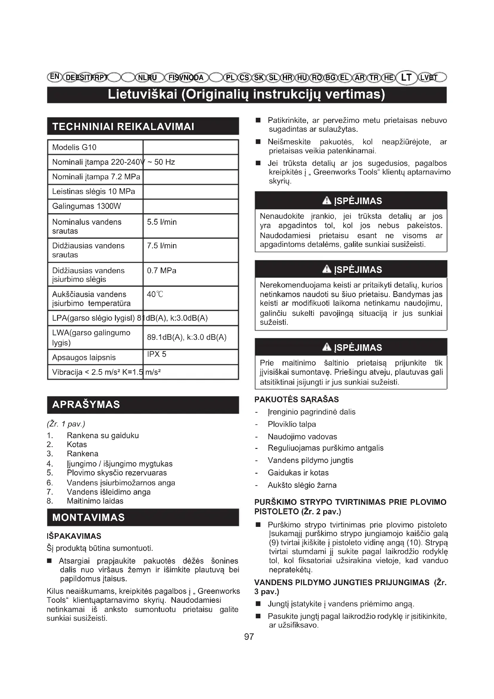 G10 - Aukšto slėgio plovykla GREENWORKS - Nemokama naudojimo instrukcija