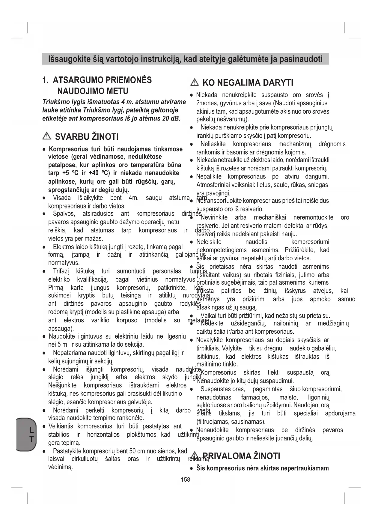 Kompresorius yra sukurtas naudoti sausose patalpose.Draudžiamakompresoriųnaudotivietose, kuriosegalibūtipurškiamasvanduo.