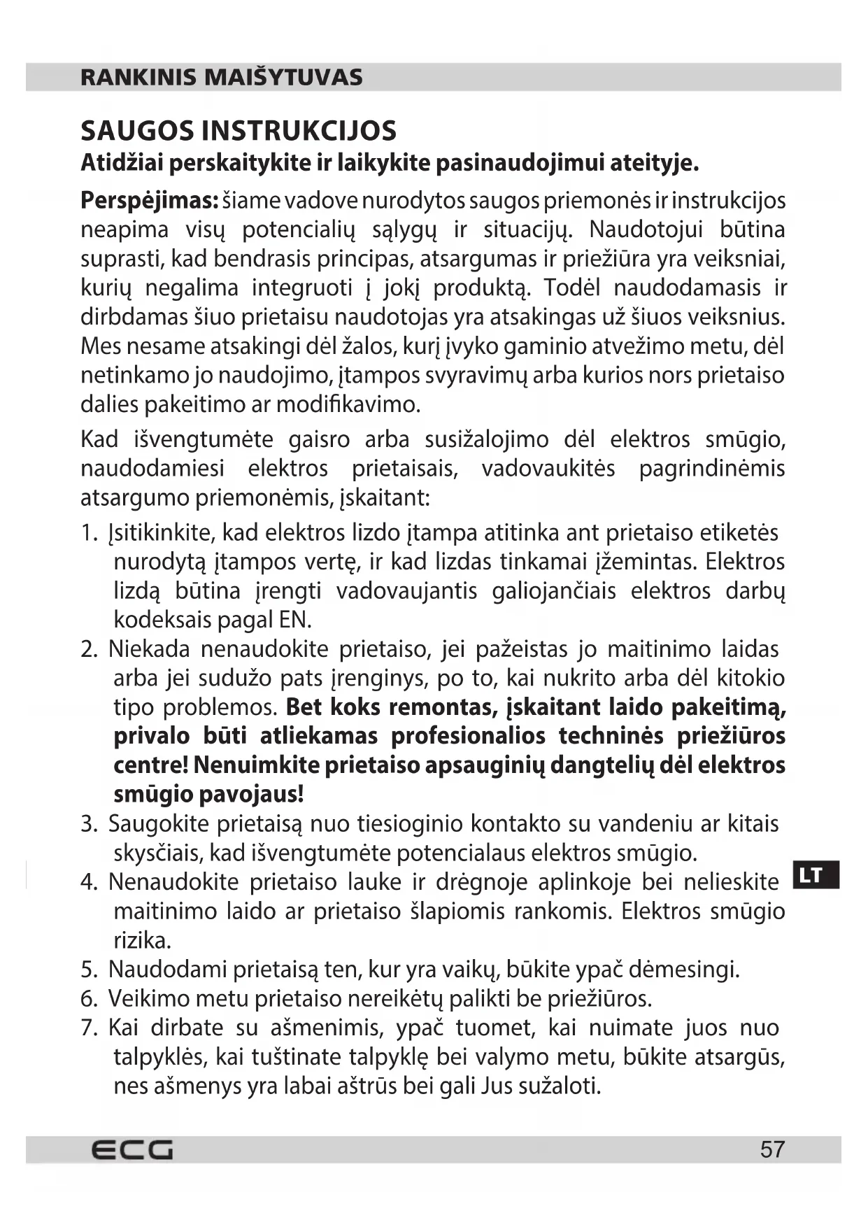 Elektros ir elektronikos dalių utilizavimas (taikoma ES valstybėse narėse ir kitose Europos šalyse, kur galioja atliekų perdirbimo sistema)Ant gaminio ar jo pakuotės atvaizduotas simbolis reiškia, kad gaminio negalima utilizuoti kartu su buitinėmis atliekomis. Nugabenkite gaminį įatitinkamą elektros ar elektronikos gaminių perdirbimo vietą. Utilizuodami gaminį imkitės saugos priemonių dėl neigiamo poveikio žmogaus sveikatai ir aplinkai.Perdirbimas prisideda prie gamtinių išteklių išsaugojimo. Daugiau informacijos apie šio gaminio perdirbimą, teiraukitės vietinės valdžios institucijose, buitinių atliekų perdirbimo organizacijose arba parduotuvėje, kur įsigijote šį gaminį. Šis produktas atitinka ES direktyvos dėl elektromagnetinio suderinamumo ir elektros saugos reikalavimus. Tekstas ir techniniai parametrai keičiami be išankstinio perspėjimo. 08/05LV ROKAS BLENDERIS