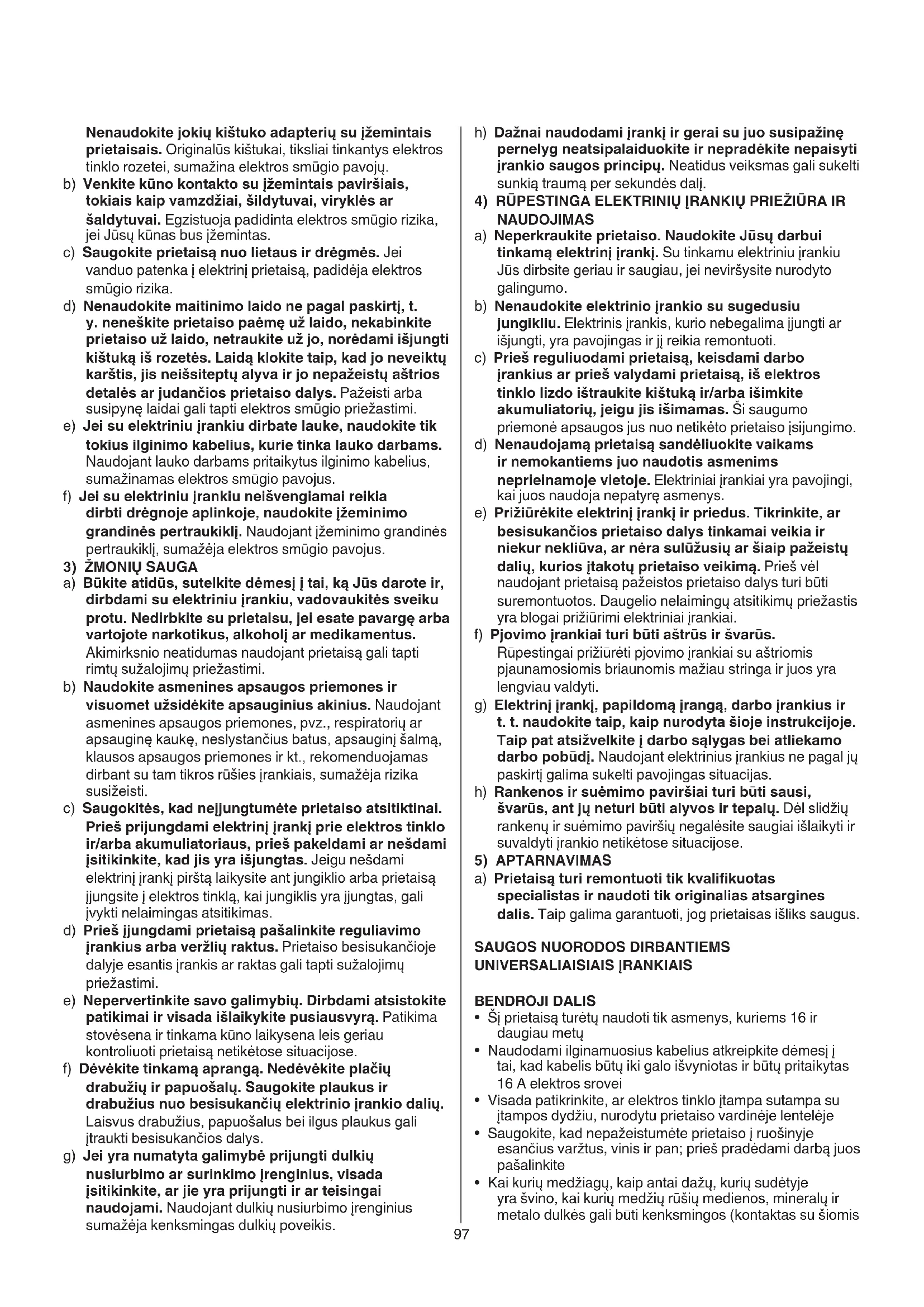 a) Būkite atidūs, sutelkite dėmesį į tai, ką Jūs darote ir, dirbdami su elektriniu įrankiu, vadovaukitės sveiku protu. Nedirbkite su prietaisu, jei esate pavargę arba vartojote narkotikus, alkoholį ar medikamentus. Akimirksnio neatidumas naudojant prietaisą gali tapti rimtų sužalojimų priežastimi. b) Naudokite asmenines apsaugos priemones ir visuomet užsidėkite apsauginius akinius. Naudojant asmenines apsaugos priemones, pvz., respiratorių ar apsauginę kaukę, neslystančius batus, apsauginį šalmą, klausos apsaugos priemones ir kt., rekomenduojamas dirbant su tam tikros rūšies įrankiais, sumažėja rizika susižeisti. c) Saugokitės, kad neįjungtumėte prietaiso atsitiktinai. Prieš prijungdami elektrinį įrankį prie elektros tinklo ir/arba akumuliatoriaus, prieš pakeldami ar nešdami įsitikinkite, kad jis yra išjungtas. Jeigu nešdami elektrinį įrankį pirštą laikysite ant jungiklio arba prietaisą įjungsite į elektros tinklą, kai jungiklis yra įjungtas, gali įvykti nelaimingas atsitikimas. d) Prieš įjungdami prietaisą pašalinkite reguliavimo įrankius arba veržlių raktus. Prietaiso besisukančioje dalyje esantis įrankis ar raktas gali tapti sužalojimų priežastimi. e) Nepervertinkite savo galimybių. Dirbdami atsistokite patikimai ir visada išlaikykite pusiausvyrą. Patikima stovėsena ir tinkama kūno laikysena leis geriau kontroliuoti prietaisą netikėtose situacijose. f) Dėvėkite tinkamą aprangą. Nedėvėkite plačių drabužių ir papuošalų. Saugokite plaukus ir drabužius nuo besisukančių elektrinio įrankio dalių. Laisvus drabužius, papuošalus bei ilgus plaukus gali įtraukti besisukančios dalys. g) Jei yra numatyta galimybė prijungti dulkių nusiurbimo ar surinkimo įrenginius, visada įsitikinkite, ar jie yra prijungti ir ar teisingai naudojami. Naudojant dulkių nusiurbimo įrenginius sumažėja kenksmingas dulkių poveikis.98