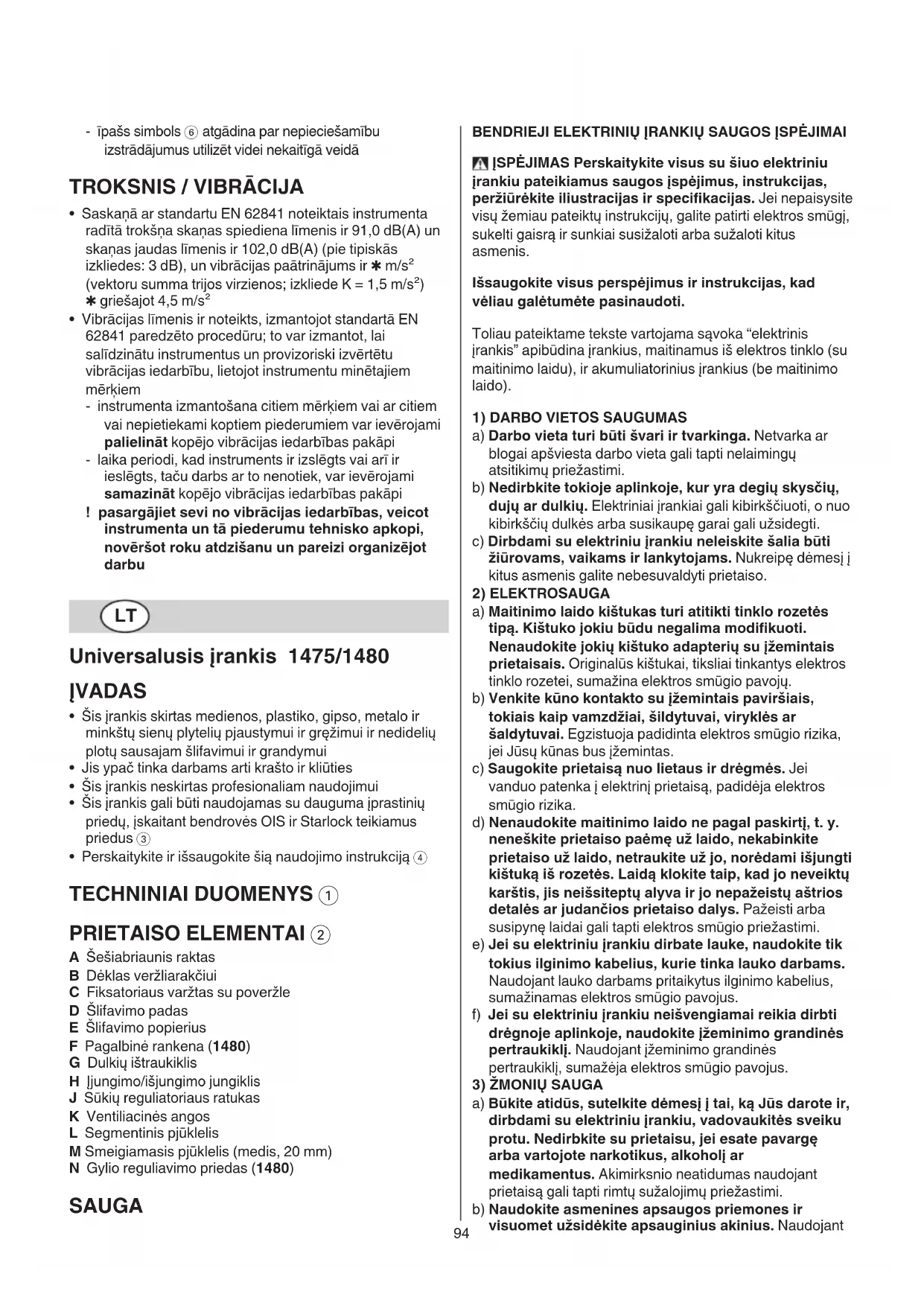 - Perskaitykite ir išsaugokite šią naudojimo instrukciją 4 TECHNINIAI DUOMENYS 1 PRIETAISO ELEMENTAI 2 A Šešiabriaunis raktas B Dėklas veržliarakčiui C Fiksatoriaus varžtas su poveržle D Šlifavimo padas E Šlifavimo popierius F Pagalbinė rankena (1480) G Dulkių ištraukiklis H Įjungimo/išjungimo jungiklis J Sūkių reguliatoriaus ratukas K Ventiliacinės angos L Segmentinis pjūklelis M Smeigiamasis pjūklelis (medis, 20 mm) N Gylio reguliavimo priedas (1480) SAUGA